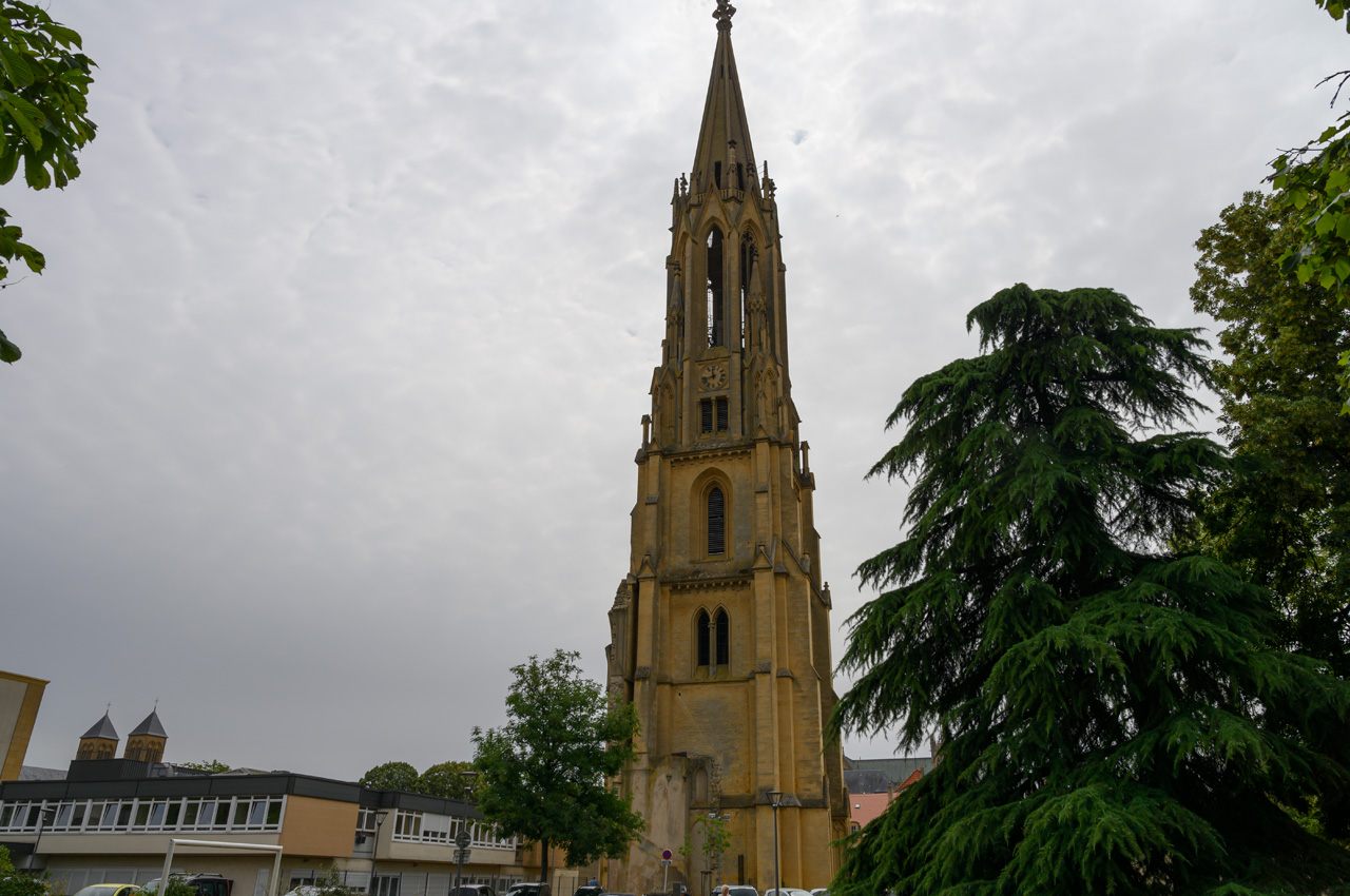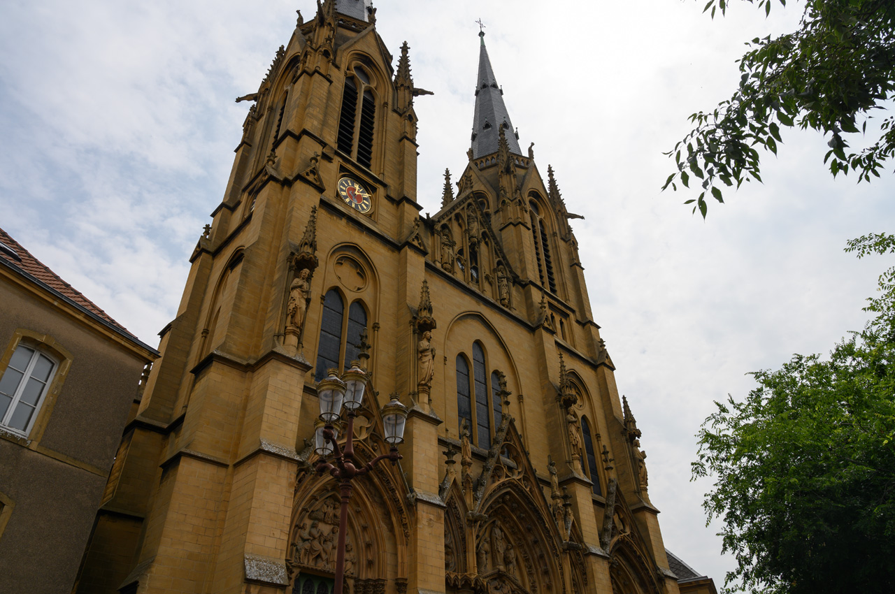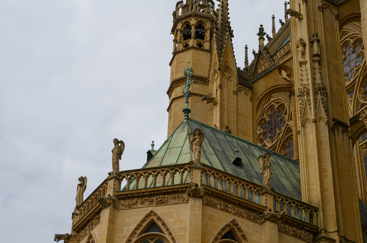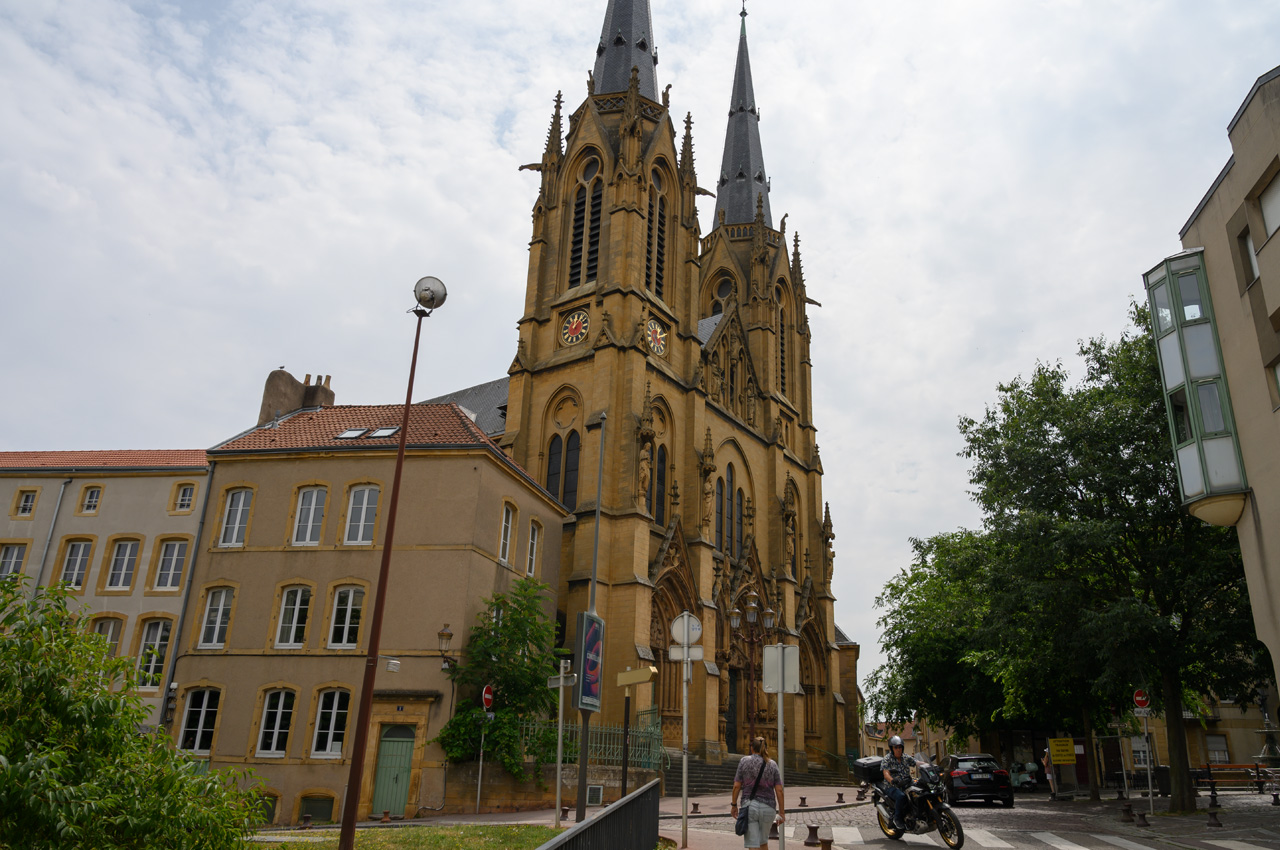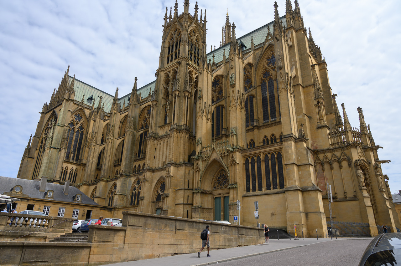 Gegen 11:30 Uhr sind wir in die Altstadt gelaufen, dieses mal in östlich Richtung. Die St. Vincent Basilica war verschlossen, genauso wie die Église Saint-Clément. Na wenigstens die Ruine der Eglise Saint Livier war zugänglich. Die Reste der Turmhalle sind schon komplett von Kletterpflanzen zugewachsen. Von hier aus sind wir entlang der Mosel zum Place d'Armes gelaufen, dem früheren Exerzierplatz. Hier steht die Kathedrale von Metz, die wir dann auch ausführlich besichtigt haben. Das Langhaus oder Mittelschiff ist mit seinen 42 Metern Raumhöhe, das höchste Kirchenschiff Europas. Generell aber ein sehr von den Regeln abweichender Baustil. Entsprechend ihres Alters, die ältesten Teile der Kirche gehen zurück bis in das 6. Jahrhundert, sind alle Baustile aus dieser Epoche vorhanden. Das Hauptzugangsportal führt direkt in das Langhaus und der Übergang von der Vierung zum Hochchor fehlt. Aber gerade vielleicht deswegen ein fesselndes Bauwerk. Von der Kathedrale aus sind wir durch die alten Gassen in Richtung Porte des Allemands (Deutsches Tor) gelaufen. Dabei ist uns aufgefallen, dass die eigentlich sehr schönen historischen Häuser, fast ausnahmslos in einem traurigen Zustand sind. Fenster, Türen und Fassaden, fehlt fast ausnahmslos ein Farbschutz. An ehemals kunstvoll verzierten Fassaden werden regellos Kabel angenagelt und diese dann herunterhängend einfach zusammengeführt, mir tut so etwas regelrecht weh. Eine Vergewaltigung und Respektlosigkeit den Erbauern und Handwerkern gegenüber. Alles schnell hingehauen, nichts gediegen und strukturiert. Ich kenne so etwas schon aus meinen Besuchen im Rahmen meiner Osramtätigkeit aus Italien. Zumindestens, die Stadt lebt und ist quirlig. Unterwegs hat Susanne bei einem der vielen Bäcker uns ein Brioche gekauft, eine absolut leckere Sache. Bevor wir das Porte des Allemands erreicht haben, konnten wir noch die kleine Kirche Église Saint-Maximin besichtigen, eine fast leere und schmucklose Kirche. Das Porte des Allemands ist ein bulliges Bauwerk, ein Stadttor mit Türmen und einer Brücke, die die Seille überspannt, ein kleiner Fluß, der schon ein paar hundert Meter weiter in die Mosel mündet. Erbaut wurde der Turm im 13. und 15. Jahrhundert als Bestandteil der Stadtbefestigung und einer großen Festungsanlage. Von hier aus ging es zur Église Saint-Eucaire, eine düstere Kirche, mit fast schwarzen Wänden, wobei uns nicht klar wurde, ob das Farbe oder Schmutz ist. Auf jeden Fall hatte sie noch einen Teil ihrer historischen Innenausstattung. Wieder zurück zum Place d'Armes sind wir jetzt auf dirktem Wege vorbei an Opéra-Théâtre de Metz zum Temple Neuf. Diese Kirche war allerdings verschlossen. Nun hatten wir nur noch wenige hundert Meter zum Womo. In der Zwischenzeit ist es auch schon wieder ziemlich warm geworden und so konnten wir die Luft und das bisschen Wind vor unserem Womo, unter der Markise, gut genießen.