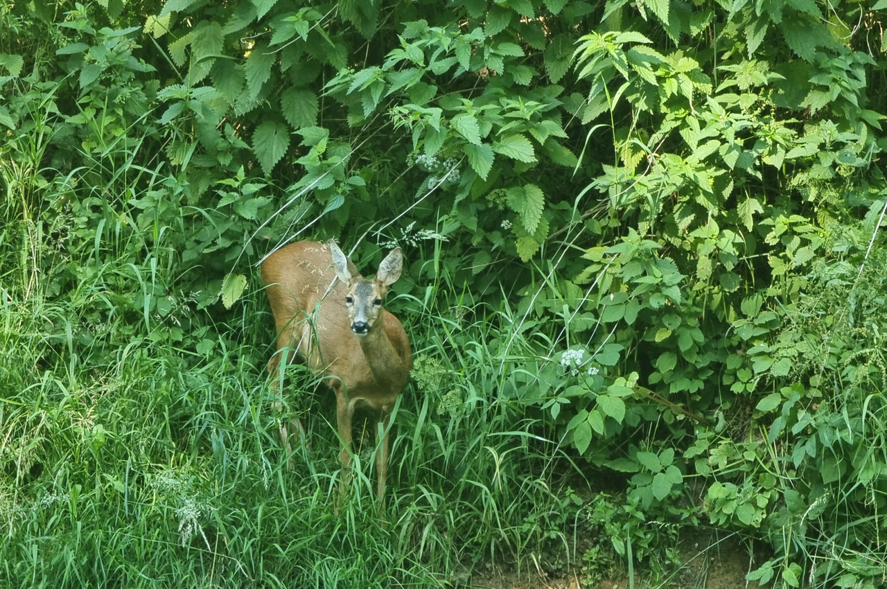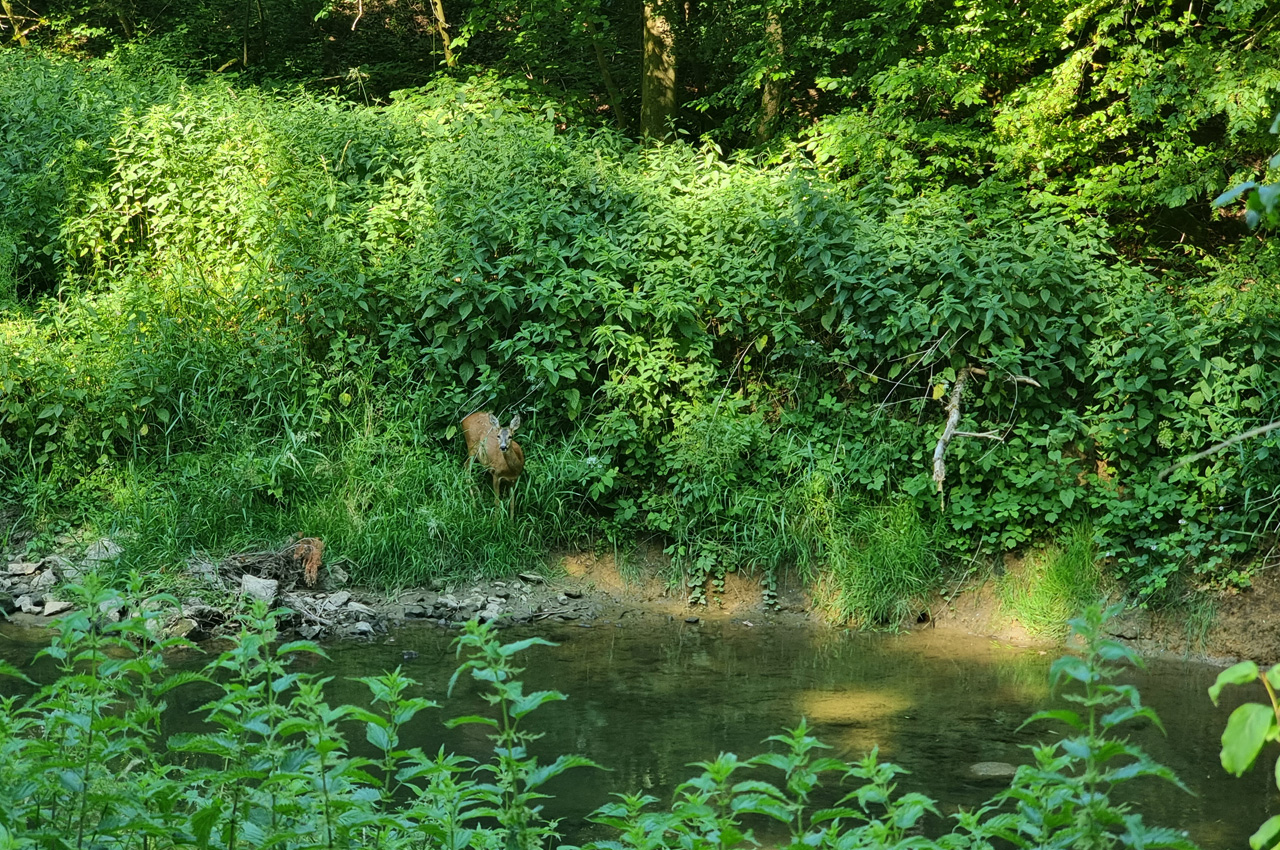 Nach dem Kaffeetrinken bin ich zu einer Wanderung aufgebrochen. Susanne ist am Womo geblieben, sie muss ihr Knie schonen und etwas Ruhe gönnen. Ich bin zum Ortskern von Hesperingen gelaufen und von da ab immer am rechten Ufer entlang der Alzette. Dort führt ein breiter Fahrradweg fast bis Luxemburg Stadt. Da die Alzette aber hier sehr breite Schlaufen macht ist es kein direkter Weg nach Luxemburg Stadt. Da würde einiges an Kilometer zusammen kommen. Ich habe darum an einer Straßenbrücke die Seite gewechselt und bin auf einem Wanderpfad am linken Ufer der Alzette wieder zurückgegangen. Unterwegs stand ein Reh am rechten Ufer. Das hat mich sehr gewundert, da das Ufer sehr steil war und fast komplett mit Büschen zugewachsen ist. Das Reh rührte sich nicht von der Stelle und so konnte ich in aller Ruhe Fotos machen. Leider nur mit dem Handy. ZUrück in dem Ort Hesperinge liegt zwischen dem Ort und dem Campingplatz ein großer Bürgerpark, relativ neu angelegt mit allem was die Freizeitgestaltung schöner macht. Das größte Kuriosum des Parks ist eine Fahrradwaschanlage. So etwas habe ich noch nirgend wo gesehen. Aber der Park ist wirklich sehr schön und würde so manchen Kurpark in Bäderorten in den Schatten stellen. Am Womo wieder angekommen hatte ich nun aber auch genug. Das Thermometer zeigte wieder 30°C an. Nicht schlecht, ich hatte nun mehr als 12.000 Schritte zusammen.