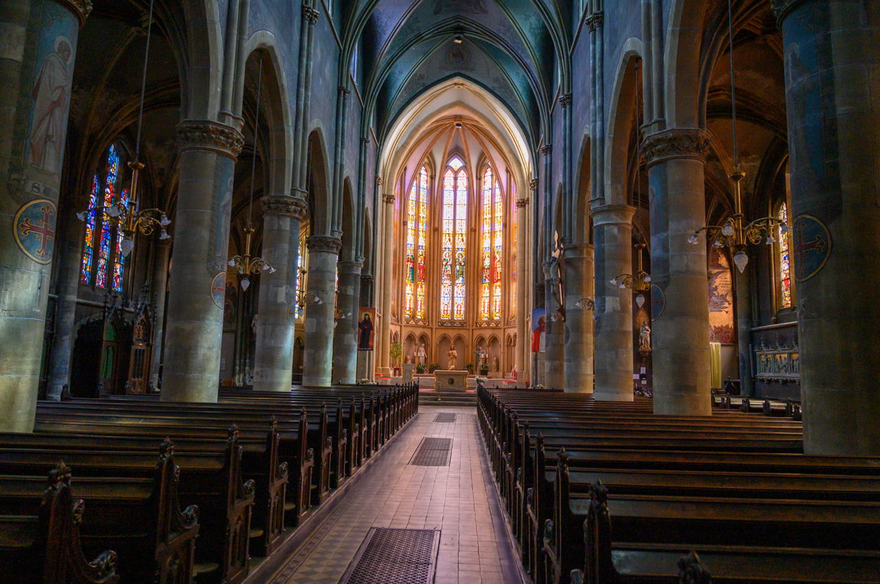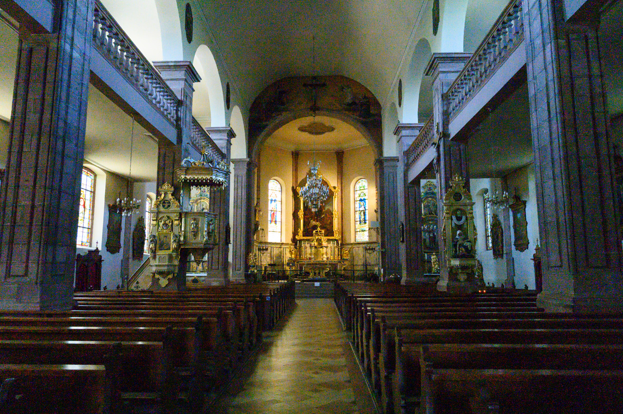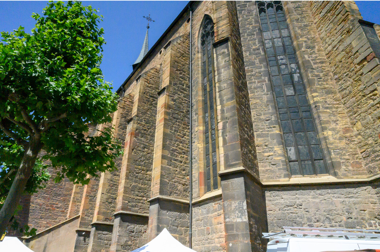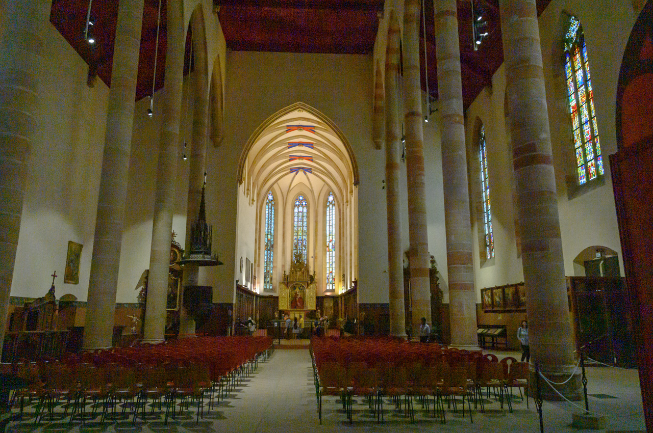 Die vorbestellten Brötchen vom Campingplatz waren lecker und der Preis mit 0,50€ ist auch Ok. Der Wetterbereicht schickte uns schon während des Frühstücks eine Unwetterwarnung nach der nächsten und Vorhersage für den Tag prognostizierte Regen und Gewitter. Wir haben uns davon nicht beeindrucken lassen und sind in die Innenstadt gelaufen. Es hatte sich abgekühlt und mit ca. 26°C und etwas frischem Wind, war es ganz angenehm. Aber schon als wir am Anfang der Innenstadt zwischen den Häusern waren, wurde es rapide wärmer. Jetzt zeigte das Thermometer auch schon wieder 29°C und es wehte auch kein Wind mehr. Dafür fing es aber einige hundert Meter weiter an zu regnen. Wir haben uns kurz untergestellt. Wir sind danach die Fußgängerzone der Fleischstraße entlang bis zum Hauptmarkt gegangen, eine der Ecken von Trier, wo die historischen Gebäude am dichtesten stehen. Hier war es gerade sehr laut, weil man für das anstehende Altstadtfest gerade eine Bühne und diverese Buden aufbaut. Wir sind nach einem Rundgang über den Platz direkt weiter zum Dom gegangen. Obwohl wir den Dom ja schon in 2022 besichtigt hatten, er ist immer wieder einen Besuch wert. Vereinen sich hier doch aus mehr als tausend Jahre Geschichte, fast alle Baustile die es in dieser Zeit gab. Immerhin ist der Dom die älteste Bischofskirche nördlich der Alpen. In vielen Bereichen sieht man auch noch die architektonische Handschrift der Römer. Die direkt angrenzende Liebfrauenkirche war leider nicht zugänglich, weil dort gerade ein Gottesdienst statt fand. Nicht weit vom Dom entfernt, zugänglich zwischen Häusern vom großen Markt befindet sich die St.-Gangolf-Kirche. Bei unserem Besuch in 2022 war sie wegen Restaurierungsarbeiten nicht zugänglich. Dieses mal durften wir uns die Kirche auch von innen ansehen! Sie ist ein krasses Gegenstück zum Dom. Klar von der Architektur und mit einer sehr schlichten Ausstattung. In dem nördlichen Seitenschiff gibt es eine sehr sehenswerte Rippengewölbedecke mit sehr schönen Stuckarbeiten. Wir sind die Fußgängerzone weiter gelaufen bis zur Porta Nigra. Dieses mal habe ich mich damit begnügt, sie mir nur von außen anzusehen. Susanne war auch voriges Jahr nicht mit im Inneren, da man da sehr viele Treppen laufen muss. Beim dritten Anlauf, ein für uns passendes Eiskaffee zu finden, waren wir dann erfolgreich. Die Hitze war in der Zwischenzeit auch schon wieder ziemlich unerträglich geworden. Es liegt wohl auch an der hohen Luftfeuchtigkeit. Dieses mal gab es eine richtige Eisportion im Sitzen. Danach haben wir uns aus dem ALDI noch einige Lebensmittel, inklusive frischem Brot, besorgt. Unser Relaxen vor dem Womo ging nicht sehr lange, dann alamierte uns ein schwarzer Himmel und düstere Gewittergrollen. Fast dachten wir schon wir haben zu schnell alles eingeräumt, aber dann ging es blitzschnell und wir hatten schon Mühe alle Luken zu schließen ohne nass zu werden, geschweige, wenn wir noch die Campingmöbel hätten wegräumen müssen. Allerdings hielt sich das Gewitter in normalen Grenzen. Gegen Abend hat es sich dann aber merklich abgekühlt, was ja nicht unbedingt negativ ist.