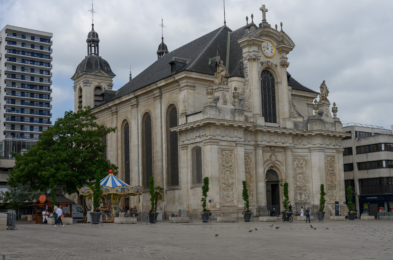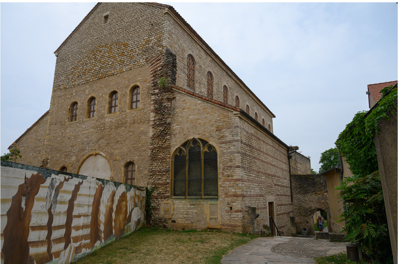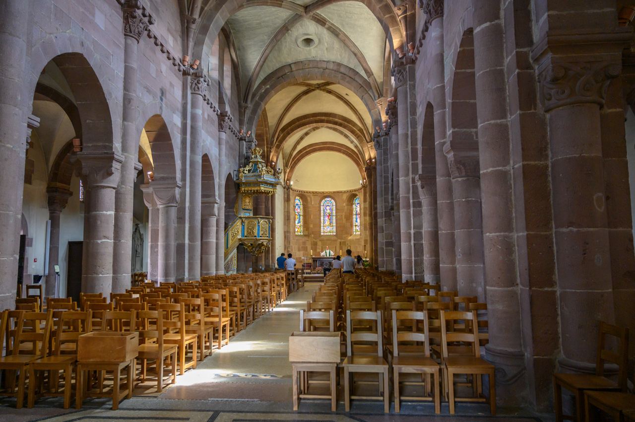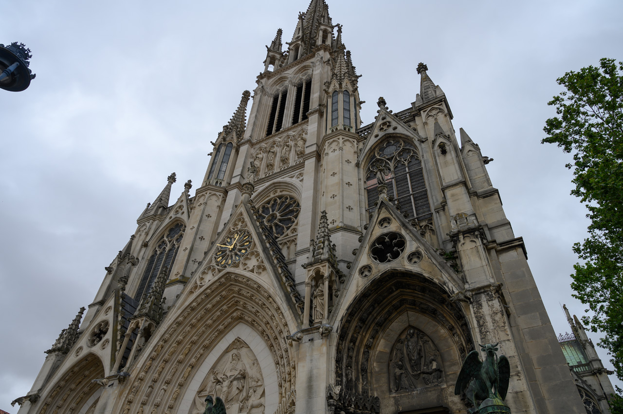 Auch heute lag das Baguett in der Gaststätte schon wieder für uns bereit und damit war das Frühstück schon mal gesichert. Wieder gegen 11:30 Uhr sind wir zur nächsten Stadtrunde aufgebrochen. Leider hatte ich gestern die Runde nicht so gut vorbereitet. So mussten wir heute noch mals mit dem gleichen Weg starten. Hinter der Moselüberquerung ging es dann aber nicht rechts herum sondern geradewegs auf den Berg. Nämlich ganz auf dem Berg steht die zweitgrößte Kirche von Metz, die Ste-Ségolène. Sie war sogar geöffnet, also stand einer Besichtigung nichts im Wege. Auch sie ist im Inneren extrem düster, lediglich der Chor ist durch die Buntglasfenster relativ hell. Sie hat auch über der Westempore ein großes Fenster was auch die Orgel teilt, was wir gestern schon mal in der Église Saint-Eucaire gesehen haben. Die Decken- und Stützpfeilerbemalung lässt darauf schließen, dass die Wände und Rippengewölbe der Kirche nicht immer fast schwarz waren, sondern wesentlich heller. Ansonsten hat die Kirche einen sehr schönen Chor mit sehenswertem Hauptaltar. Die Vierung hebt sich kaum vom Längs- bzw. Querschiff ab. Weiter ging es nun zum ehemaligen Kloster der Rekollekten in Metz (Cloître des Récollets). Hier gibt es noch den Kreuzgang und einen intakten Kräutergarten. Von hier aus ging es nun quer durch die Altstadt vorbei am Pl. Saint-Jacques zum Place de la République de Metz. Vorher hat uns Susanne aber noch bei dem Bäcker den wir schon gestern genutzt haben, zwei Brioches besorgt. Das von gestern war so lecker, dass wir heute für jeden von uns ein Brioche gekauft haben. Gleich neben dem Place de la République de Metz, gibt es eine Parkanlage mit Springbrunnen. Dort haben wir uns eine freie Bank im Schatten gekapert und haben unseren Brioch genossen. Das ist wirklich ein extrem leckeres Gebäck. Susanne will das mal zu Hause selber machen. Am westlichen Ende des Parkes fällt das Gelände zur Mosel hin stark ab. Auf einer ersten Zwischenetage gibt es eine Grottenanlage mit Wasserfontänen davor. Ein sehr schöner Anblick, eine romantische Ecke. Etwas bergauf ging es nun weiter zur St-Pierre-aux-Nonnains, eine ehemalige Abteikirche. Leider ist die Kirche vom 27. bis 30.06. geschlossen, also für uns keine Innenbesichtigung möglich. Schade, die Kirche soll sehr schön sein. Jetzt sind wir wieder zurück zum Pl. Saint-Jacques gelaufen, durch Teile der Fußgängerzone, weil an diesem Platz der Bäcker mit dem leckeren Kuchen ist, den wir uns da schon beim ersten Stadtspaziergang gekauft hatten. Als wir vorhin hier vorbei kamen, stand draußen eine lange Schlange an. Jetzt waren nur zwei Leute vor uns. Wir sind quer über den Platz gelaufen mit unserem Kuchen und sind noch einmal in die Markthalle gegangen. Da wir heute Abend noch einmal grillen wollen, haben wir uns noch frische Sachen für den Salat dazu geholt. Da gibt es einen Obst- und Gemüsestand, der seine ausgelegte Ware bedampft, damit sie frisch bleibt. Das sieht auch alles richtig appetitlich aus. Von hier aus ging es nun ohne schuldhaftes Verzögern zurück zum Womo. Dort haben wir wieder die Markise ausgefahren und es uns vor dem Womo gemütlich gemacht. Obwohl der Himmel bewölkt war, hatten wir schon wieder 25°C. Wir haben ein Stück von dem leckeren Kuchen gegessen, ein Eclair, gefüllt mit Moccacreme und oben drauf noch Cremetupfer und Verzierung. Ausgesprochen lecker, das ist wirklich etwa Besonderes.