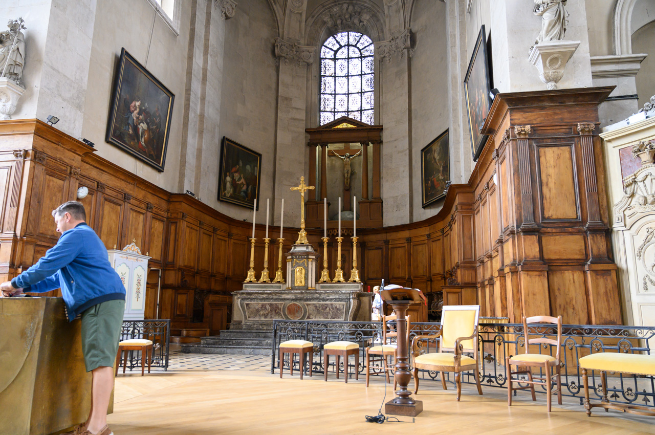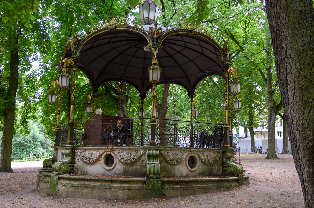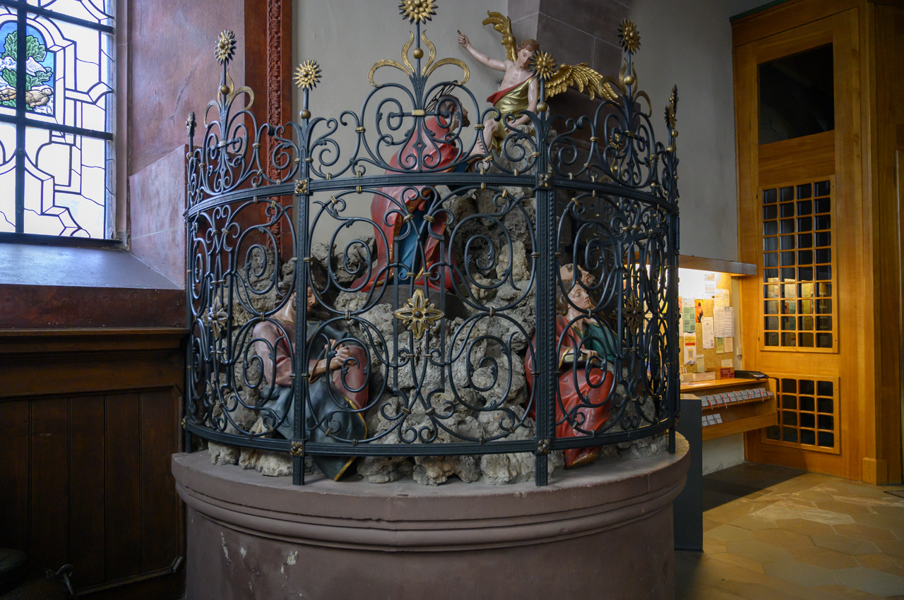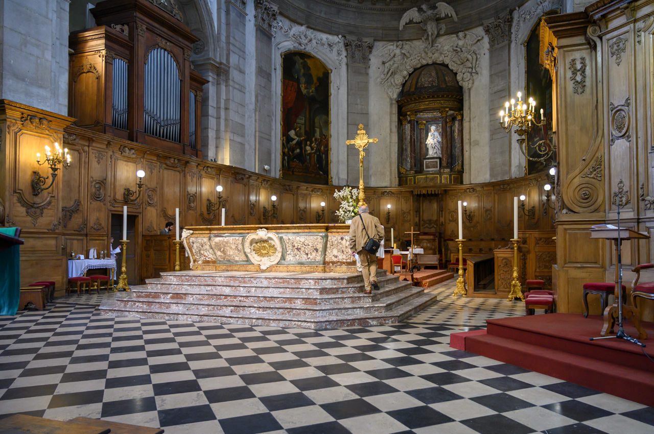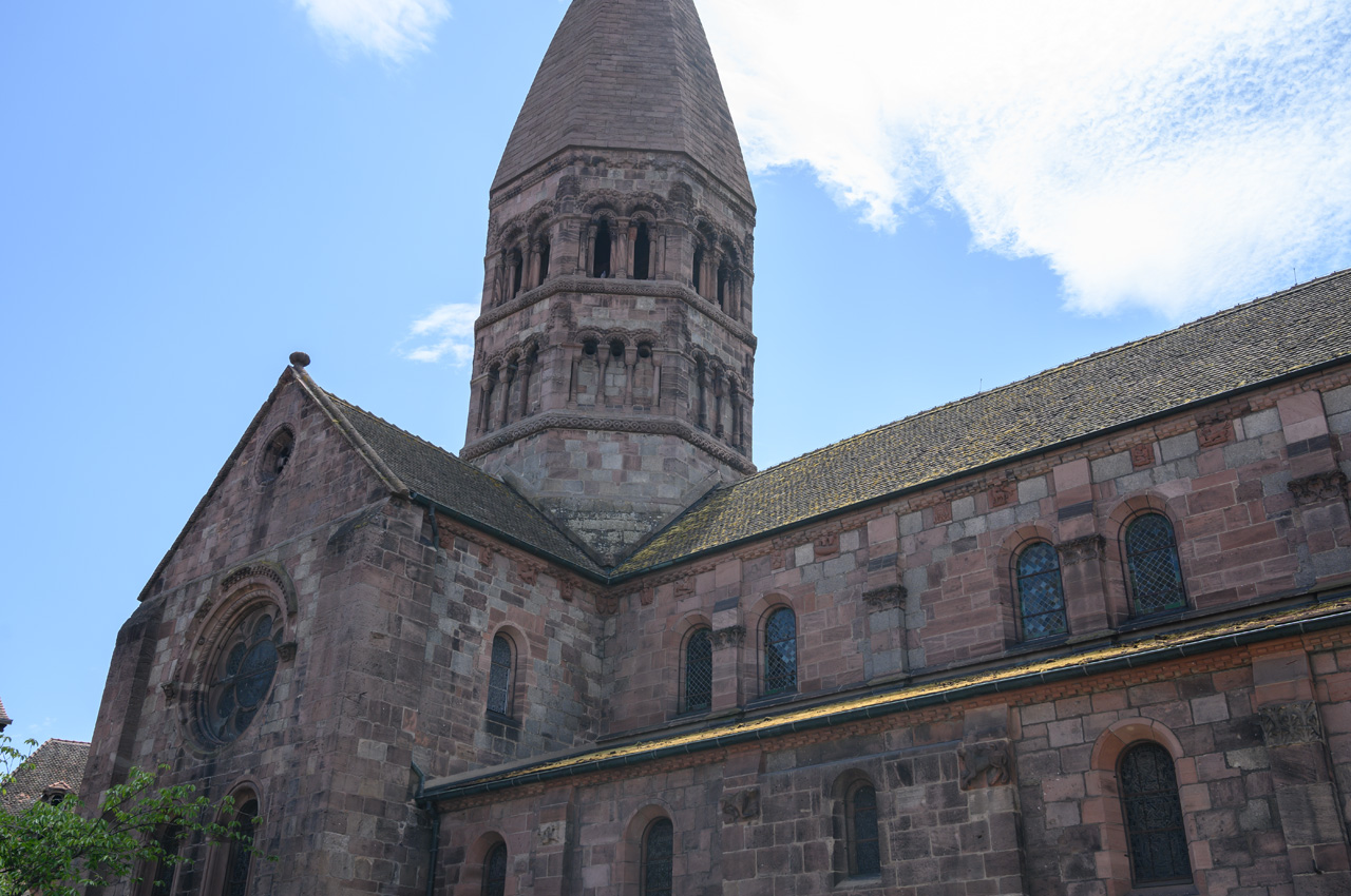 Auch heute lag das Baguett in der Gaststätte schon wieder für uns bereit und damit war das Frühstück schon mal gesichert. Wieder gegen 11:30 Uhr sind wir zur nächsten Stadtrunde aufgebrochen. Leider hatte ich gestern die Runde nicht so gut vorbereitet. So mussten wir heute noch mals mit dem gleichen Weg starten. Hinter der Moselüberquerung ging es dann aber nicht rechts herum sondern geradewegs auf den Berg. Nämlich ganz auf dem Berg steht die zweitgrößte Kirche von Metz, die Ste-Ségolène. Sie war sogar geöffnet, also stand einer Besichtigung nichts im Wege. Auch sie ist im Inneren extrem düster, lediglich der Chor ist durch die Buntglasfenster relativ hell. Sie hat auch über der Westempore ein großes Fenster was auch die Orgel teilt, was wir gestern schon mal in der Église Saint-Eucaire gesehen haben. Die Decken- und Stützpfeilerbemalung lässt darauf schließen, dass die Wände und Rippengewölbe der Kirche nicht immer fast schwarz waren, sondern wesentlich heller. Ansonsten hat die Kirche einen sehr schönen Chor mit sehenswertem Hauptaltar. Die Vierung hebt sich kaum vom Längs- bzw. Querschiff ab. Weiter ging es nun zum ehemaligen Kloster der Rekollekten in Metz (Cloître des Récollets). Hier gibt es noch den Kreuzgang und einen intakten Kräutergarten. Von hier aus ging es nun quer durch die Altstadt vorbei am Pl. Saint-Jacques zum Place de la République de Metz. Vorher hat uns Susanne aber noch bei dem Bäcker den wir schon gestern genutzt haben, zwei Brioches besorgt. Das von gestern war so lecker, dass wir heute für jeden von uns ein Brioche gekauft haben. Gleich neben dem Place de la République de Metz, gibt es eine Parkanlage mit Springbrunnen. Dort haben wir uns eine freie Bank im Schatten gekapert und haben unseren Brioch genossen. Das ist wirklich ein extrem leckeres Gebäck. Susanne will das mal zu Hause selber machen. Am westlichen Ende des Parkes fällt das Gelände zur Mosel hin stark ab. Auf einer ersten Zwischenetage gibt es eine Grottenanlage mit Wasserfontänen davor. Ein sehr schöner Anblick, eine romantische Ecke. Etwas bergauf ging es nun weiter zur St-Pierre-aux-Nonnains, eine ehemalige Abteikirche. Leider ist die Kirche vom 27. bis 30.06. geschlossen, also für uns keine Innenbesichtigung möglich. Schade, die Kirche soll sehr schön sein. Jetzt sind wir wieder zurück zum Pl. Saint-Jacques gelaufen, durch Teile der Fußgängerzone, weil an diesem Platz der Bäcker mit dem leckeren Kuchen ist, den wir uns da schon beim ersten Stadtspaziergang gekauft hatten. Als wir vorhin hier vorbei kamen, stand draußen eine lange Schlange an. Jetzt waren nur zwei Leute vor uns. Wir sind quer über den Platz gelaufen mit unserem Kuchen und sind noch einmal in die Markthalle gegangen. Da wir heute Abend noch einmal grillen wollen, haben wir uns noch frische Sachen für den Salat dazu geholt. Da gibt es einen Obst- und Gemüsestand, der seine ausgelegte Ware bedampft, damit sie frisch bleibt. Das sieht auch alles richtig appetitlich aus. Von hier aus ging es nun ohne schuldhaftes Verzögern zurück zum Womo. Dort haben wir wieder die Markise ausgefahren und es uns vor dem Womo gemütlich gemacht. Obwohl der Himmel bewölkt war, hatten wir schon wieder 25°C. Wir haben ein Stück von dem leckeren Kuchen gegessen, ein Eclair, gefüllt mit Moccacreme und oben drauf noch Cremetupfer und Verzierung. Ausgesprochen lecker, das ist wirklich etwa Besonderes.