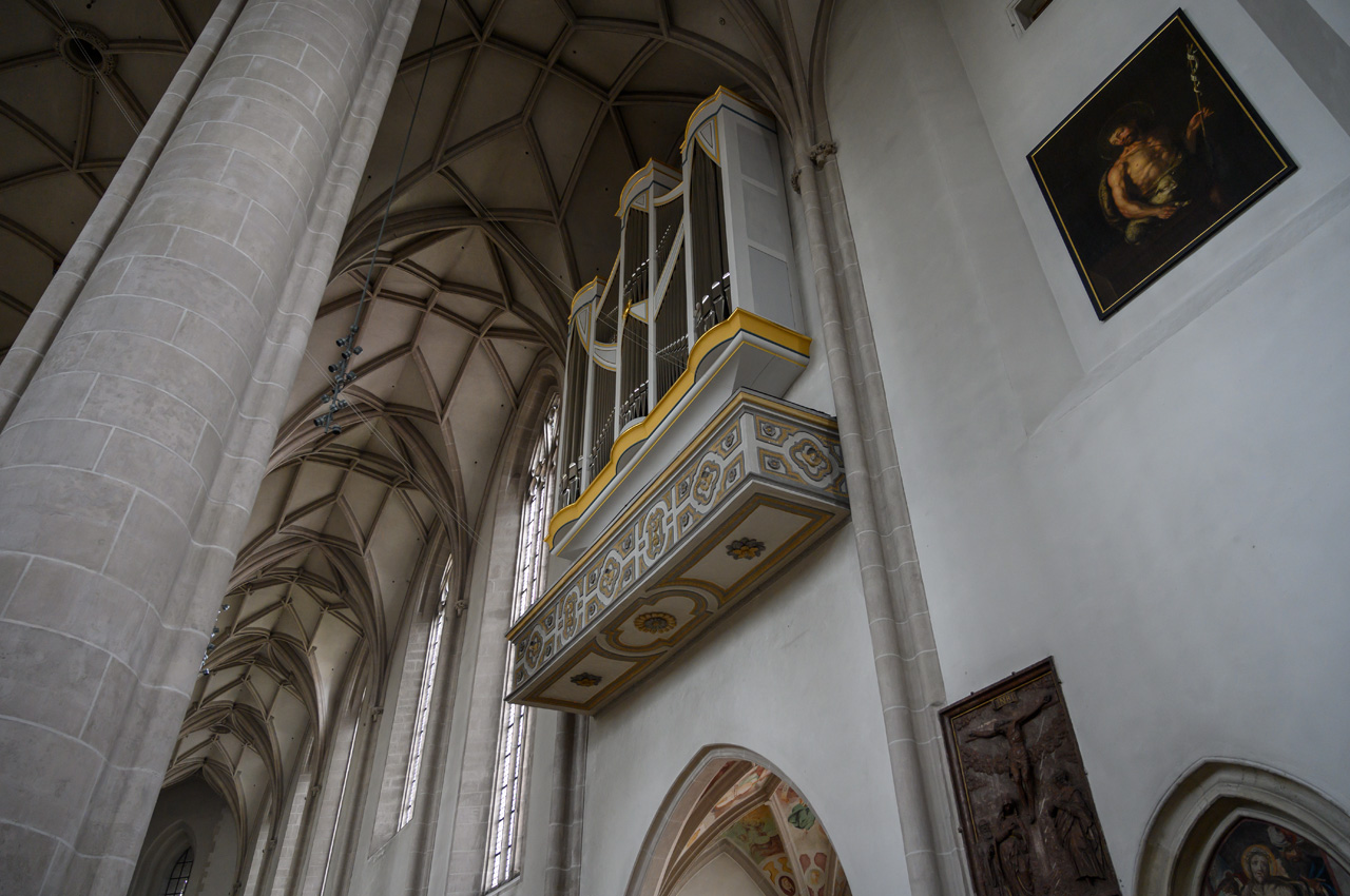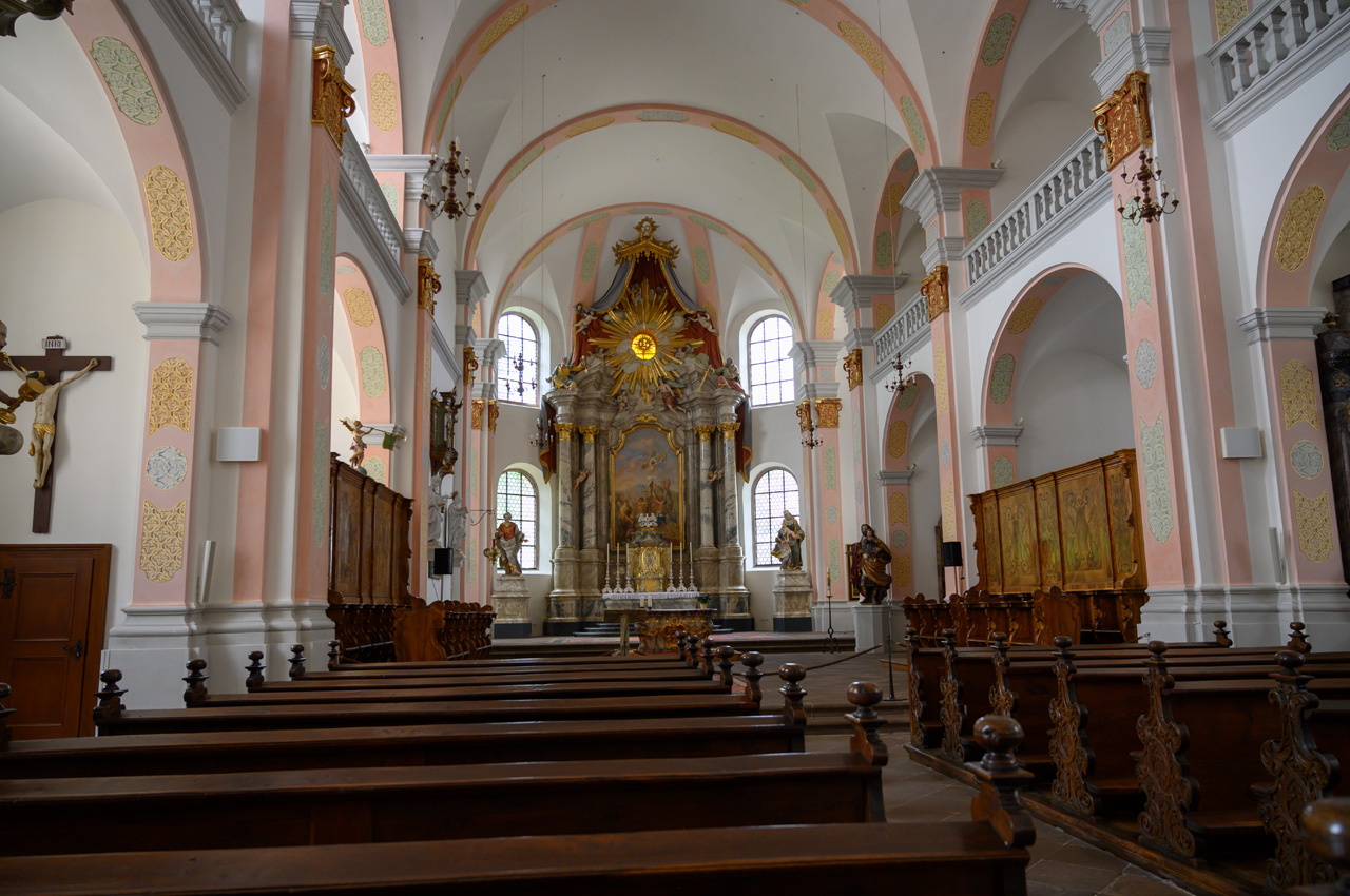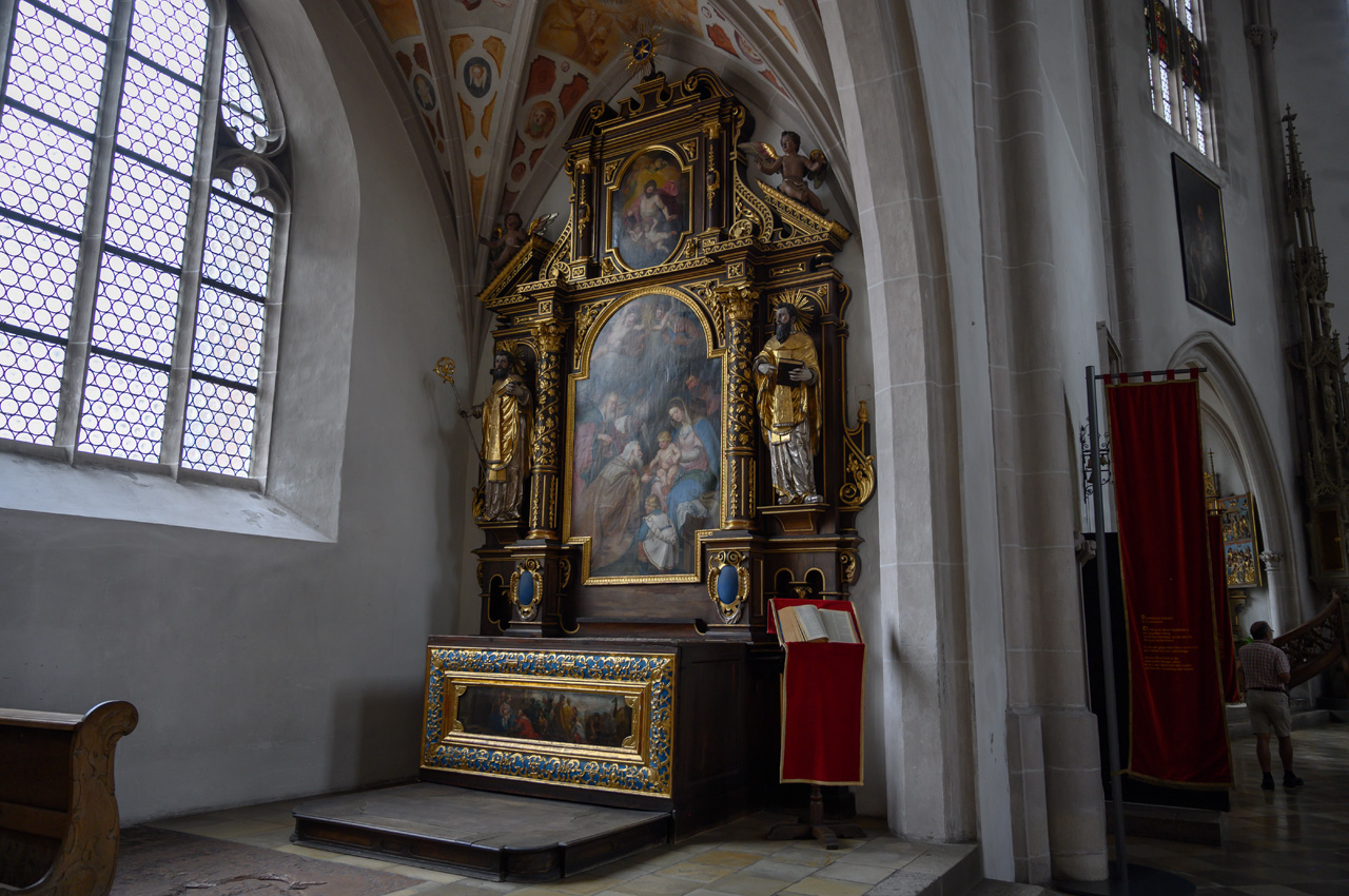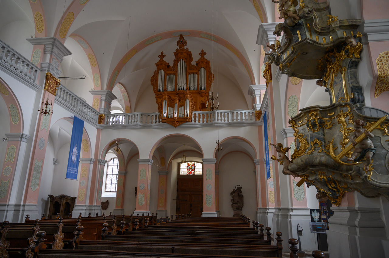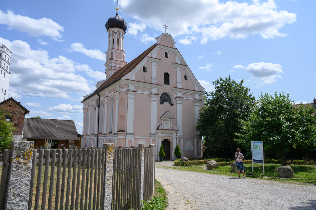 Nach einem Zwischenkaffee sind wir auf unseren NIU gestiegen und zur Burg Markt gefahren. Die letzten 1,5 Kilometer führten über einen Schotterweg und der war dann 200 Meter vor dem Burggelände als Privatweg deklariert und für Kraftfahrzeuge gesperrt. Die gesamte Burganlage ist eigentlich Privatgelände eines Reiterhofes, obwohl auf dem Gelände auch noch die Schlosskapelle steht, in der ja auch noch Gottesdienste stattfinden. Zu besichtigen ist die Kirche nur nach Terminvereinbarung mit der Pfarrei vom Ort Markt. Nach einem kleinen Plausch mit zwei elusteren Frauen, die nur mit Rucksack unterwegs sind, sind wir weiter nach Biberbach gefahren. Die St. Jakobus, St. Laurentius und Hl. Kreuz Kirche dort war leider komplett eingerüstet. Sie war trotzdem offen, aber auch innen leider komplett eingerüstet. Trotzdem konnte man erahnen, dass es sich bei ihr auch um eine sehenswerte Kirche handelt. Sie hat ebenfalls einen Barockaltar und sehr dekorative Seitenaltäre. Ungewöhnlich war das Fehlen einer Orgel auf der Empore. Ich bin darum auf die Empore hochgegangen, weil ich dachte die haben die Orgel wegen der Restaurierungsarbeiten ausgebaut. Die Empore hat aber komplett eine Bestuhlung.
