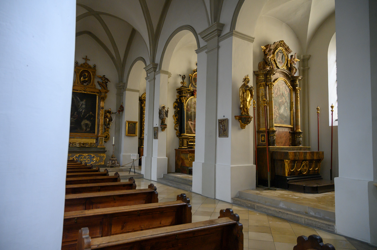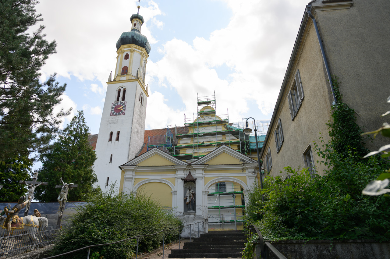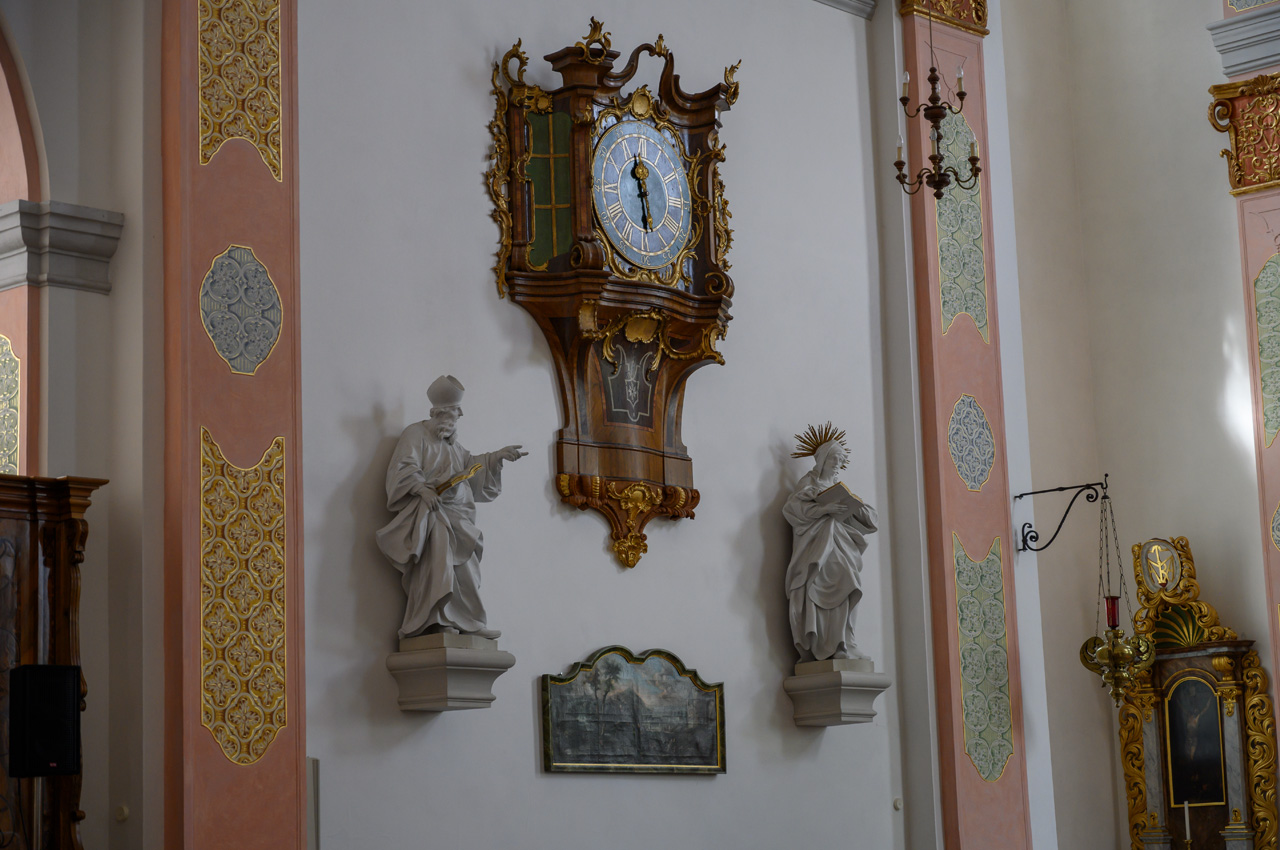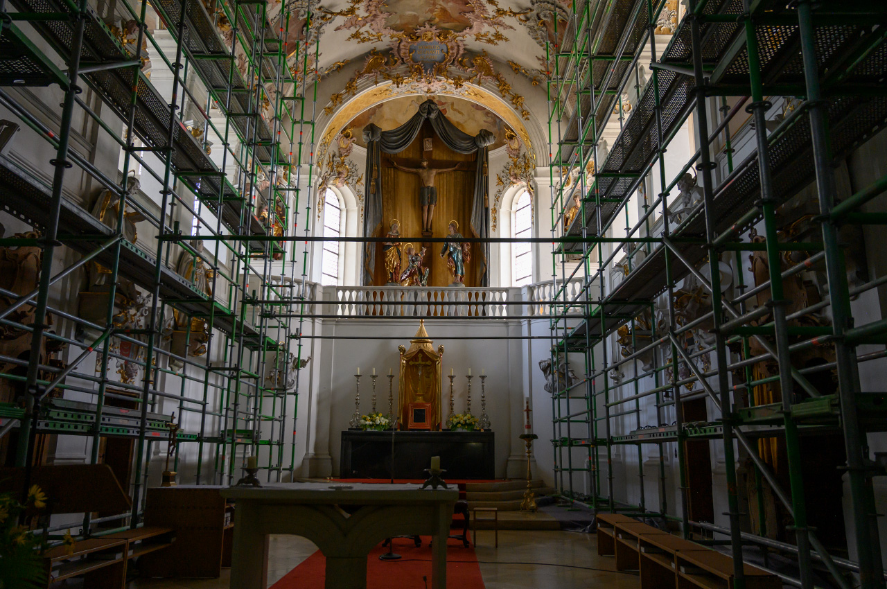 Nach einem Zwischenkaffee sind wir auf unseren NIU gestiegen und zur Burg Markt gefahren. Die letzten 1,5 Kilometer führten über einen Schotterweg und der war dann 200 Meter vor dem Burggelände als Privatweg deklariert und für Kraftfahrzeuge gesperrt. Die gesamte Burganlage ist eigentlich Privatgelände eines Reiterhofes, obwohl auf dem Gelände auch noch die Schlosskapelle steht, in der ja auch noch Gottesdienste stattfinden. Zu besichtigen ist die Kirche nur nach Terminvereinbarung mit der Pfarrei vom Ort Markt. Nach einem kleinen Plausch mit zwei elusteren Frauen, die nur mit Rucksack unterwegs sind, sind wir weiter nach Biberbach gefahren. Die St. Jakobus, St. Laurentius und Hl. Kreuz Kirche dort war leider komplett eingerüstet. Sie war trotzdem offen, aber auch innen leider komplett eingerüstet. Trotzdem konnte man erahnen, dass es sich bei ihr auch um eine sehenswerte Kirche handelt. Sie hat ebenfalls einen Barockaltar und sehr dekorative Seitenaltäre. Ungewöhnlich war das Fehlen einer Orgel auf der Empore. Ich bin darum auf die Empore hochgegangen, weil ich dachte die haben die Orgel wegen der Restaurierungsarbeiten ausgebaut. Die Empore hat aber komplett eine Bestuhlung.