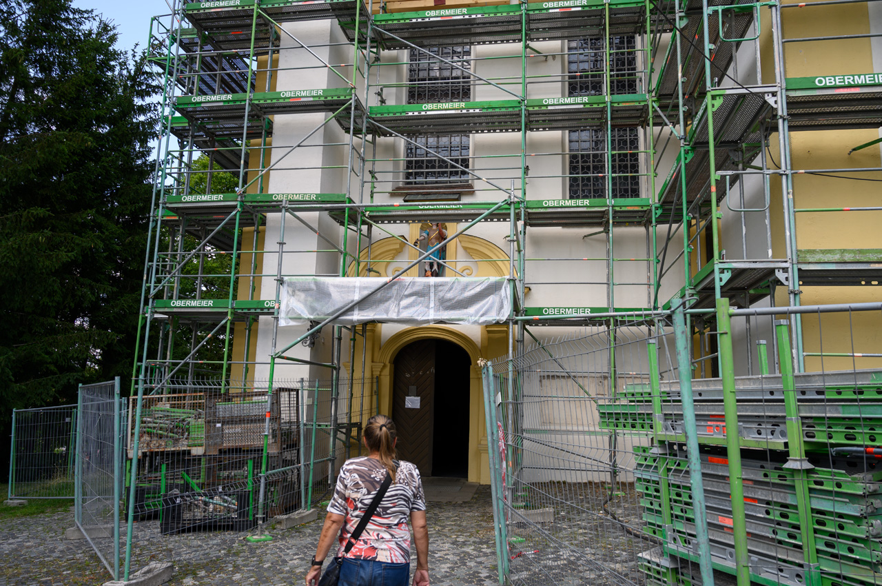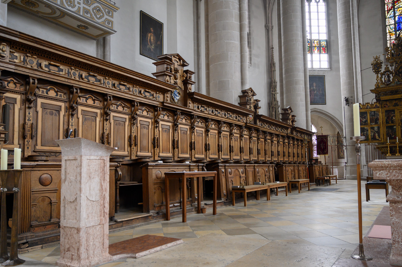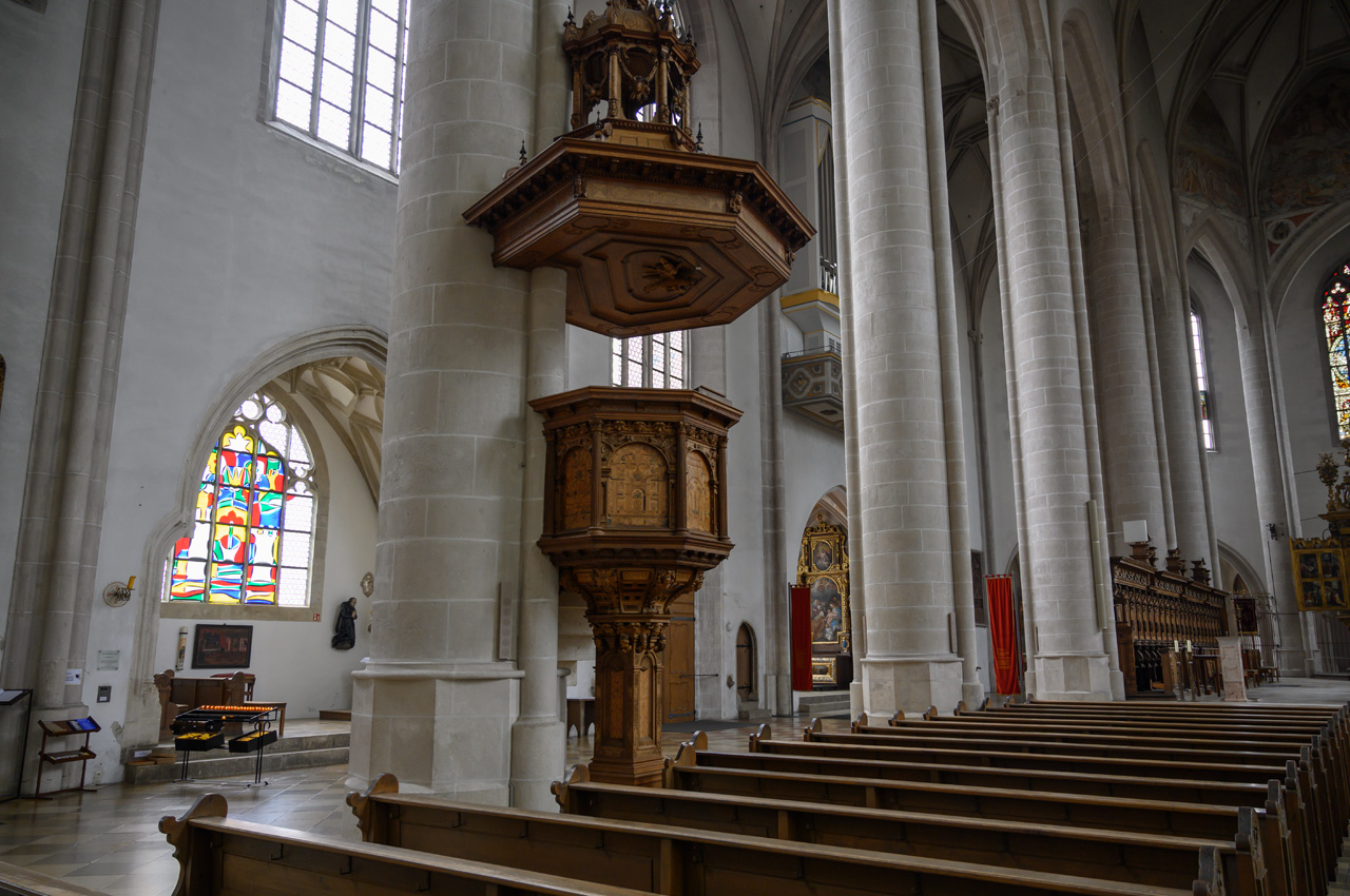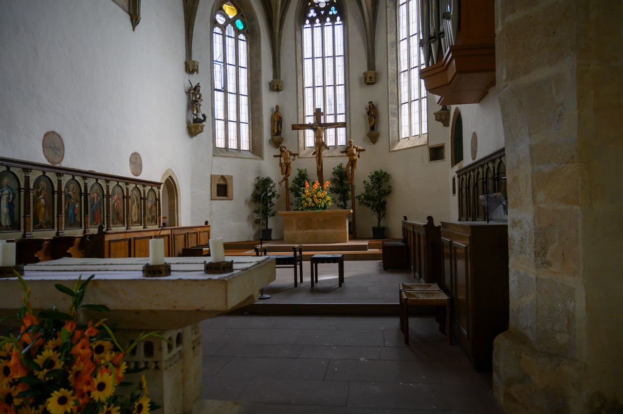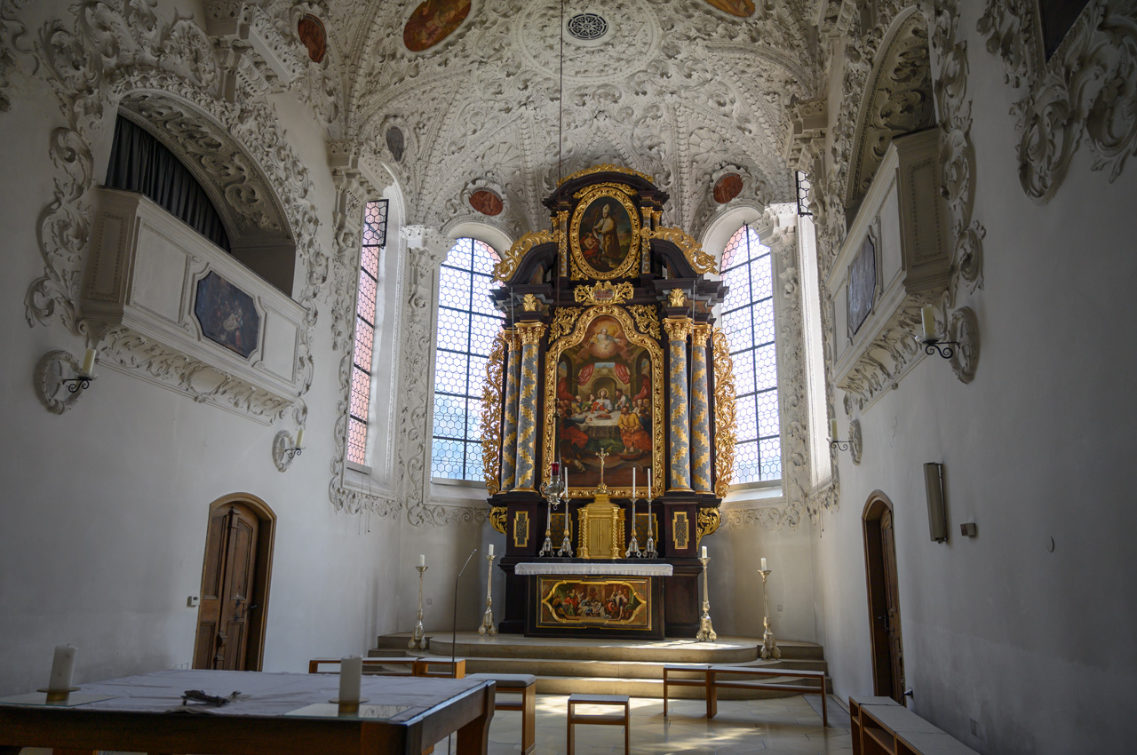 Nach einem Zwischenkaffee sind wir auf unseren NIU gestiegen und zur Burg Markt gefahren. Die letzten 1,5 Kilometer führten über einen Schotterweg und der war dann 200 Meter vor dem Burggelände als Privatweg deklariert und für Kraftfahrzeuge gesperrt. Die gesamte Burganlage ist eigentlich Privatgelände eines Reiterhofes, obwohl auf dem Gelände auch noch die Schlosskapelle steht, in der ja auch noch Gottesdienste stattfinden. Zu besichtigen ist die Kirche nur nach Terminvereinbarung mit der Pfarrei vom Ort Markt. Nach einem kleinen Plausch mit zwei elusteren Frauen, die nur mit Rucksack unterwegs sind, sind wir weiter nach Biberbach gefahren. Die St. Jakobus, St. Laurentius und Hl. Kreuz Kirche dort war leider komplett eingerüstet. Sie war trotzdem offen, aber auch innen leider komplett eingerüstet. Trotzdem konnte man erahnen, dass es sich bei ihr auch um eine sehenswerte Kirche handelt. Sie hat ebenfalls einen Barockaltar und sehr dekorative Seitenaltäre. Ungewöhnlich war das Fehlen einer Orgel auf der Empore. Ich bin darum auf die Empore hochgegangen, weil ich dachte die haben die Orgel wegen der Restaurierungsarbeiten ausgebaut. Die Empore hat aber komplett eine Bestuhlung.