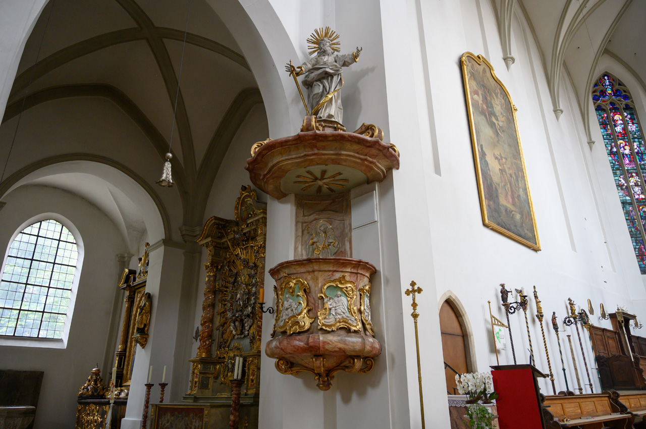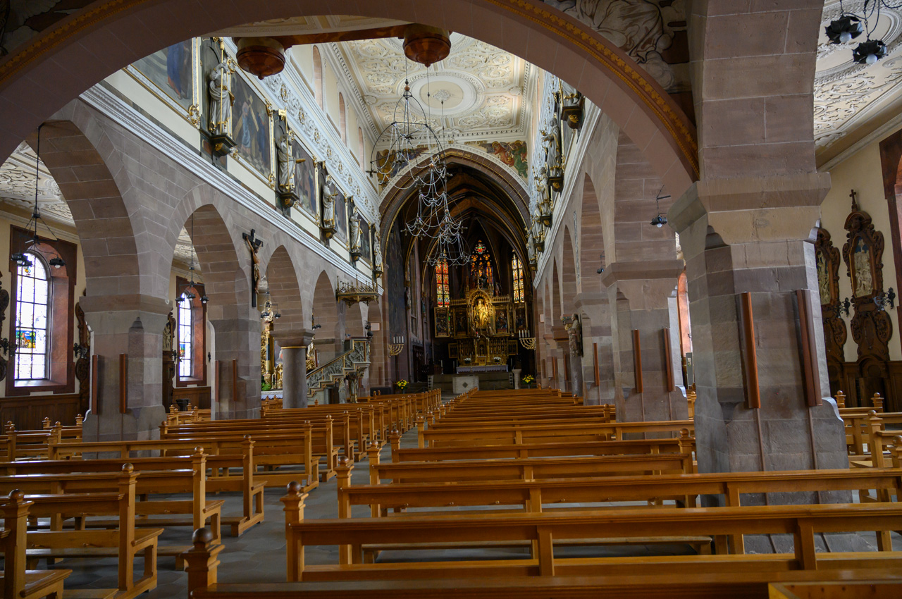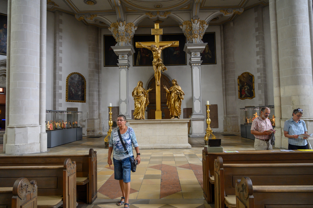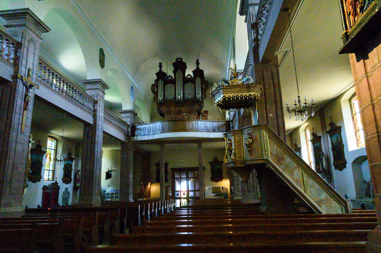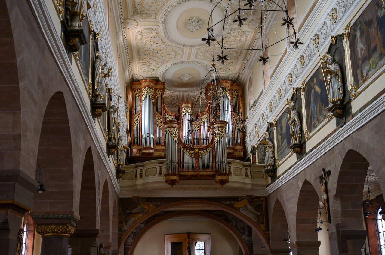 Nach einem Zwischenkaffee sind wir auf unseren NIU gestiegen und zur Burg Markt gefahren. Die letzten 1,5 Kilometer führten über einen Schotterweg und der war dann 200 Meter vor dem Burggelände als Privatweg deklariert und für Kraftfahrzeuge gesperrt. Die gesamte Burganlage ist eigentlich Privatgelände eines Reiterhofes, obwohl auf dem Gelände auch noch die Schlosskapelle steht, in der ja auch noch Gottesdienste stattfinden. Zu besichtigen ist die Kirche nur nach Terminvereinbarung mit der Pfarrei vom Ort Markt. Nach einem kleinen Plausch mit zwei elusteren Frauen, die nur mit Rucksack unterwegs sind, sind wir weiter nach Biberbach gefahren. Die St. Jakobus, St. Laurentius und Hl. Kreuz Kirche dort war leider komplett eingerüstet. Sie war trotzdem offen, aber auch innen leider komplett eingerüstet. Trotzdem konnte man erahnen, dass es sich bei ihr auch um eine sehenswerte Kirche handelt. Sie hat ebenfalls einen Barockaltar und sehr dekorative Seitenaltäre. Ungewöhnlich war das Fehlen einer Orgel auf der Empore. Ich bin darum auf die Empore hochgegangen, weil ich dachte die haben die Orgel wegen der Restaurierungsarbeiten ausgebaut. Die Empore hat aber komplett eine Bestuhlung.