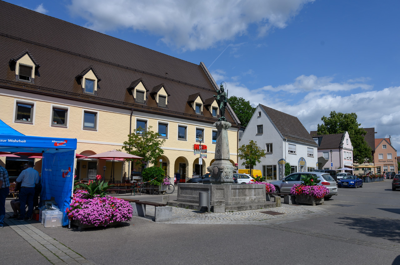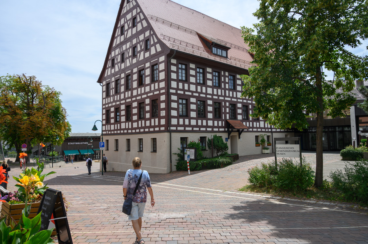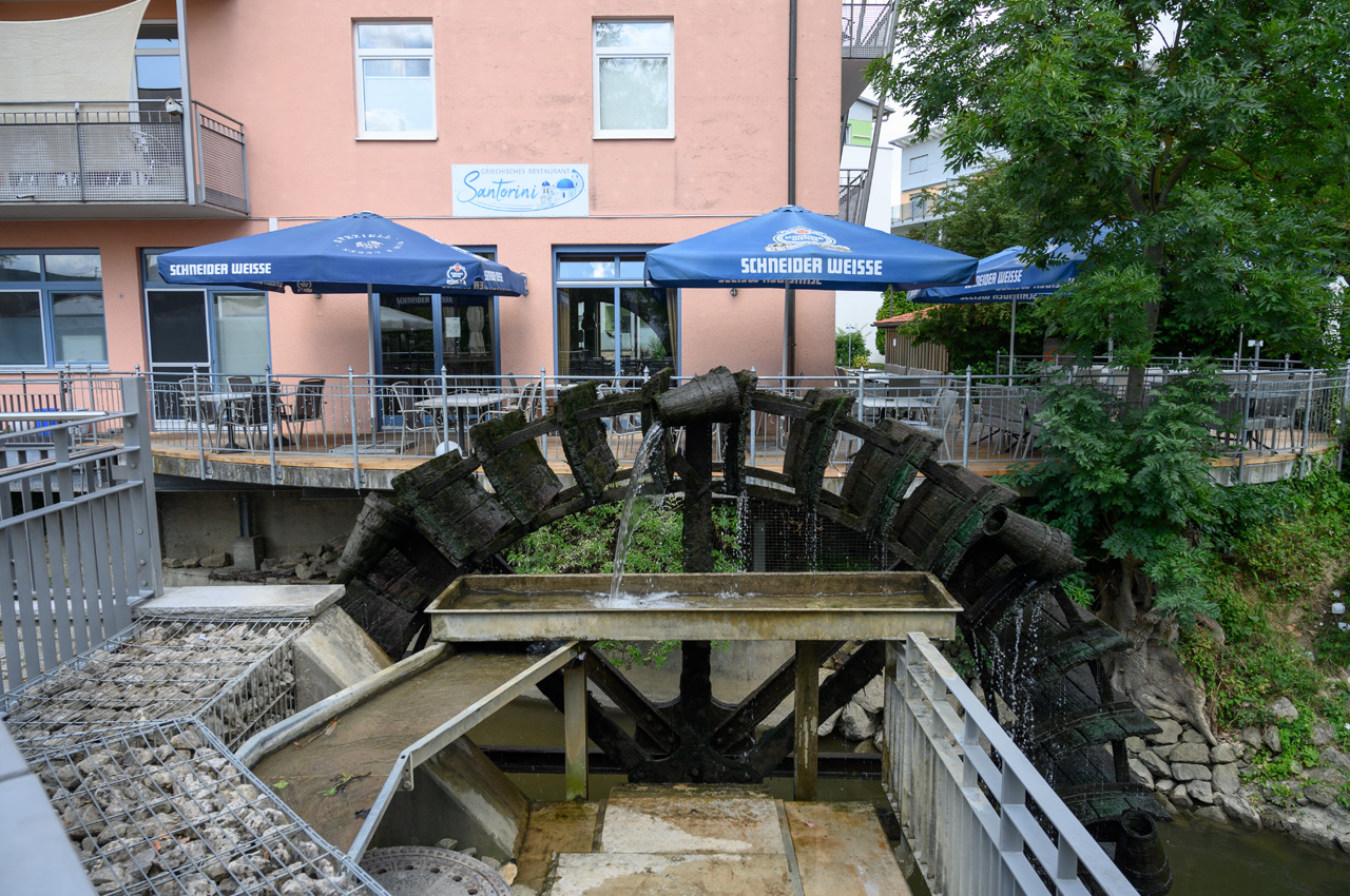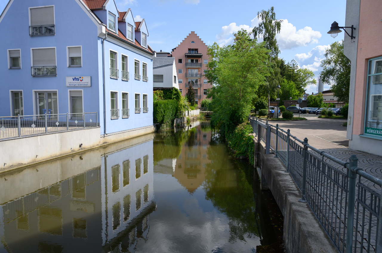Nach dem Frühstück sind wir in die Innenstadt von Wertingen gelaufen. Das ist eine relativ kleine Stadt, aber mit einem schön gestaltetem Zentrum. Auf dem Marktplatz haben wir einen Stand der AFD vorgefunden, die sehr aktiv mit den Leuten diskutiert haben. Von allen anderen Parteien war nichts. Wieso überlässt man denen so kampflos das Feld und das, wo im Herbst hier doch Landtagswahlen sind. Das ehemalige Schloss sieht von außen sehr gepflegt aus, beherbergt jetzt aber die Gemeindevertretung. Die Kirche St. Martin am Markt ist sehr sehenswert. Sie hat einen Barockaltar und eine extrem ausgeprägte Stuckdecke. Die gesamte Ausstattung ist sehr prunktvoll. Eine besonders schöner Bereich ist bei der ehemaligen Getreide- und Ölmühle. Das ehemalige Wasserrad dreht sich heute noch. Es ist mit hölzernen Schöpfbechern ausgestattet, die ein kleines Rinnsal versorgen, was ein Stück weiter wieder ein kleines Rad antrieb. Parallel zu diesen auschmückenden Dingen wird aber über den alten Mühlkanal auch eine Turbine angetrieben, die Strom erzeugt.