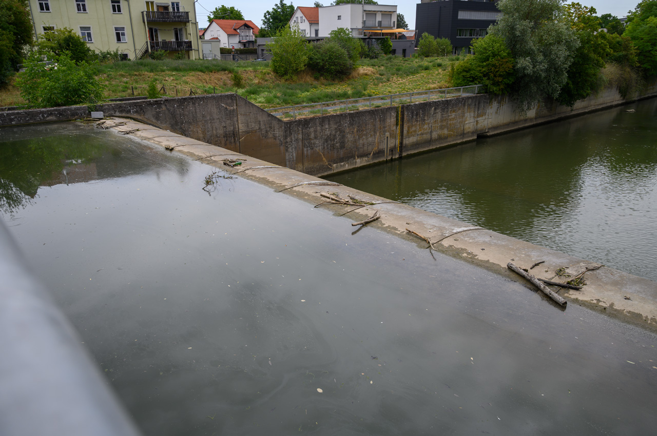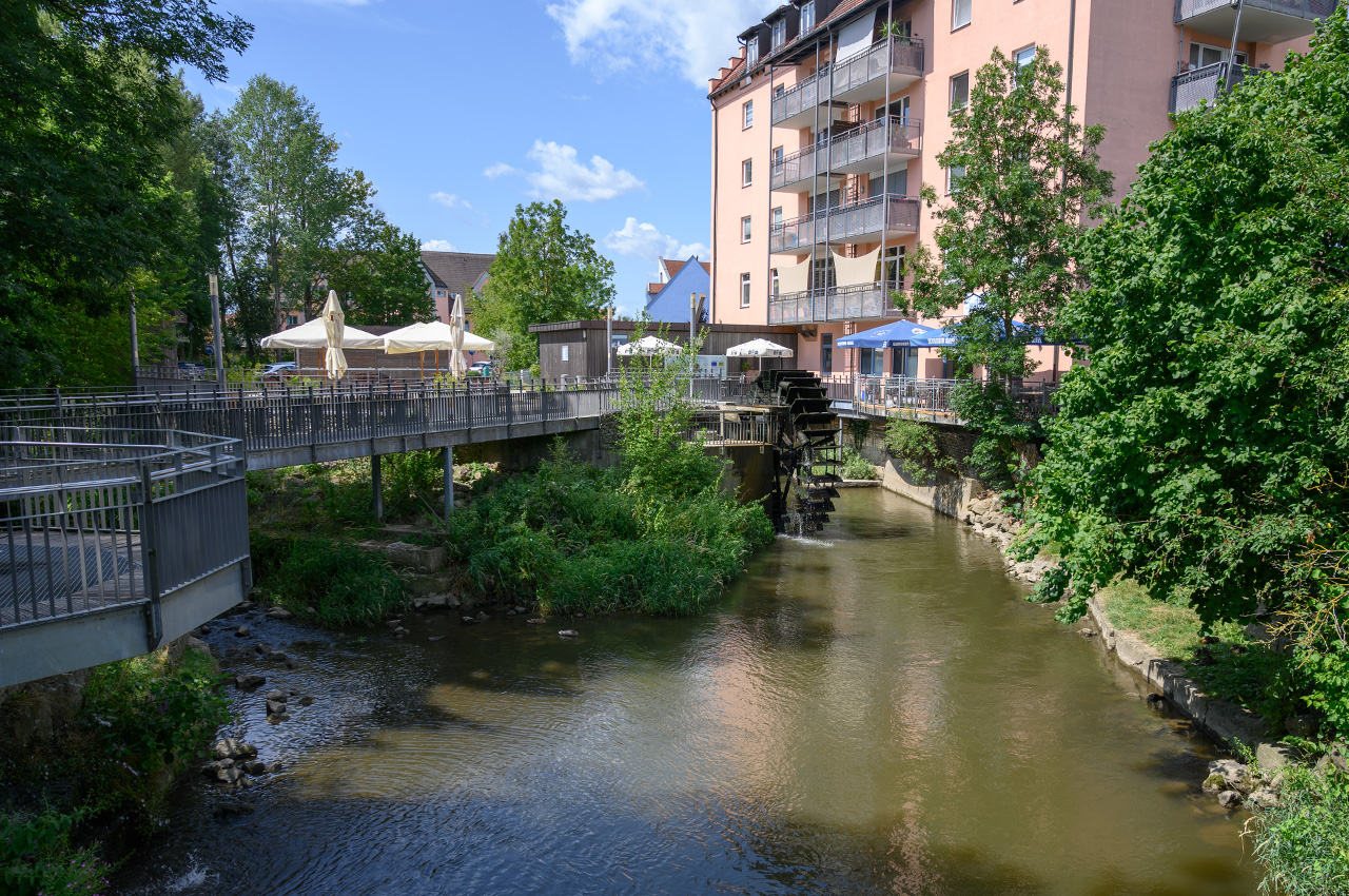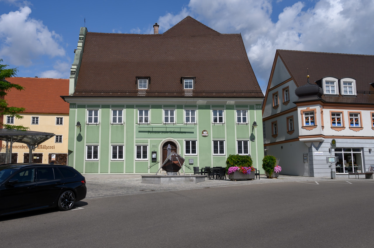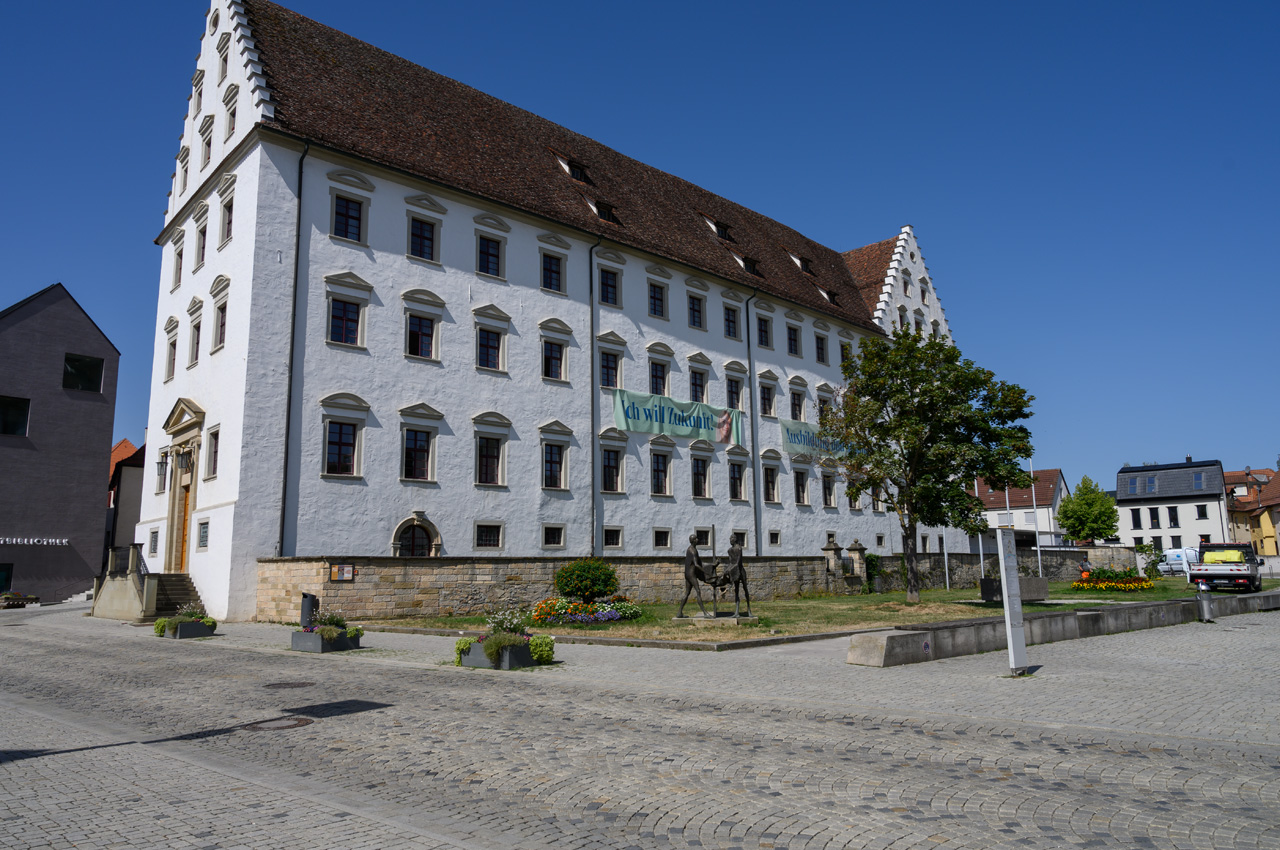 Nach dem Frühstück sind wir in die Innenstadt von Wertingen gelaufen. Das ist eine relativ kleine Stadt, aber mit einem schön gestaltetem Zentrum. Auf dem Marktplatz haben wir einen Stand der AFD vorgefunden, die sehr aktiv mit den Leuten diskutiert haben. Von allen anderen Parteien war nichts. Wieso überlässt man denen so kampflos das Feld und das, wo im Herbst hier doch Landtagswahlen sind. Das ehemalige Schloss sieht von außen sehr gepflegt aus, beherbergt jetzt aber die Gemeindevertretung. Die Kirche St. Martin am Markt ist sehr sehenswert. Sie hat einen Barockaltar und eine extrem ausgeprägte Stuckdecke. Die gesamte Ausstattung ist sehr prunktvoll. Eine besonders schöner Bereich ist bei der ehemaligen Getreide- und Ölmühle. Das ehemalige Wasserrad dreht sich heute noch. Es ist mit hölzernen Schöpfbechern ausgestattet, die ein kleines Rinnsal versorgen, was ein Stück weiter wieder ein kleines Rad antrieb. Parallel zu diesen auschmückenden Dingen wird aber über den alten Mühlkanal auch eine Turbine angetrieben, die Strom erzeugt.