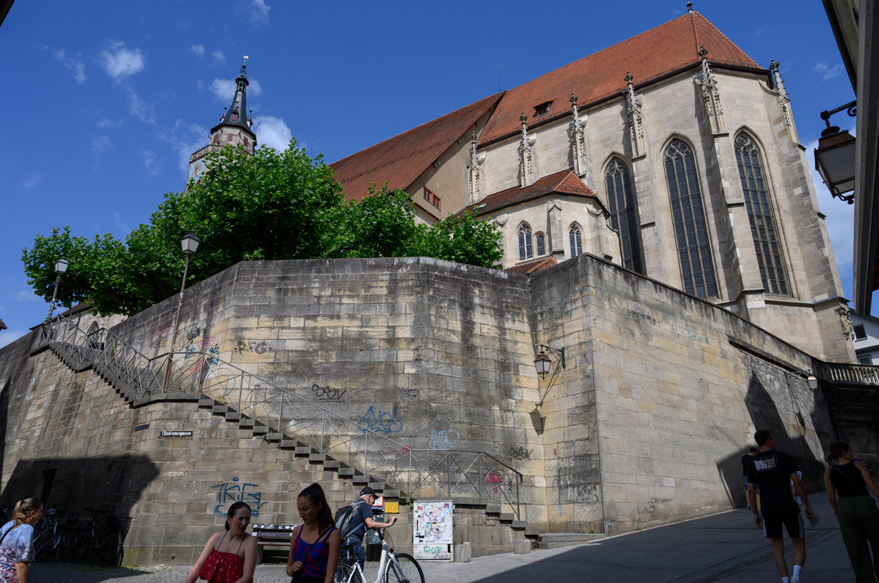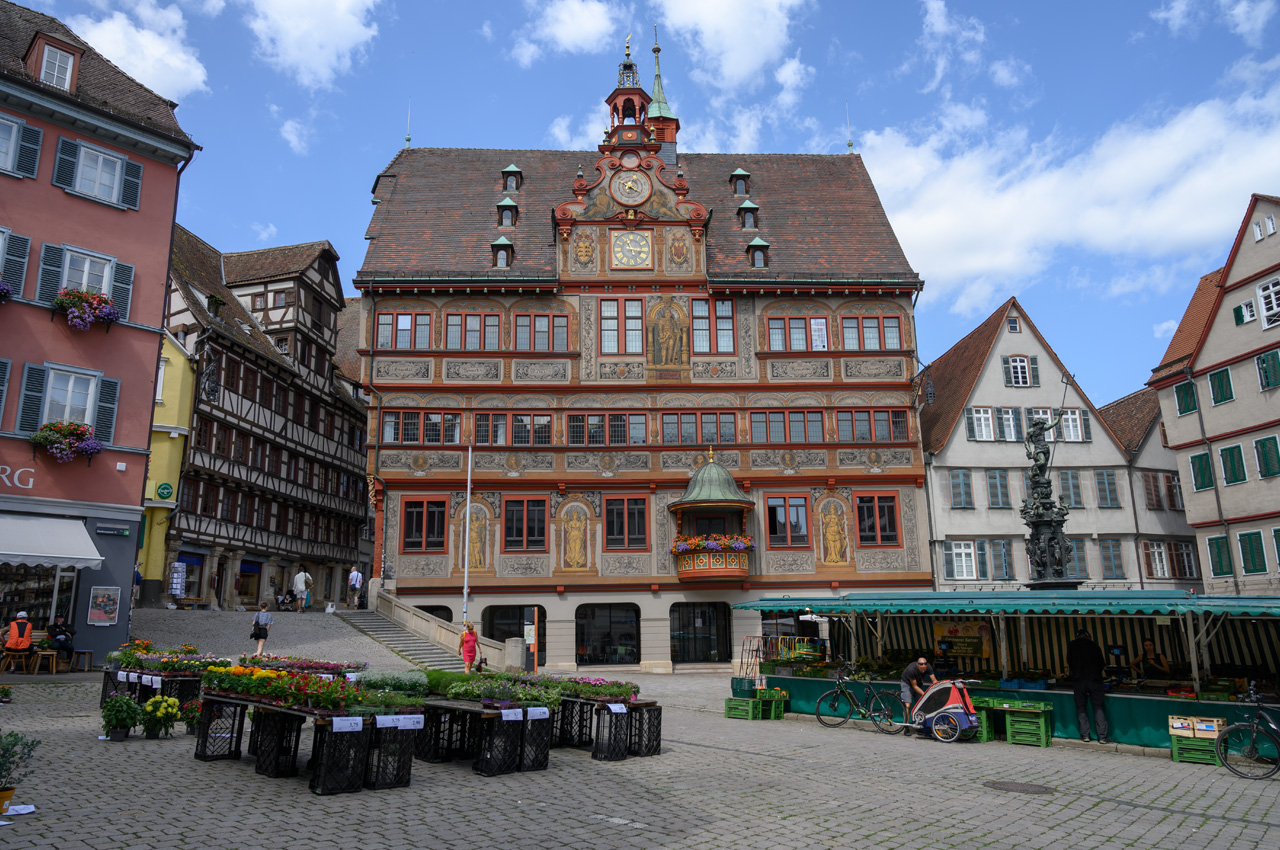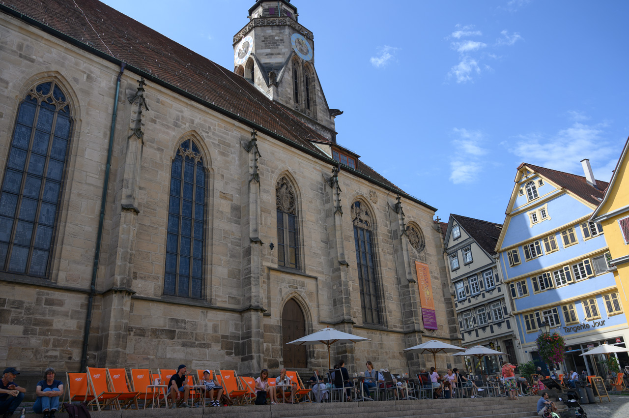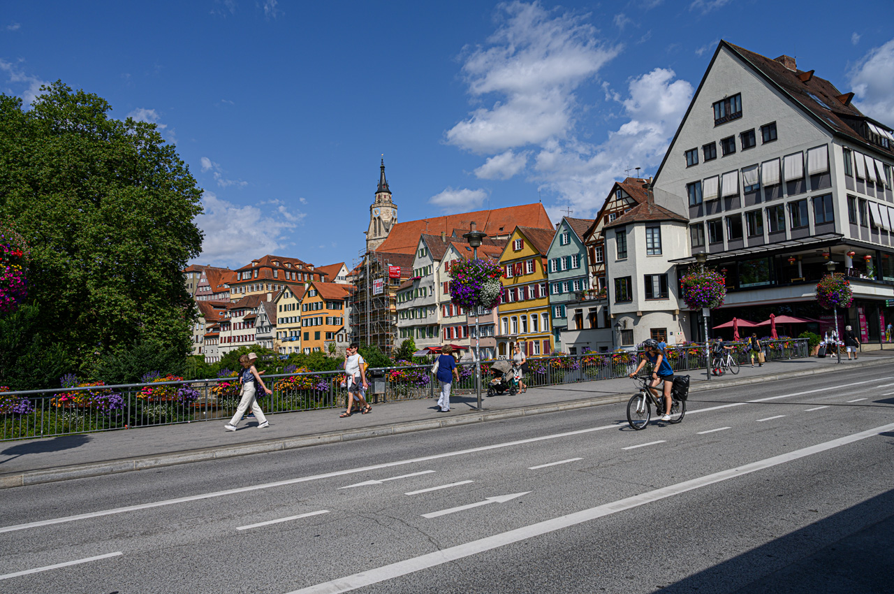Wir haben den NIU aus der Garage geholt und ihn fahrbereit gemacht. Unsere Fahrt nach Tübingen damit wurde zum Abenteuer. Das Navi hatte die B28 gewählt, die aber unmittelbar nach Verlassen des Ortes Rottenburg zur Autostraße wird, also für uns nicht befahren werden darf. Für ortsunkundige eigentlich eine Katastrophe, weil das nicht vorangekündigt wird. Man steht plötzlich vor dem Schild und hat eine Problem. Wenden ist meistens nicht mehr machbar, weil es schon zwischen den Fahrbahnen einen Grünstreifen gibt. Ich hatte noch die Möglichkeit auf einen seitwärts abgehenden Radweg auszuweichen. Ich habe nun unser Navi mit einem kleinen Ort etwas nördlich der eigentlichen Route gefüttert und dann von da aus mit Tübingen. Das waren dann 6km Umweg, aber ohne Autostraße. Als Ziel in Tübingen hatten wir die Touristeninfo eingegeben, um eventuell erstandenes Infomaterial gleich wieder in den NIU packen zu können. Von der Touristeninfo aus konnten wir auch direkt in die Altstadt von Tübingen eintauchen. Die Stadt ist wieder nichts für Susanne, es geht ständig bergauf und bergab. Unabhängig davon ist sie aber sehr schön. Fast komplett geschlossene Häuserfronten aus historischen Gebäuden, wovon viele aus dem 17. und 18. Jahrhundert stammen. Die Stiftskirche hat viele Besonderheiten, die man so nur selten antrifft. 1550 bestimmte Herzog Ulrich, dass der Chor das Grabgelege der herzoglichen Familie wird. Das Chorgestühl wurde ausgebaut und steht nun vor dem Lettner. Der ist auch eine Besonderheit, weil er nun eben nicht mehr die Grenze zwischen Geistlichkeit und Laien bildet. Das Grabgelege darf zur Zeit nicht betreten werden. Von der Stiftskirche sind wir weiter zu dem pompösen Rathausgebäude gelaufen und von da aus zum Schloss Hohentübingen gelaufen, eine weitere Herausforderung für Susannes Knie. Es ging steil bergauf. Belohnt wird man, oben angekommen, mit einem grandiosen Ausblick auf das Neckartal und die Altstadt von Tübingen. Das Schloss wird fast ausschließlich von der Universität genutzt. Das Museum und die Schlosskapelle haben allerdings montags und dienstag geschlossen. Pech für uns. Auf dem ehemaligen Burghof der Schlossanlage wimmelte es nur so von Eidechsen, die dort das offensichtlich morsche Gestein bevölkern. Nach dem Abstieg vom Schloss sind wir noch weiter durch die Altstadt, auf der Suche nach einem schönen Eiscafe. Leider haben wir nur zwei Eisdielen ohne Sitzmöglichkeit gefunden und ein Eiscafe, wo ein großer Eiskaffee 10,-€ kosten sollte und das war uns definitiv zu teuer.