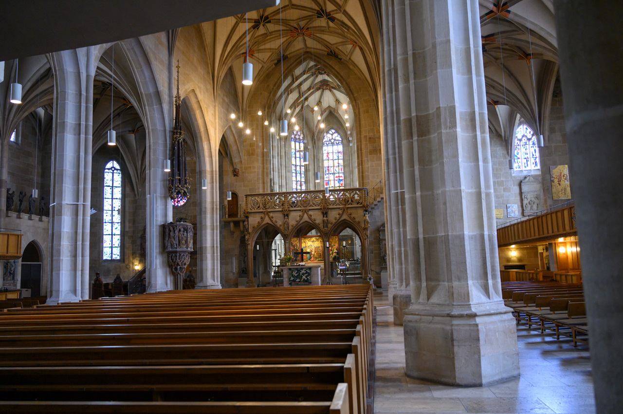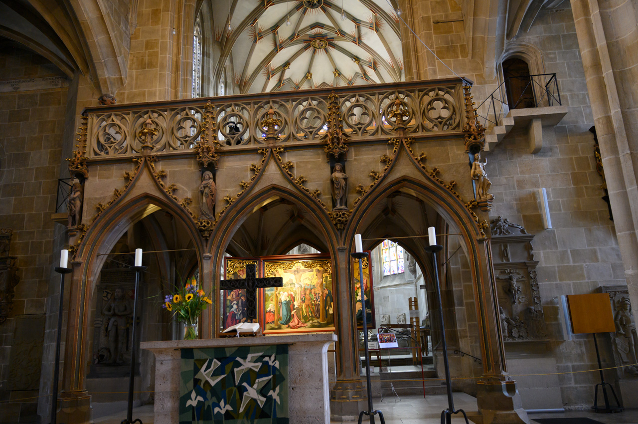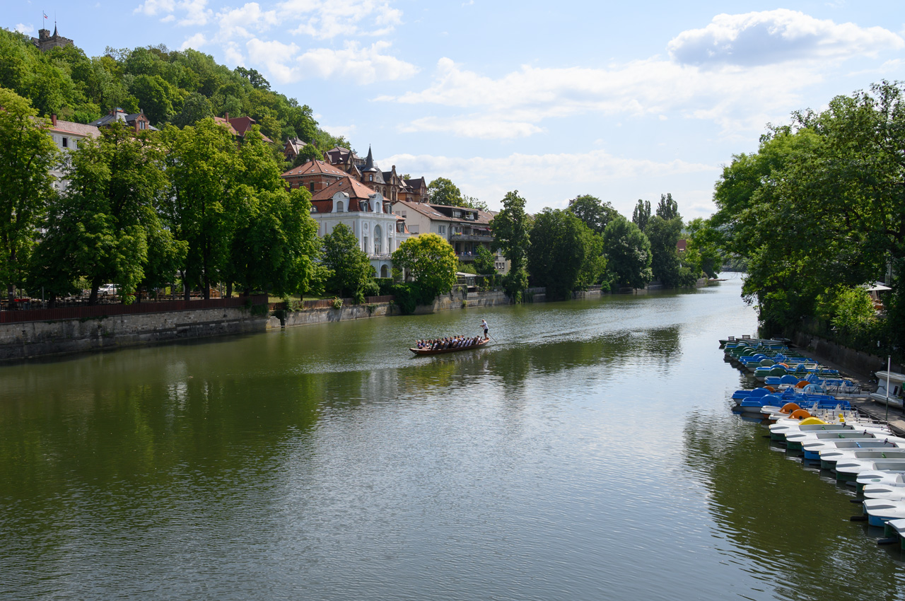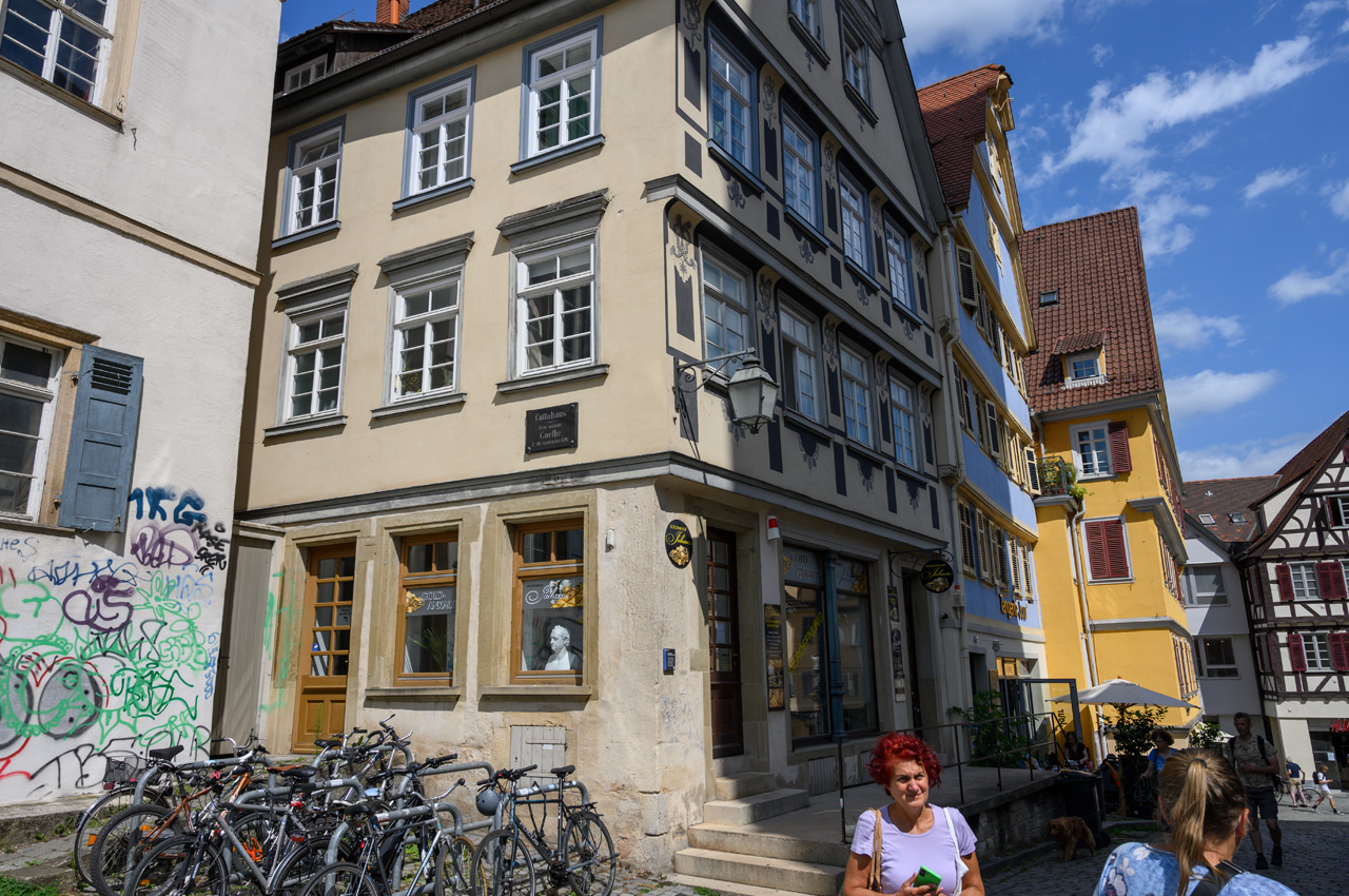 Wir haben den NIU aus der Garage geholt und ihn fahrbereit gemacht. Unsere Fahrt nach Tübingen damit wurde zum Abenteuer. Das Navi hatte die B28 gewählt, die aber unmittelbar nach Verlassen des Ortes Rottenburg zur Autostraße wird, also für uns nicht befahren werden darf. Für ortsunkundige eigentlich eine Katastrophe, weil das nicht vorangekündigt wird. Man steht plötzlich vor dem Schild und hat eine Problem. Wenden ist meistens nicht mehr machbar, weil es schon zwischen den Fahrbahnen einen Grünstreifen gibt. Ich hatte noch die Möglichkeit auf einen seitwärts abgehenden Radweg auszuweichen. Ich habe nun unser Navi mit einem kleinen Ort etwas nördlich der eigentlichen Route gefüttert und dann von da aus mit Tübingen. Das waren dann 6km Umweg, aber ohne Autostraße. Als Ziel in Tübingen hatten wir die Touristeninfo eingegeben, um eventuell erstandenes Infomaterial gleich wieder in den NIU packen zu können. Von der Touristeninfo aus konnten wir auch direkt in die Altstadt von Tübingen eintauchen. Die Stadt ist wieder nichts für Susanne, es geht ständig bergauf und bergab. Unabhängig davon ist sie aber sehr schön. Fast komplett geschlossene Häuserfronten aus historischen Gebäuden, wovon viele aus dem 17. und 18. Jahrhundert stammen. Die Stiftskirche hat viele Besonderheiten, die man so nur selten antrifft. 1550 bestimmte Herzog Ulrich, dass der Chor das Grabgelege der herzoglichen Familie wird. Das Chorgestühl wurde ausgebaut und steht nun vor dem Lettner. Der ist auch eine Besonderheit, weil er nun eben nicht mehr die Grenze zwischen Geistlichkeit und Laien bildet. Das Grabgelege darf zur Zeit nicht betreten werden. Von der Stiftskirche sind wir weiter zu dem pompösen Rathausgebäude gelaufen und von da aus zum Schloss Hohentübingen gelaufen, eine weitere Herausforderung für Susannes Knie. Es ging steil bergauf. Belohnt wird man, oben angekommen, mit einem grandiosen Ausblick auf das Neckartal und die Altstadt von Tübingen. Das Schloss wird fast ausschließlich von der Universität genutzt. Das Museum und die Schlosskapelle haben allerdings montags und dienstag geschlossen. Pech für uns. Auf dem ehemaligen Burghof der Schlossanlage wimmelte es nur so von Eidechsen, die dort das offensichtlich morsche Gestein bevölkern. Nach dem Abstieg vom Schloss sind wir noch weiter durch die Altstadt, auf der Suche nach einem schönen Eiscafe. Leider haben wir nur zwei Eisdielen ohne Sitzmöglichkeit gefunden und ein Eiscafe, wo ein großer Eiskaffee 10,-€ kosten sollte und das war uns definitiv zu teuer.