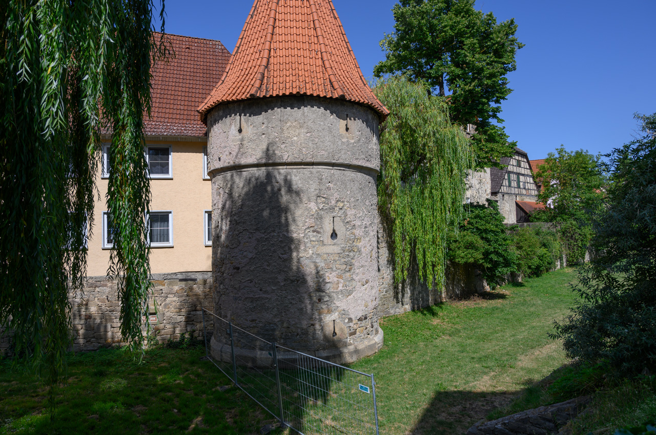 Heute gab es Brötchen aus dem Bestand. Wir haben trotzdem gut gefrühstückt. Nach dem Frühstück sind wir mit dem NIU zum Werksverkauf von Hengstenberg gefahren und haben da wieder mal haltlos eingekauft. Vieles war aber auch erheblich billiger als in regulären Geschäften. Unsere Beute haben wir erst in das Womo gebracht um für den ALDI-Besuch wieder einen leeren Koffer zu haben. Danach ging es wieder direkt in die Altstadt von Fritzlar. Den Berganstieg hatt unser NIU gut weg gesteckt. Wir sind die Fußgängerzone in Richtung Marktplatz gelaufen, vorbei an den gotischen Steinhäusern, die zum ältesten Bestand historischer Gebäude in Fritzlar zählen. Besonders beeindruckend, die wuchtigen, vorgesetzten Treppengiebel. Die Bebauung rings um den Marktplatz ist ein echter Augenschmaus für Liebhaber von kunstvoll verzierten Fachwerkhäusern. In dem Marktbrunnen gibt es einige stattliche Koys. Vorbei an der Touristeninfo, die sich ebenfalls in einem historischen Haus befindet, sind wir dann zum Dom gelaufen. Wir hatten ihn ja gestern schon mal kurz angeschaut, aber heute sind wir ihn etwas intensiver durchlaufen und vorallem mit Fotoapparat. Der Dom hat eine reiche, historische Ausstattung und eine große Krypta. Das Dommuseum haben wir uns nicht angesehen, es war aber auch nicht geöffnet. Auf dem Domplatz steht ein Monument was an den heiligen Bonifatius erinnert. Er hat hier die von den Heiden vergötterte Eiche eigenhändig gefällt und aus dem Holz eine kleine Kapelle gebaut, woraus später die Domkirche sich entwickelt hat. Wir sind nun vorbei am Hochzeitshaus, einem riesigen Fachwerkgebäude, zum grauen Turm gelaufen. Er war der größte Turm der Stadtbefestigung und der einzige, der ständig mit Soldaten besetzt war. Eher zufällig haben wir vor dem Turm einen weiteren Womo-Stellplatz entdeckt. Er hat die als Vorteil die Altstadtnähe, ist aber eben nur ein besserer Parkplatz. Vom grauen Turm aus sind wir entlang der Stadtmauer zurück zur Fußgängerzone. Eigentlich wollten wir am Marktplatz ein Eis essen, unser gestern besuchtes Eiscafe hat allerdings Ruhetag. Ein weiteres, ca. 200 Meter entfernt, gab es nur noch freie Plätze in einer kleinen Seitengasse, wo es kräftig zog. Eisessen haben wir ausfallen lassen. Wir sind noch zum nahen ALDI gelaufen und haben uns dort mit frischen Lebensmitteln ausgestattet. Unser NIU hat uns erfolgreich zum Womo zurück gebracht. Hier war wieder unser Equipment gefordert, um uns einen gemütlichen Schattenplatz für unseren Kaffee zu geben. Nach dem Kaffe bin ich nochmals alleine losgezogen und habe eine Wanderung zu der Fischzuchtanlage an der Eder gemacht. Sie soll eine der größten Binnenzuchtanlagen Deutschlands sein. Die einzelnen Becken sind komplett mit Netzen überspannt. Dadurch können keine fischfressenden Vögel eindringen, was sowohl dem Fischbestand erhalten soll als auch dem Schutz vor übertragbaren Krankheiten dient. Ein wenig weiter befindet sich ein Stauwehr, was durch einen seitlichen Abzweig die Fischzuchtanlage über einen kleinen Kanal mit frischem Wasser versorgt und den Mühlengraben mit Wasser versorgt. An dem Mühlengraben gab es im Mittelalter mehrere Wassermühlen. Entlang dem Mühlengraben bin ich zurück zum Womo gelaufen. Das war wieder eine sehr schöne Wanderung.