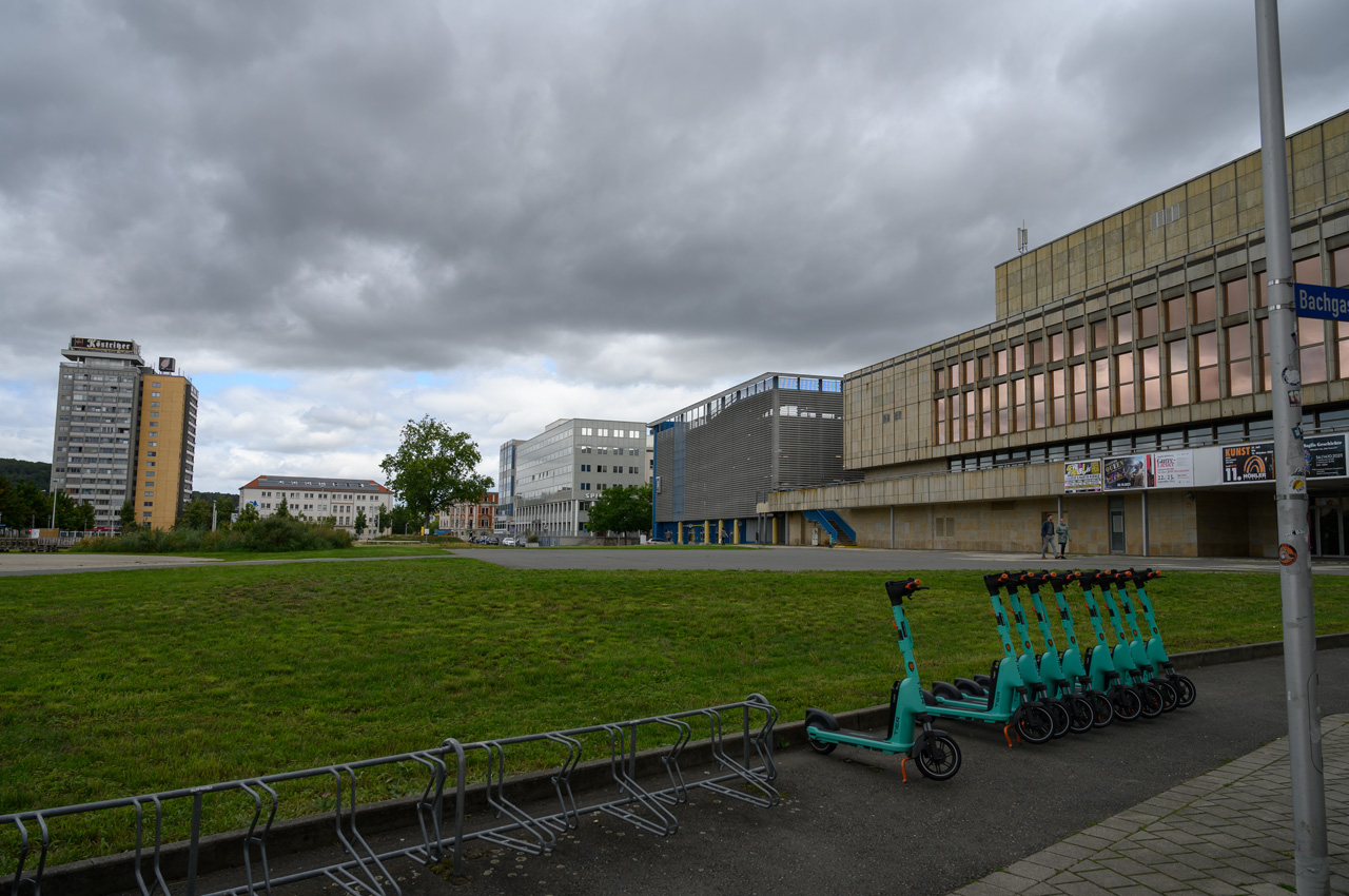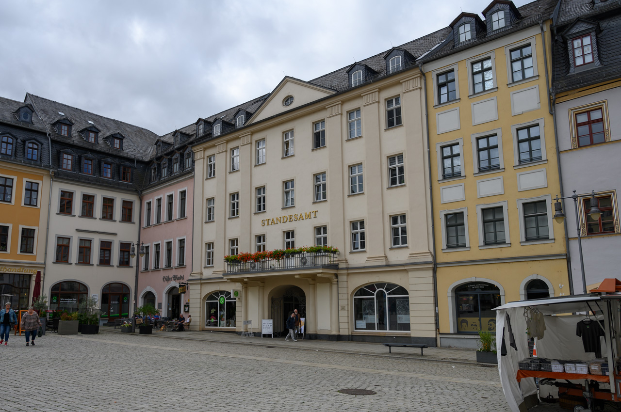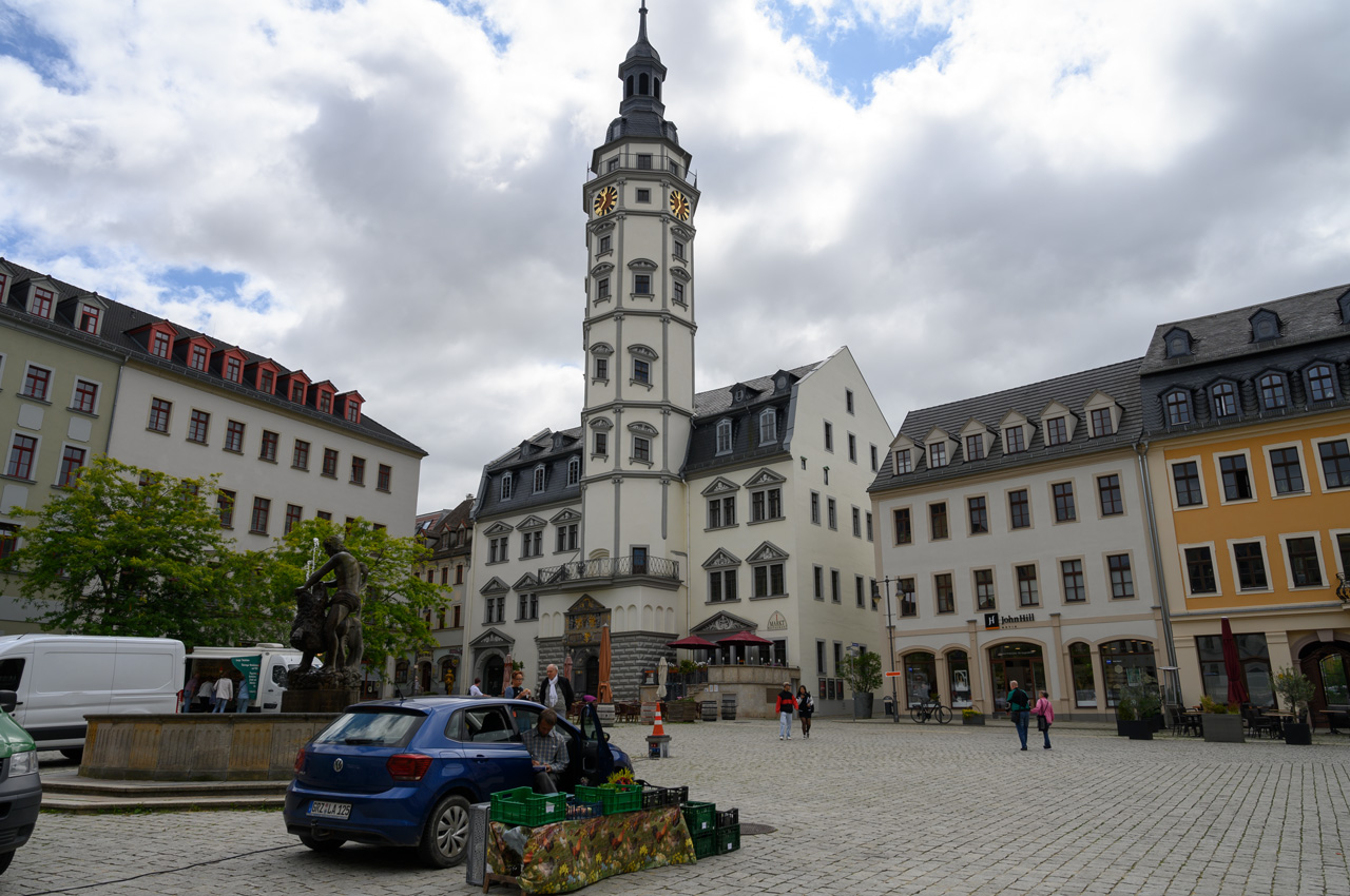 Laut Eigentümerin des Stellplatzes sollte heute gegen 09:00 Uhr ein Bäckerwagen kommen. Darauf haben wir uns verlassen und ich habe schon ca. 10 Minuten vor dem Termin vor dem Platz gestanden und auf den Bäcker gewartet. 10 Minuten nach 09:00 Uhr habe ich das Unterfangen abgebrochen. Susanne hatte in der Zwischenzeit noch Toasties ausgebuddelt. Mal abgesehen von dem Ärgernis mit dem Ausbleiben des Bäckers haben wir dann trotzdem gut gefrühstückt. Nach dem Frühstück habe ich unseren NIU startklar für einen Innenstadtbesuch von Gera gemacht. Am Morgen hatte der Wind kräftig aufgefrischt und blies in Böen schon ziemlich heftig. Wir haben unseren NIU am Rutheneum abgestellt. Von da aus waren wir schnell am Marktplatz mit der Touristeninformation. Hier haben wir uns mit entsprechendem Infomaterial über Gera ausgestattet. Der Marktplatz ist sehr schön. Er hat ringsherum noch historische Bebauung, die nach der Wende wieder ihren alten Glanz zurückbekommen hat. Ein besonderes Juwel ist dabei das Rathausgebäude mit seinem markantem Turm. Von hier aus sind wir auf den Nikolaiberg gestiegen, um der Salvatorkirche einen Besuch abzustatten, was leider nur von außen möglich ist. Die Kirche war verschlossen und es gab auch keine Infos zu Öffnungszeiten. Von da aus sind wir vorbei am Museum für Naturkunde, hier sind auch die Höhlergänge, wieder zurück in die Fußgängerzone gelaufen. Die Höhlergänge haben wir nicht besucht, nachdem wir hörten, dass darin mehr als 164 Stufen zu überwinden sind. Außerdem kann man sie nur in Verbindung mit einer Führung besichtigen. Die Fußgängerzone macht einen eher traurigen Eindruck. Es gibt hier sehr viel Leerstand an Einzelhandelsgeschäftsräumen. Die Fußgängerzone endet in einem Bereich der sehr stark von der DDR-Zeit geprägt wurde. Hier steht das ebenfalls noch aus der DDR-Zeit stammende Kongresszentrum mit den typischen Kupferblendscheiben. Aber auch die riesig breiten Straßenflächen und Freiplätze. Man merkt, dass Land hier keinen Marktwert hatte. Wir sind mit dem NIU dann weiter zur Orangerie gefahren. Die Orangerie ist heute Kunstmuseum und sehr schön anzusehen. Auch der Park der zwischen ihr und dem Theater liegt macht einen sehr gepflegten Eindruck. Von der Orangerie sind wir in Richtung weiße Elster gelaufen und dort über die Brücke zur St. Marienkirche. Rechts und links der Allee, die dort hinführt, stehen viele sehenswerte Villen aus der Hochblüte Geras in dem beginnenden Industriezeitalter. Das Schloss Osterstein was einst hoch über der weißen Elster thronte existiert nicht mehr, aber einige der Wirtschaftsgebäude und der dazugehörige Gutshof sind noch vorhanden. Die Gebäude des ehemaligen Gutshofes vom Schloss sind in einem äußerst maroden Zustand, trotzdem sind offensichtlich einige Wohnungen darin noch vermietet. Die St. Marienkirche hätten wir uns gerne auch von innen angesehen, sie ist aber nur an einigen Tagen und dann nur an Nachmittagen für 1,5 Stunden geöffnet. Neben der Kirche steht das Haus in dem Otto Dix geboren wurde. Das Haus beherbergt heute auch ein Otto-Dix-Museum. Wir sind über den Hofwiesenpark wieder zurück zur Orangerie gelaufen und auf unseren NIU gestiegen. Mit einem Zwischenstopp bei einem Bäcker sind wir wieder bei unserem Womo gelandet. Bei dem Bäcker haben wir uns mit Brötchen für morgen Früh versorgt. Auf den blöden Bäckerwagen fallen wir nicht nochmal herein.