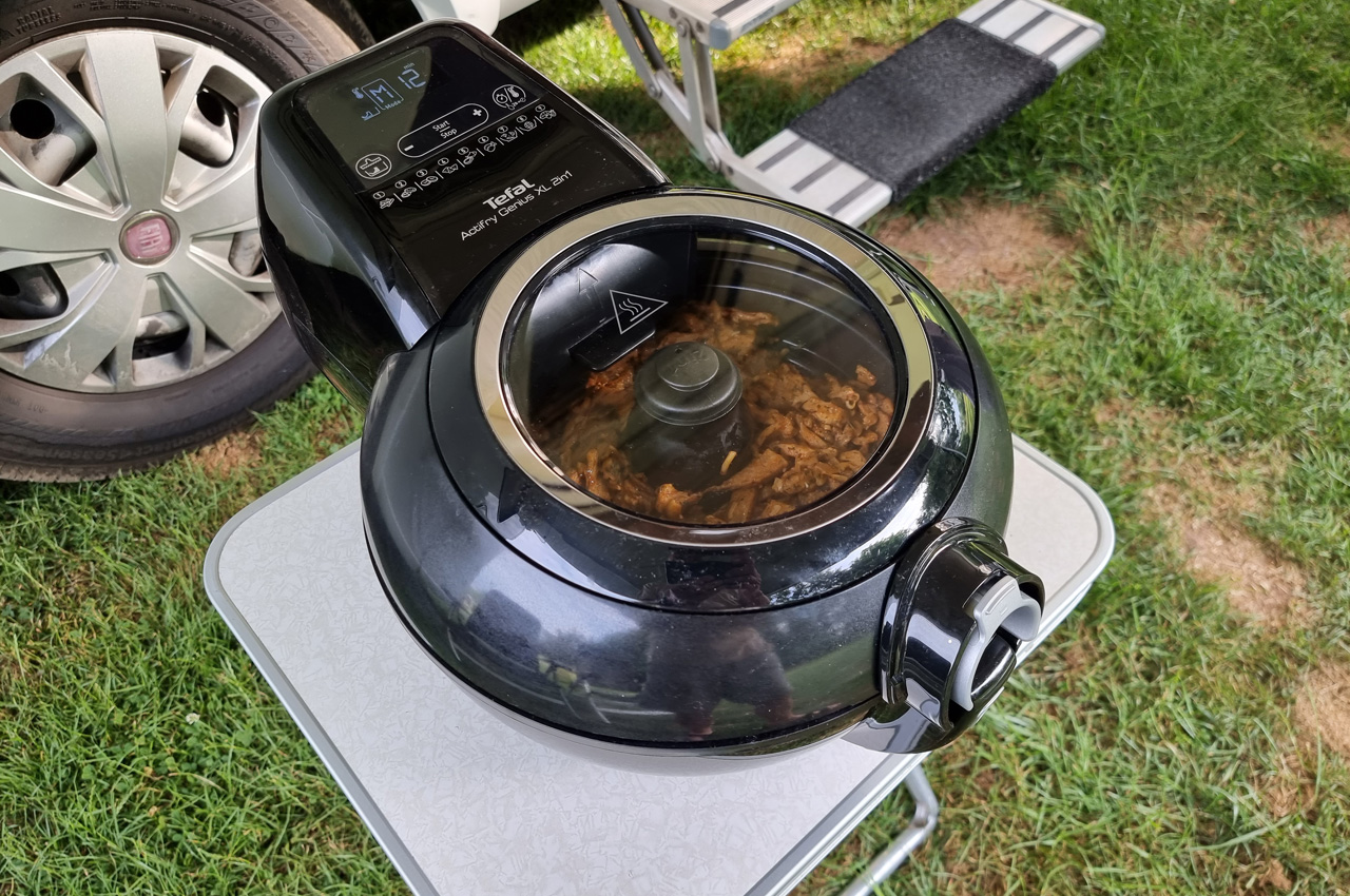 Gegen Abend kam nun erstmalig unsere neue Frituese im Womo zum Einsatz. Es gab Gyros und einen Mix aus Kartoffelecken und gefüllten Kartoffeltaschen. Die Kartoffelecken und die gefüllten Kartoffeltaschen hätten noch etwas mehr Garzeit gebraucht, alles zusammen war aber sehr lecker. Das können wir wiederholen. Susanne hatte dazu einen ausgesprochen leckeren frischen Salat gemacht.