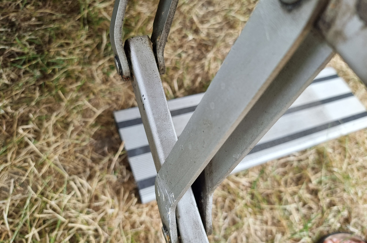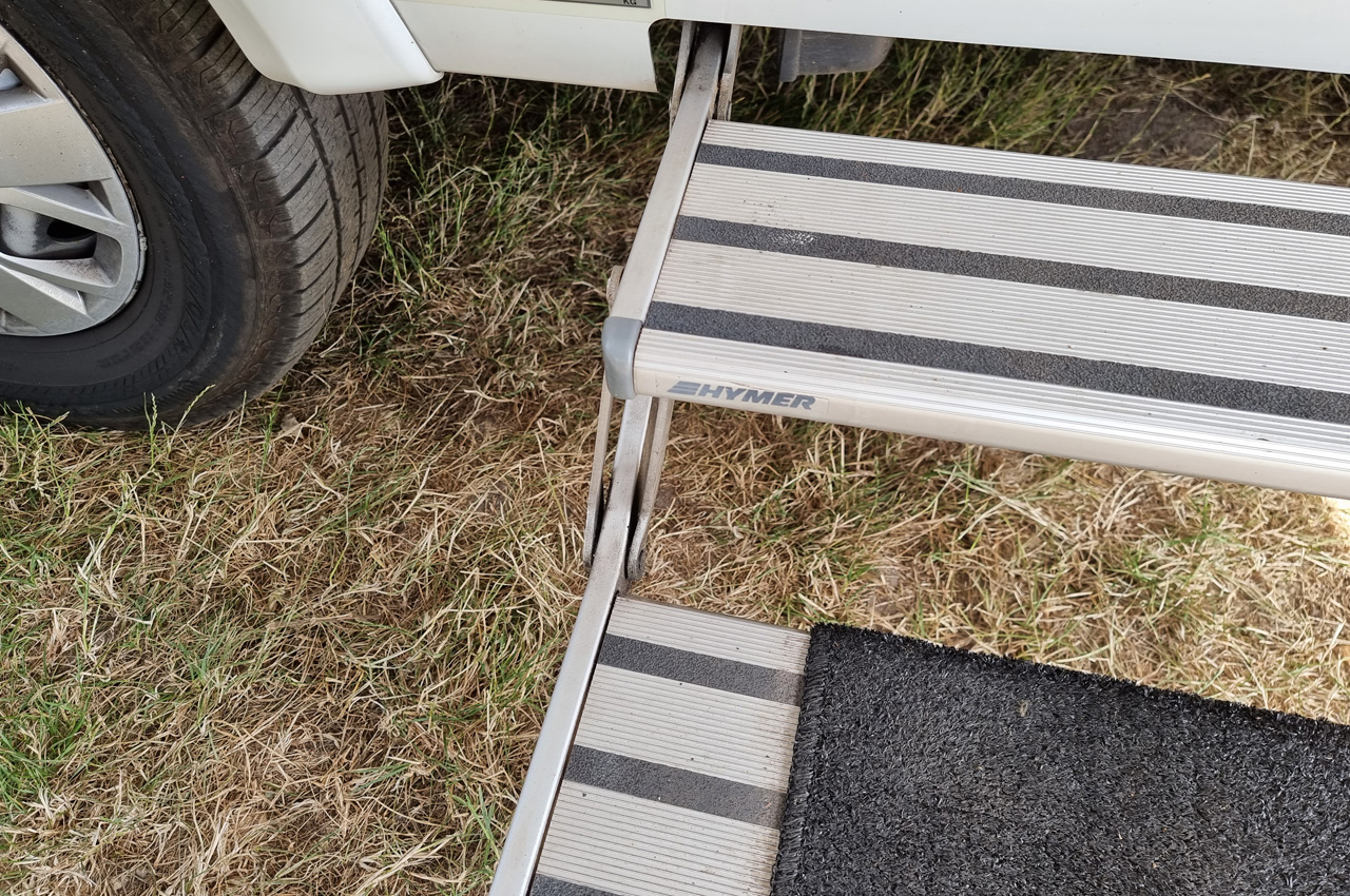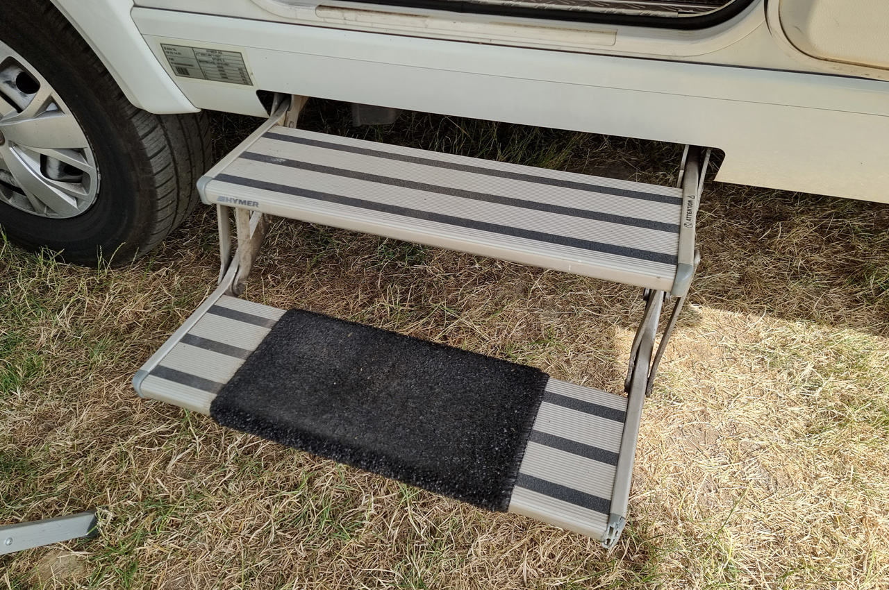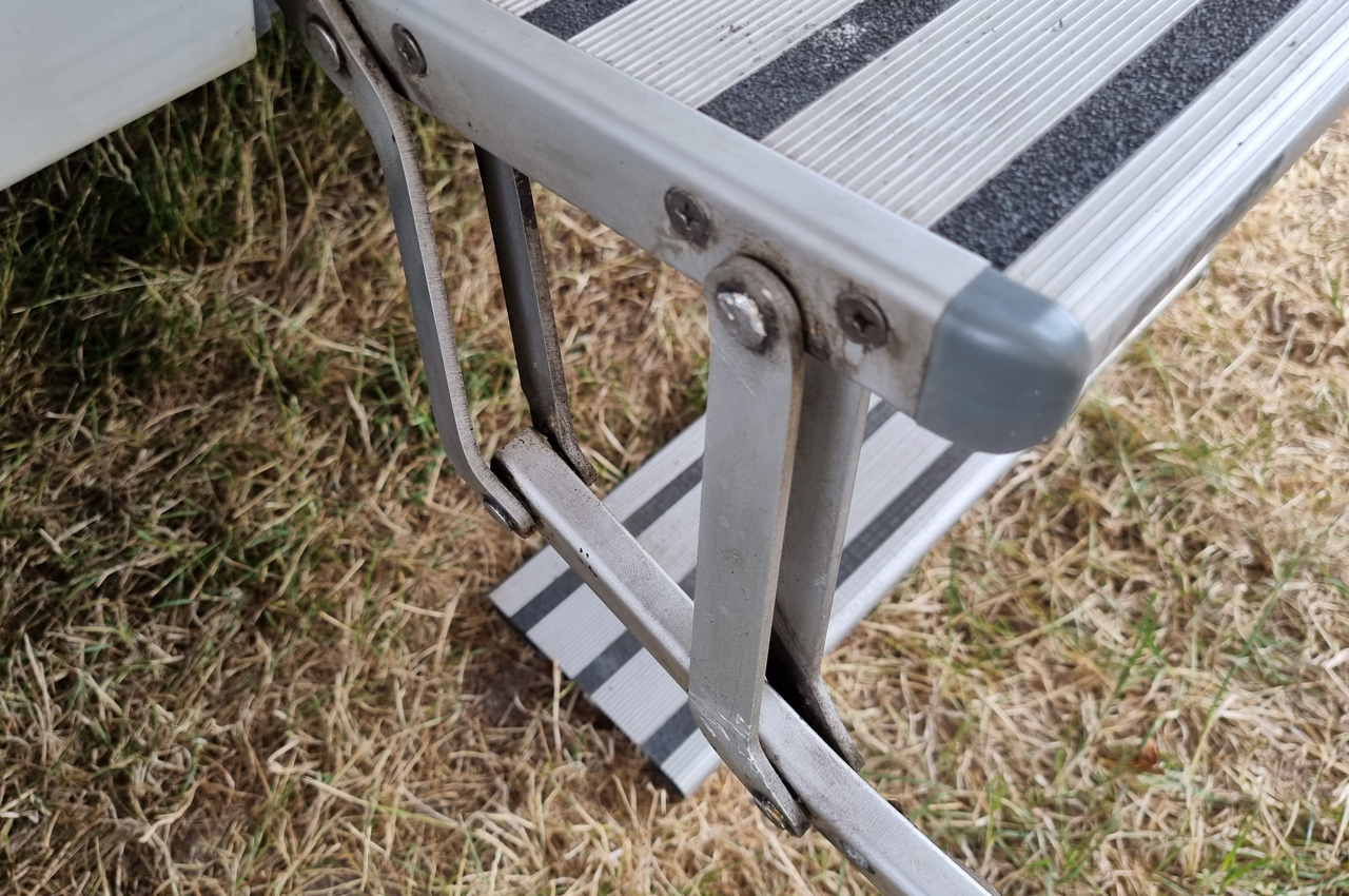 Nach dem Kaffeetrinken habe ich mich nochmals über die Treppe hergemacht. Mit allen möglichen Tricks unter Einsatz des Spanngurtes für unseren NIU habe ich die Treppe zumindestens so hinbekommen, dass wir sie wieder benutzen können und sie für die Fahrt einfahren können. Wir werden trotzdem eine neue Treppe benötigen.