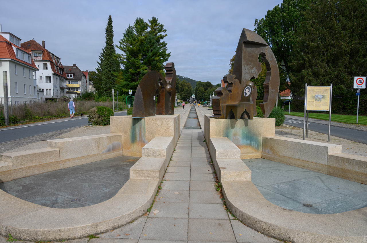 Aus Brauschweig kommend haben wir fast ausnahmslos die B1 benutzt und sind dabei durch Hildesheim und Hameln gefahren. Keine Umleitung, keine Baustelle, fast schon unheimlich. So geht es auch. Weil es noch Sonntag am Vormittag war, waren auch die Straßen noch relativ leer. Auf dem Stellplatz angekommen, staunten wir nicht schlecht, der Platz war fast ausgelastet und das bei 60 Stellflächen. Das ist aber wahrscheinlich dem Feiertag am Dienstag geschuldet. Wir haben aber einen Sahneplatz gefunden. Sahneplatz, weil unsere Sitzseite unverbaubar und gut zum Ausladen für unseren NIU ist. Nachdem wir unser Womo standfest gemacht haben, sind wir beide zur Touristeninfo gelaufen. Sie befindet sich ca. 200 Meter entfernt vom Stellplatz. Das ist Susanne sogar nur an einer Krücke gelaufen. Toll, wie tapfer sie ist. Es scheint damit wieder aufwärtszugehen. Leider hat sich seit einigen Tagen ihr Rücken wieder mit Schmerzen gemeldet, was wir jetzt lange nicht hatten. In der Touristeninfo haben wir unsere Kurkarten erhalten mit denen man mit allen Verkehrsmitteln kostenlos fahren kann und die kostenlosen Zugang zu den Kurparkanlagen ermöglicht.