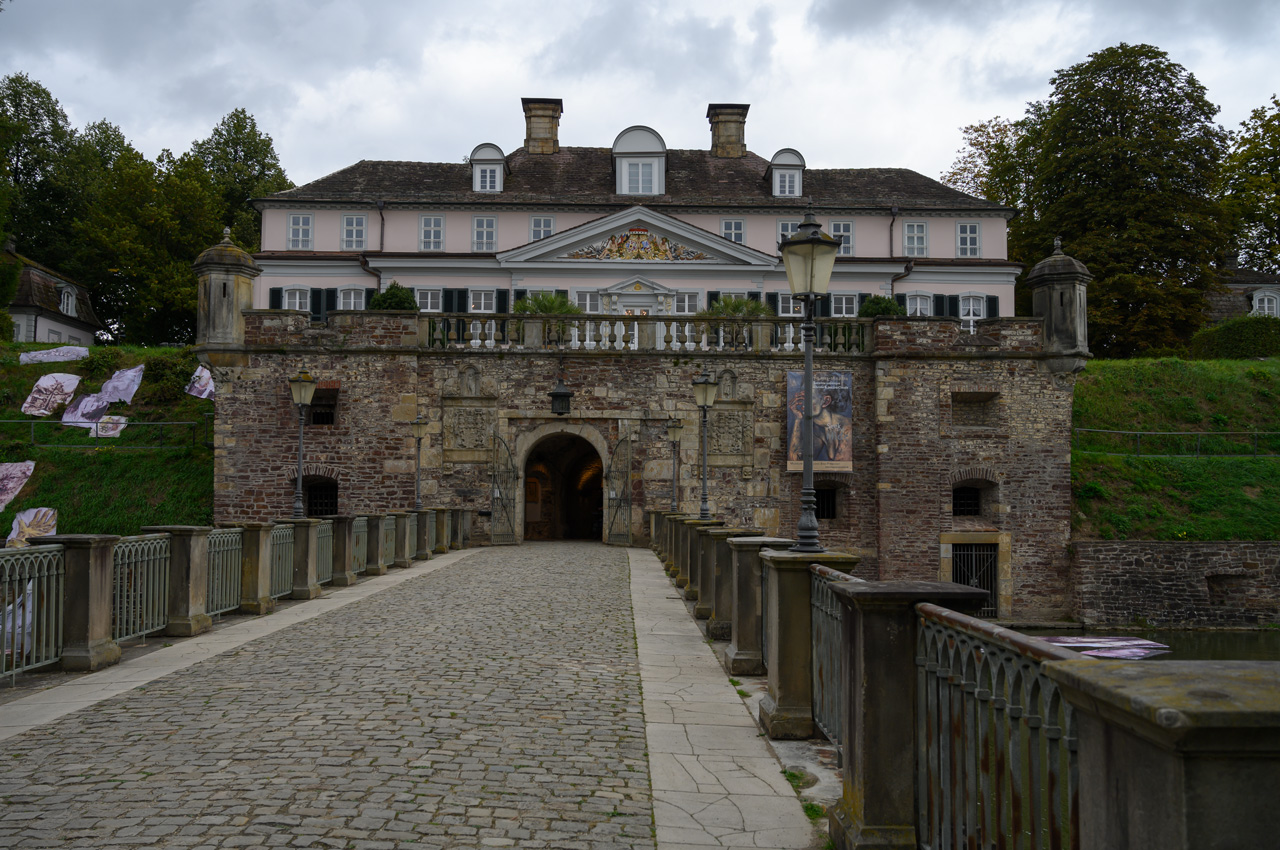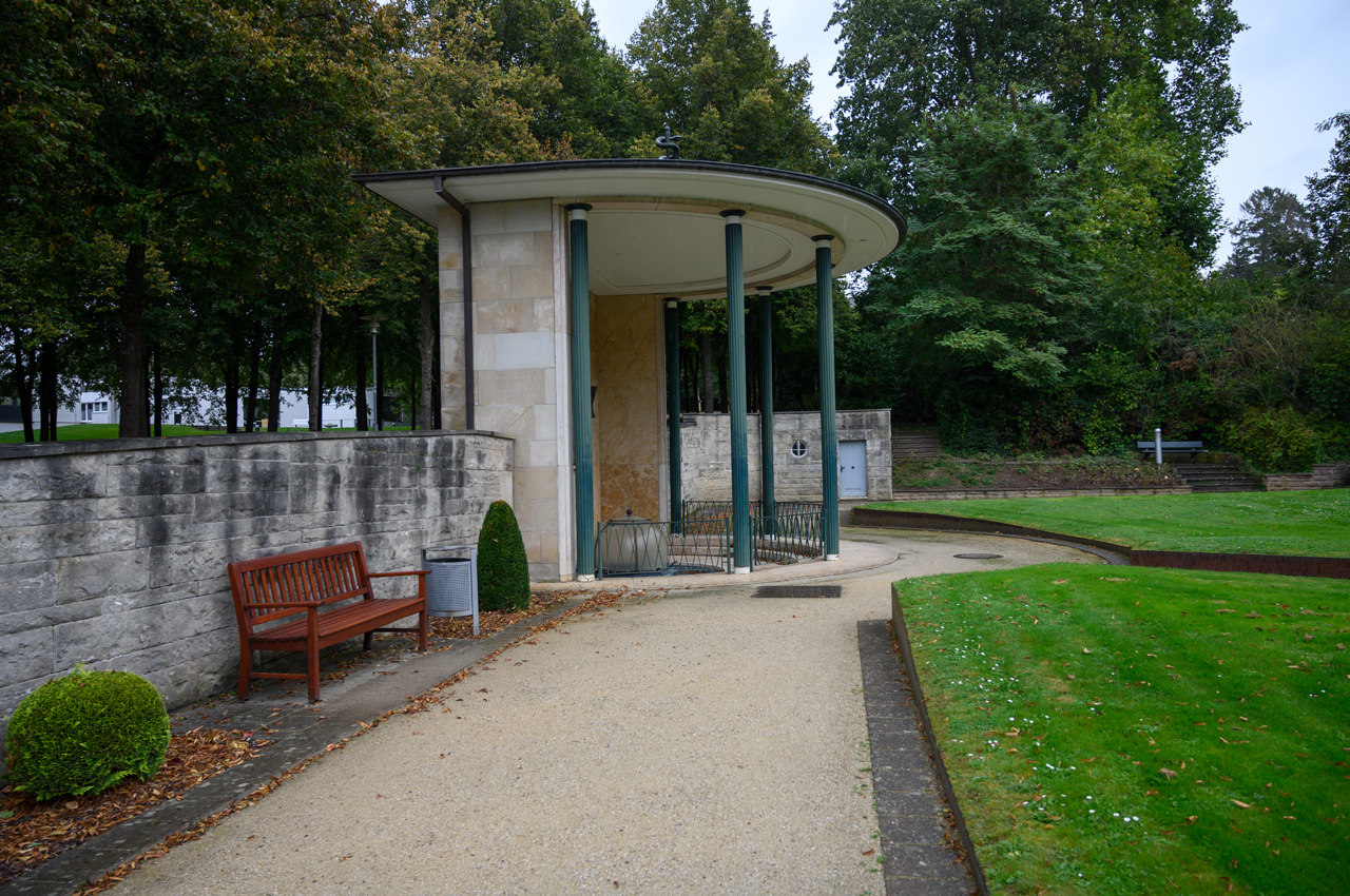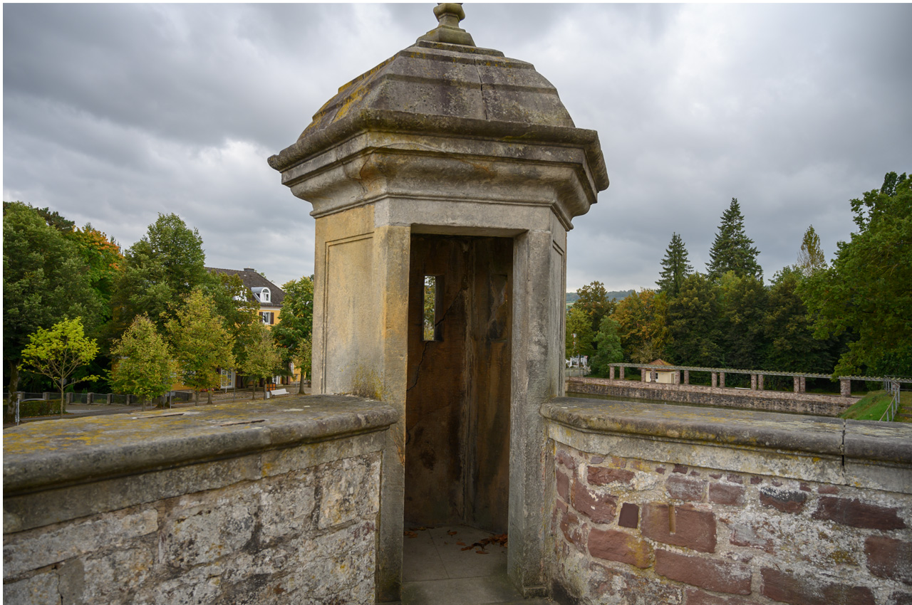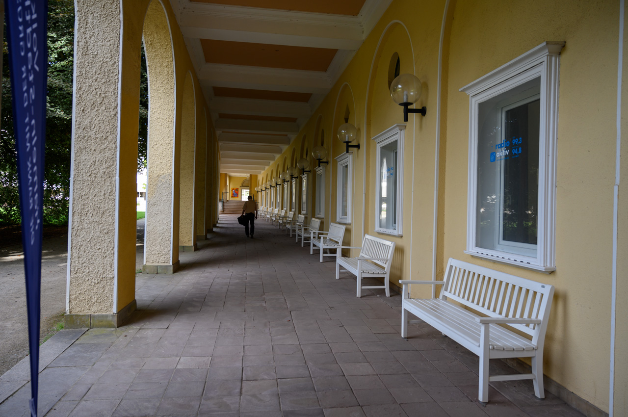 Gegen 13:00 Uhr habe ich mich dann nicht mehr von dem Wetterbericht und dem düsteren Himmel beirren lassen. Ich habe mich einfach auf den Weg gemacht, mit einem Regenschirm bewaffnet. Mein erstes Ziel war das Schloss. Auf dem Weg dahin bin ich an vielen Villen vorbeigekommen, die mal im wilhelminischen Stil erbaut wurden und die ich eher von der Ostseeküste her kenne. Das Problem, die Villen, alles ehemalige Pensionen mit hochtrabenden Namen, stehen leer. Sieht so aus, als ob sie dem Verfall preisgegeben sind. Dieser Anblick hat meinen Eindruck vom Verfall dieses Ortes nur noch verstärkt. Das Schloss oder besser die Festungsanlage ist von der Lage und dem Äußeren sehr eindrucksvoll, aber es gibt nicht mehr wirklich viel zu sehen, weil die Gebäude vordergründig für Veranstaltungen genutzt werden und das Museum hauptsächlich von wechselnden Ausstellungen gefüllt wird. In dem Festungsgraben der Anlage wimmelt es nur so von richtig dicken Karpfen. Man könnte fast vermuten, da sind ein paar zu viel drinnen. Das Wasser ist auch eine ziemlich trübe Suppe. Nach dem Verlassen der Festungsanlage, habe ich in einem großen Bogen den Kurpark umrundet durch das nördliche Parkgelände der großen Reha-Kliniken. Hier sieht es schon alles etwas lebendiger aus, obwohl auch hier eine Klinikruine vor sich hin rottet. Am Brunnenplatz in der Wandelhalle, hatte ich gestern leckere Torten in dem Cafe gesehen. Da habe ich drei Stück gekauft, für unseren Nachmittagskaffee. Als ich die Wandelhalle verlassen habe, fing es ziemlich kräftig an zu regnen. Gut, dass ich den Schirm dabei hatte. Jedenfalls habe ich die Tortenstücke trocken und weitestgehend unbeschadet zum Womo gebracht. Hat sich gelohnt, denn die waren richtig lecker.