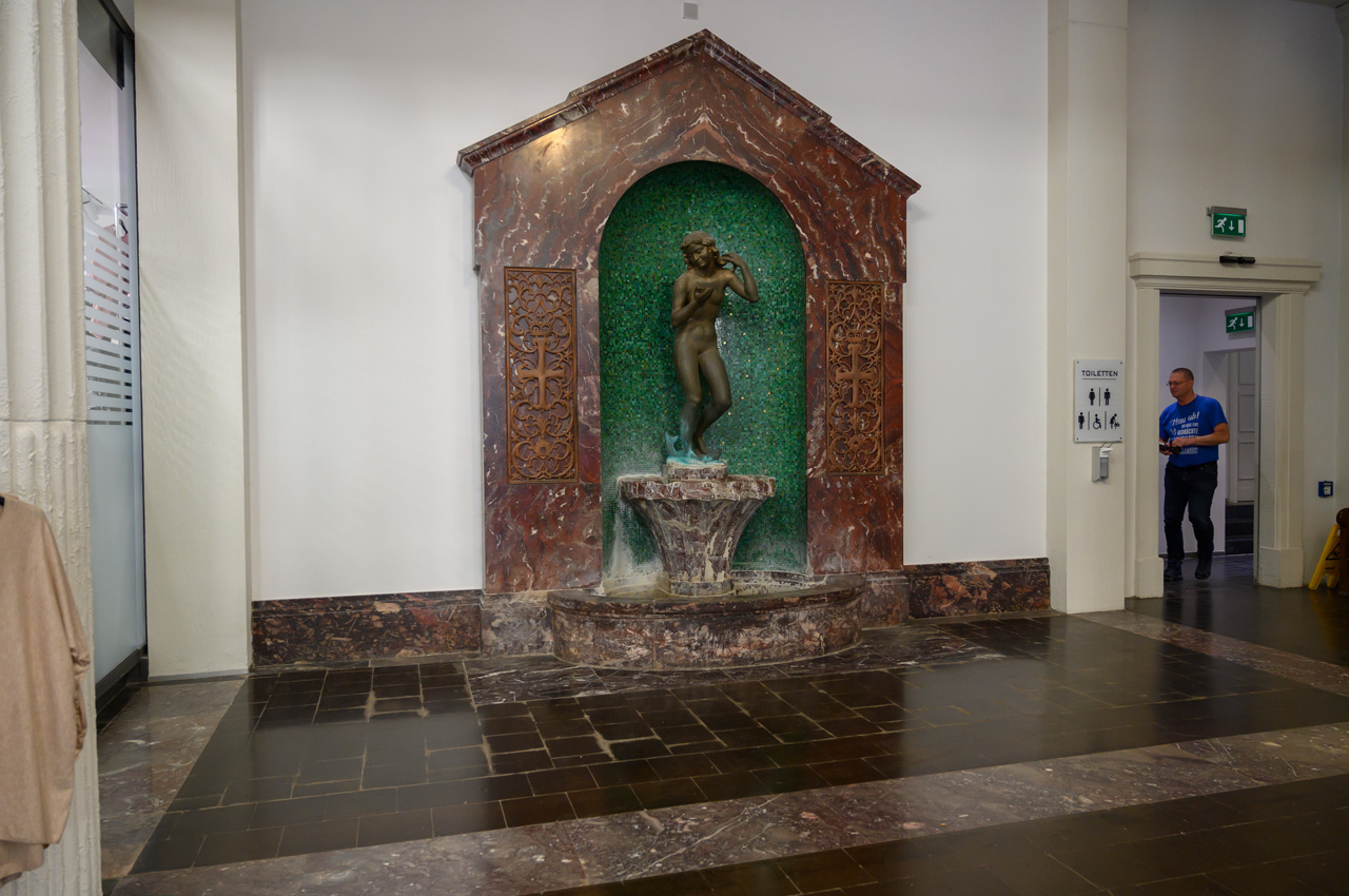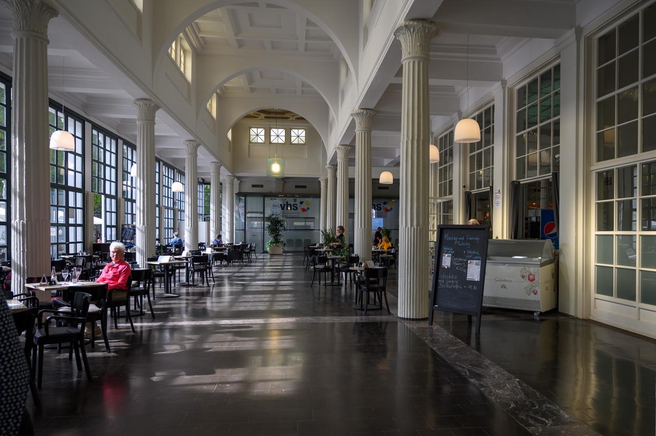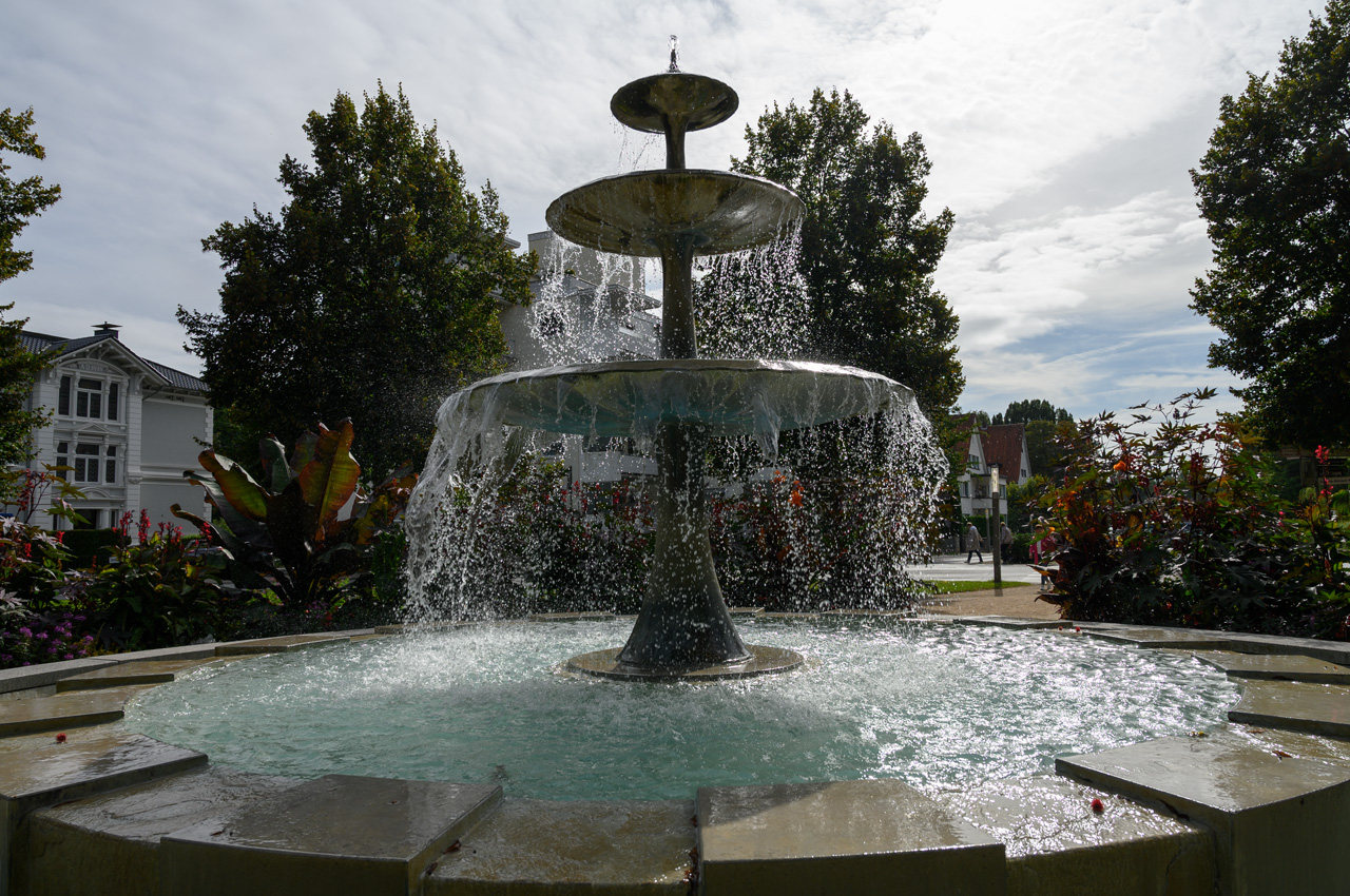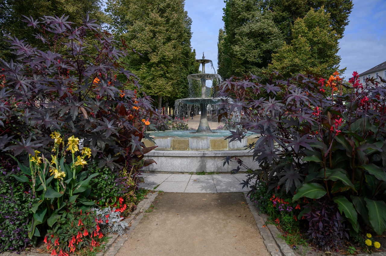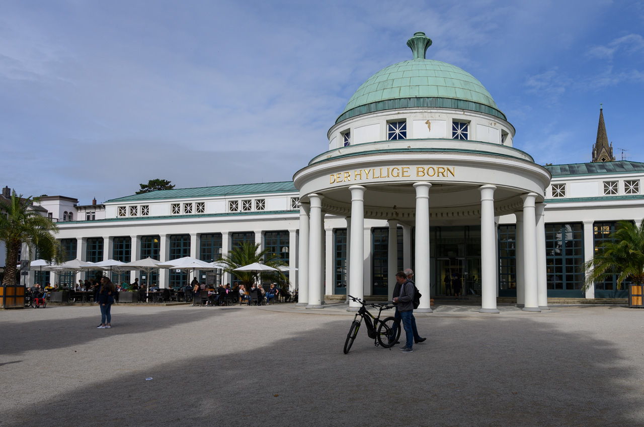 Nach unserem Zwischenkaffee habe ich mich zu einer ersten Stadtbesichtigung aufgemacht. Ich bin die Hauptallee durchgelaufen bis zum Brunnenplatz. Dort war ich in der Wandelhalle Hyllige Born. Etwas bergauf, war ich dann in der Christuskirche. Zurück wieder über die Haupthalle bis zum Zugang zum Kurpark. Dort hatte ich freien Eintritt durch unsere gerade erworbene Kurkarte. Der Park ist sehr mondän und teilt sich in einen englischen Landschaftspark und einen tropischen Palmengarten mit mehreren Springbrunnenanlagen. Der Palmengarten hat diverse Palmen, die mehr als 5 Meter hoch sind. Durch die vielen Springbrunnen und die gute Gartengestaltung ist es eine sehr romantische Ecke. An einigen Stellen des Parkes würde ich mir etwas mehr Pflege vorstellen können.