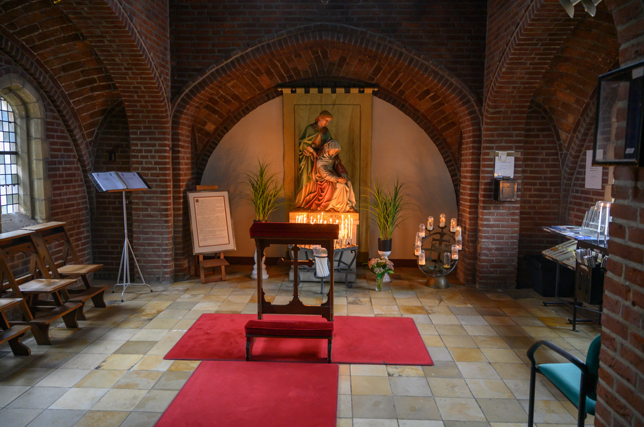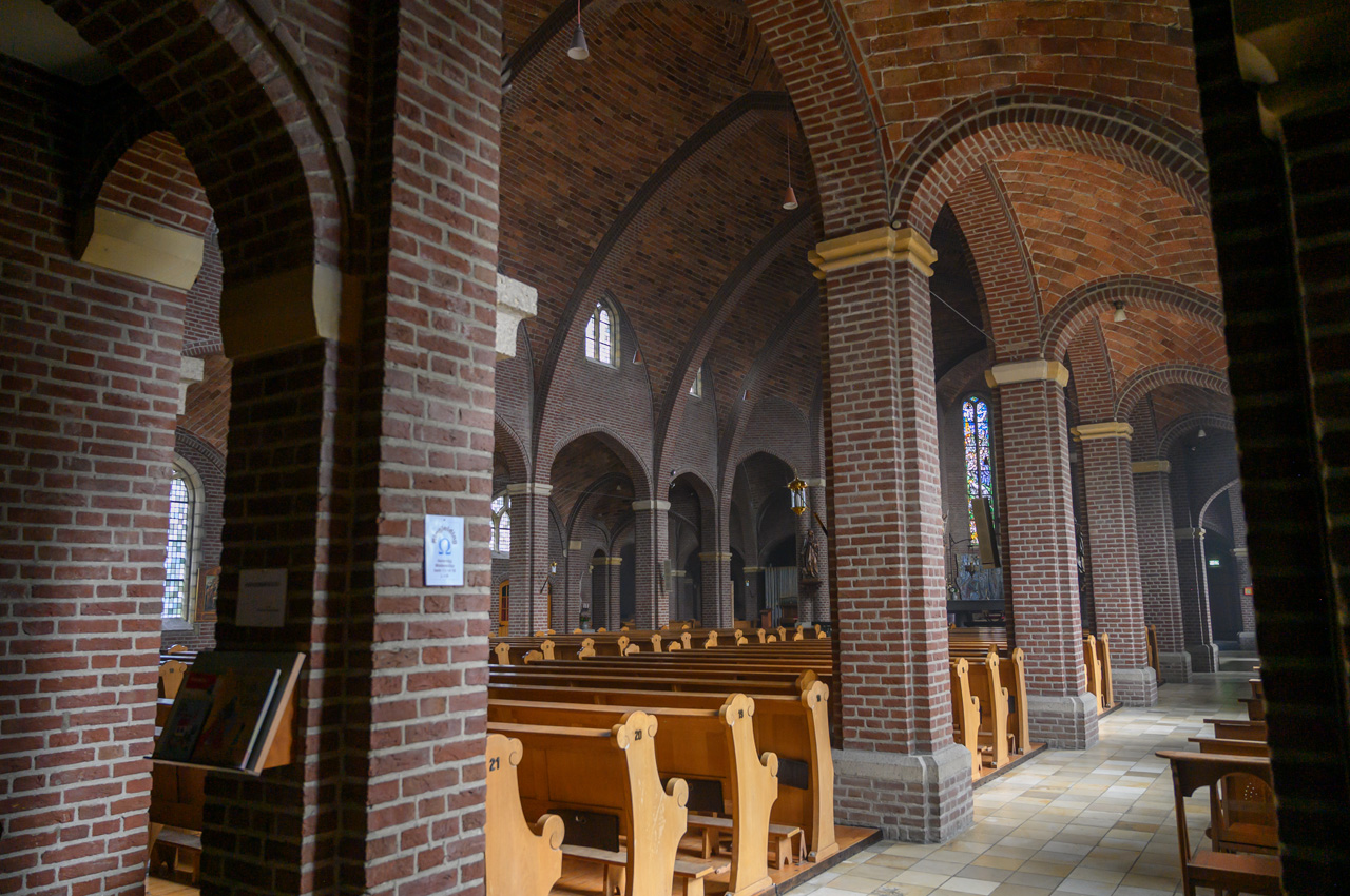 Gegen Mittag bin ich zu einem größeren Spaziergang gestartet. Der Weg sollte das Ziel sein und so bin ich einfach immer entlang dem Ufer gelaufen, vorbei an vielen kleinen Einfamilienhäusern mit ausgesprochen gepflegten Gärten und immer wieder Blicke auf das Wasser. Die Maas hat hier viele Seitenarme, Kanäle und seenartige Erweiterungen. Wasser ist einfach allgegenwärtig. Ich gebe zu, dass ich mich bei diesem Spaziergang an vielen Stellen an unsere schöne Zeit mit der Selektra erinnert habe. Ich bin fast einmal um Herten herumgelaufen und bei der Rückkehr dann quer durch. Dabei habe ich den Weg zum Bäcker nachvollzogen und konnte einen Blick in die Kirche H. Michael werfen. Man kann von einer Seitenkapelle durch ein Gitter in das Kirchenschiff schauen.