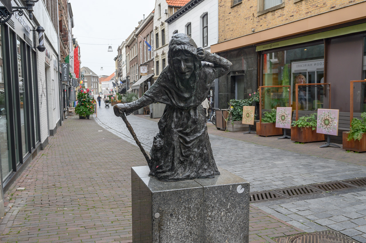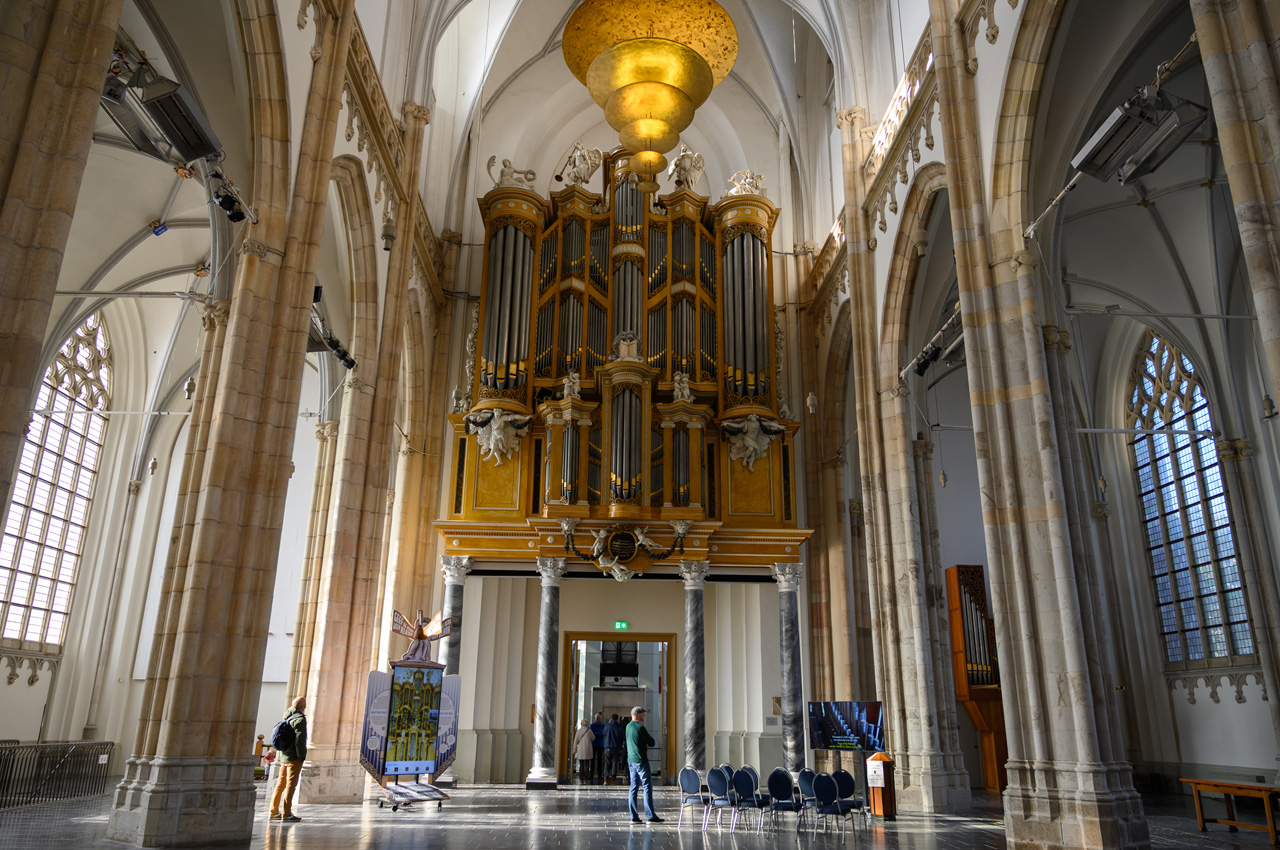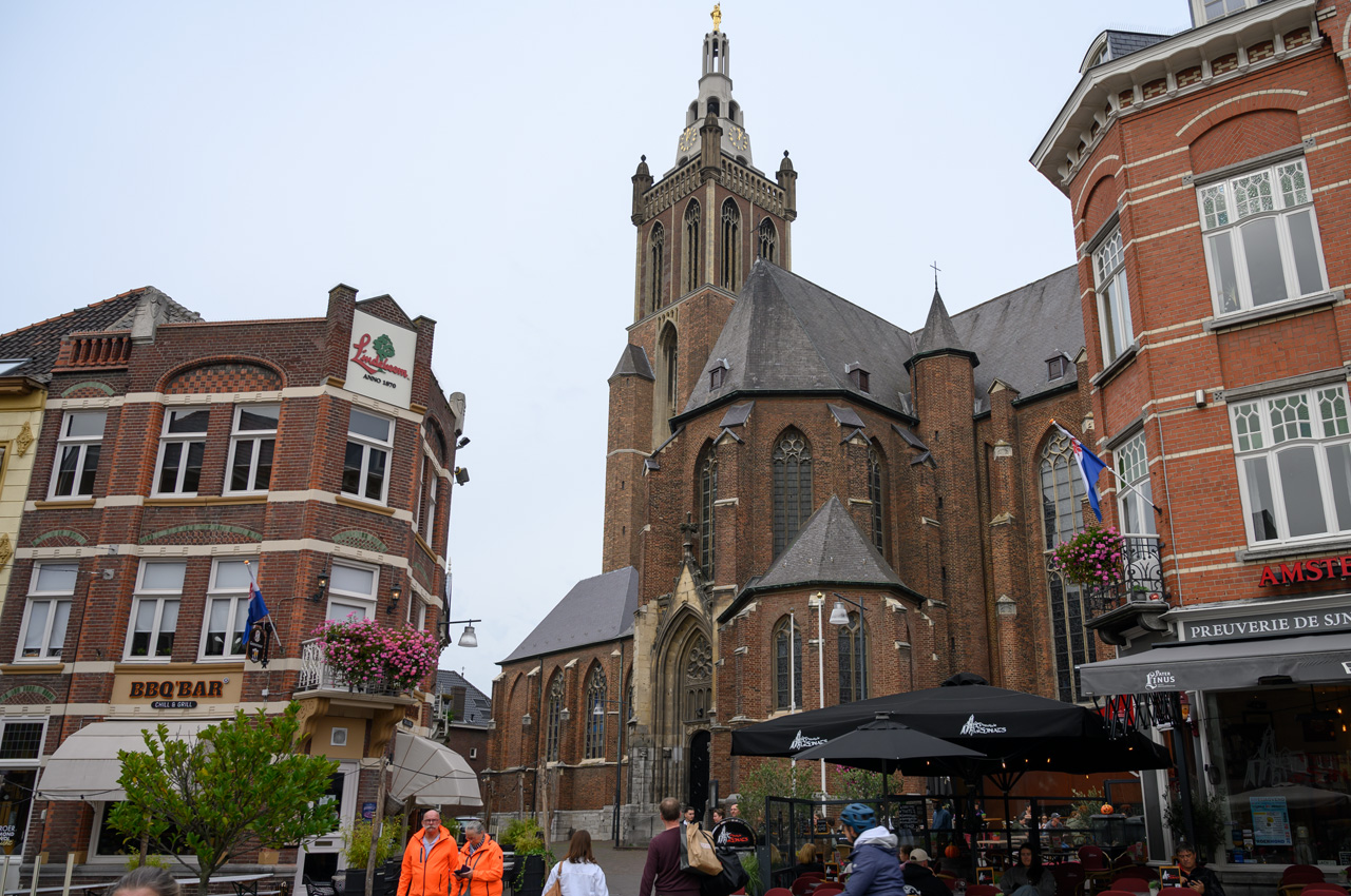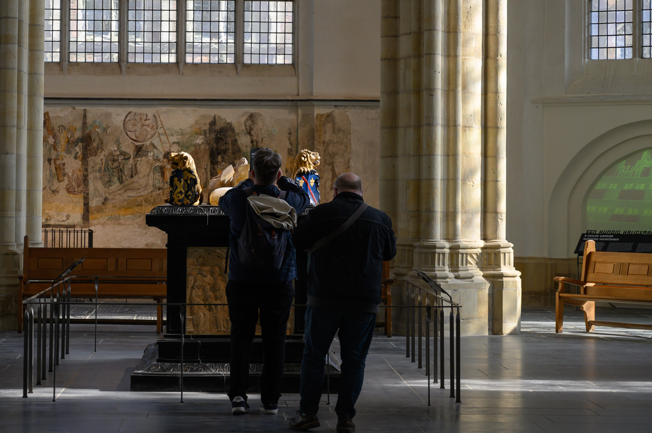 Gegen 12:00 Uhr sind wir auf unseren NIU gestiegen und Richtung Breda gestartet. Als Ziel habe ich Ginneken Stadshus eingegeben, in dem guten Glauben, dass das das Rathaus von Breda ist. Wir waren ziemlich enttäuscht, weil wir dort glaubten am Marktplatz zu sein und fanden das alles ziemlich mager für die gelobte Stadt Breda. Unser Navi hat uns ein Wasserschloss angeboten. Da ich nichts besseres wusste, habe ich das gewählt. Wir landeten beim Franse Tuin - Landgoed Bouvigne. Das Schloss kann man nicht besichtigen, aber den schönen Garten kann man ansehen. Der Zugang ist über ein modernes Gebäude der Waterschap Brabantse Delta, eine Unternehmung, die für Schmutzwasserregenerierung in Brabant zuständig ist. Der Park war sehr schön, aber auch nicht unbedingt die Lösung für Susannes kaputten Fuß. Als wir wieder mit dem NIU weiter wollten, habe ich auf dem Navi das eigentliche Rathaus von Breda entdeckt. Jetzt erst habe ich realisiert, das wir bis jetzt gar nicht im Zentrum bzw. der Altstadt von Breda waren. Die liegt mehr als 2 km nördlich von dem Stadtteil Ginneken, wo wir uns herumgetrieben haben. Jetzt führte uns das Navi endlich zum großen Markt und der ist der Mittelpunkt der Altstadt von Breda. Dort haben wir unseren NIU stehen lassen und haben als erstes die Onze-Lieve-Vrouwekerk besichtigt. Dafür mussten wir 4,-€ Eintritt pro Person zahlen. Die Kirche wir dals Kirche nur noch im Chor betrieben, der Rest ist Ausstellungsraum. Die Kirche enthält viele Grabgelege unter anderem die der Grafen zu Nassau. Nach der Kirchenbesichtigung haben wir noch eine Runde um den Kirchplatz und den Marktplatz gedreht. In der Kirche hatten wir erfahren, dass Breda keine Touristeninfo mehr hat. Einen Stadtplan haben wir in der Kirche erhalten. Susanne hat wieder tapfer durchgehalten.