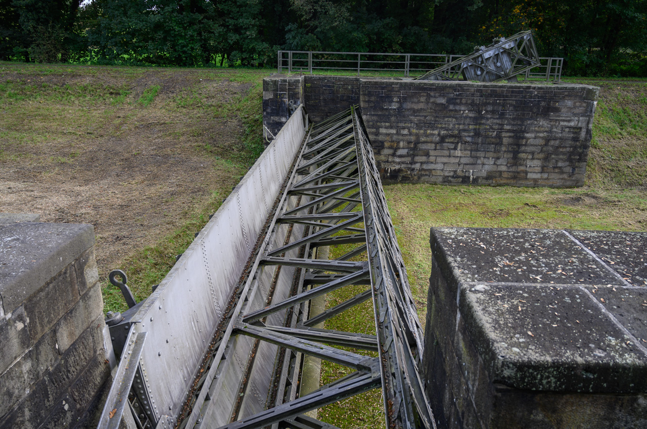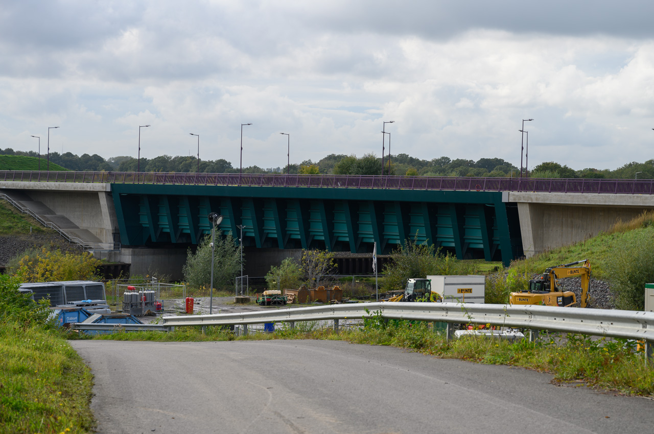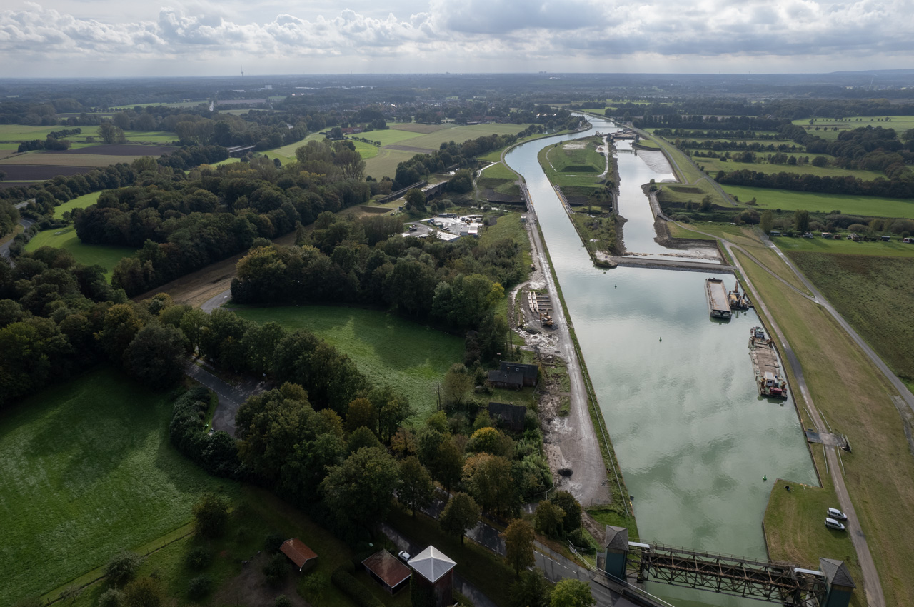 Ich habe am Nachmittag noch einen Spaziergang gemacht zu dem großen Wasserbauprojekt, was in der Nähe des Stellplatzes sich gerade abspielt. Der Dortmund-Ems-Kanal überquert hier in ca. 15 Meter Höhe die Ems in einer Trogbrücke. Die erste Fahrt ist schon seit 1936 außer Betrieb. Ein Teil davon ist der heutige Yachthafen. Für moderne Großraumbinnenschiffe ist aber jetzt auch die 1936 in Betrieb gegangene neue Trogbrücke zu klein. Bis 2030 soll nun eine neue Kanalbrücke mit zwei Trögen erbaut werden. Dazu hat man in diesem Jahr eine Umfahrung in Betrieb genommen. Ich war natürlich neugierig wie das alles vor Ort aussieht. Das Fotografieren der ersten Trogbrücke, eine absolute Top Ingenieursleistung, war gar nicht so einfach. Ich musste einen steilen Hang runter zur Ems klettern. Die historische Brücke ist eine Viaduktbauweise und steht unter Denkmalschutz. Leider hat sie die Natur schon ganz schön zurück erobert. Sträucher und Bäume verdecken die Sicht.