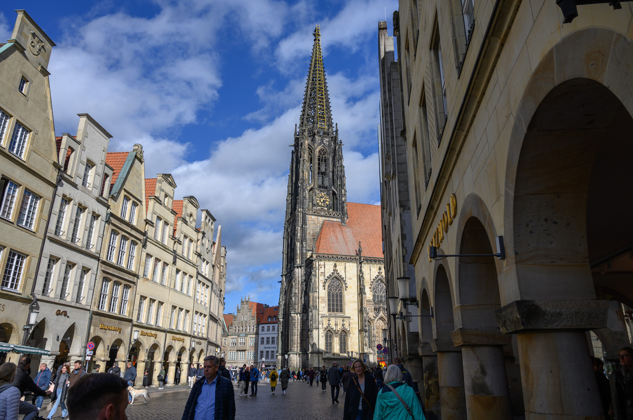 Gegen 12:00 Uhr sah es dann auch tatsächlich danach aus. Ich habe den NIU aus der Garage geholt und wir sind in Richtung Altstadt von Münster gestartet. Die angedrohten 13km haben wir problemlos geschafft, als Ziel hatte ich die Touristeninfo eingegeben. Den NIU haben wir in der Asche abgestellt, von da beginnt auch die Fußgängerzone. Auf dem Weg zur Touristeninfo waren wir noch in der Franziskanerkirche. Sie wird nicht mehr sakral genutz. In der Mitte des ehemaligen Kirchenschiffes gibt es ein Kunstwerk. Ein äußerst rühriger Aufseher hat uns erklärt, um was es sich hier eigentlich handelt. Aus der mitte der Kuppel hängt ein Pendel heraus mit einer Stahlkugel, die durch einjen pulsierenden Ringtrafo angetrieben wird. Auf einem Ring auf dem Boden sind Gradzahlen eingegeben. Anhand der Lageveränderung der Kugel beim Pendel, kann man die Erddrehung nachweisen. Die Kugel wandert mit ihren Ausschlägen auf dem Gradring, je nach Uhrzeit. Äußerst interessant und gut, dass uns das erklärt wurde, wir hätten sonst nicht verstanden, was das zu bedeuten hat. In der Touristeninfo haben wir uns mit einem Stadtplan ausgestattet, so haben wir auch schnell das historische Rathaus gefunden, ein sehr erstaunliches Gebäude oder besser gesagt Gebäudekomplex. Der Rathausturm steht komplett separat. Über den Prinzipalmarkt ist man an der St. Lamberti Kirche. Die Kirche enthält viele Epitaphe der Honorigen dieser Stadt. Wir haben erst durch die Ausgestaltung gemerkt, dass wir nicht im Dom sind, wovon wir beim betreten von ausgegangen sind. Von hier aus ging es zum Domplatz, wo gerade Wochenmarkt war. Hier tobte das Leben und man war förmlich gezwungen, im Mainstream mitzuschwimmen. Der Dom hat uns sehr beeindruckt, dieses Mal war es auch wirklich der Dom, besonders die astronomische Uhr, ein kleines technisches Wunderwerk. Nach der Dombesichtigung waren wir nochmal auf dem Wochenmarkt. Da war ein Stand aus den Niederlanden mit Poffertjes. Da konnten wir natürlich nicht widerstehen. Vom Domplatz aus sind wir noch zu der Liebfrauen-Überwasserkirche gelaufen. Die Kirche ist eher schlicht. Wir haben uns nicht lange darin aufgehalten, da wurde gerade eine Hochzeit vorbereitet. Von der Kirche aus sind wir im Bogen durch die schönen Fußgängerzonen zurück zu unserem NIU gelaufen. Das war ein ganz schön strammes Pensum für Susanne. Mit dem NIU sind wir noch zum Schloss gefahren. Vor dem Schloss war ein riesiger Rummel und für den Parkplatz sollte man 10,-€ für die Nutzung zahlen. Ist wohl ein bisschen heftig. Wir haben unseren NIU in einer Seitenstraße abgestellt und sind zum Schloss gelaufen. Schon wieder Laufen für Susanne, sie hat aber tapfer durchgehalten. Das Schloss ist in einem superguten Zustand und sieht sehr majestätisch aus. Für den dahinterliegenden botanischen Garten war es dann aber doch etwas viel für Susannes Fuß. Den heben wir uns für einen späteren Besuch mal auf. Auf dem Rückweg zum Womo haben wir an einem ALDI noch einen Zwischenstop eingelegt um uns mit frischen Lebensmitteln zu versorgen.