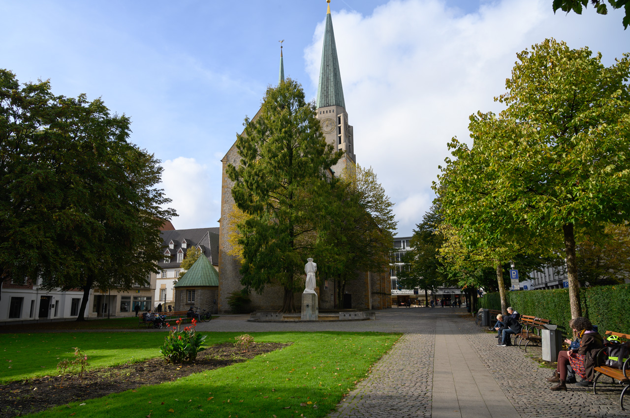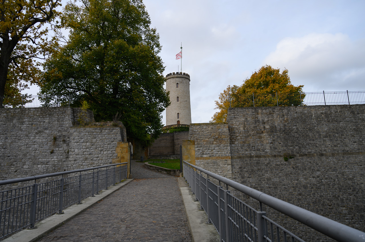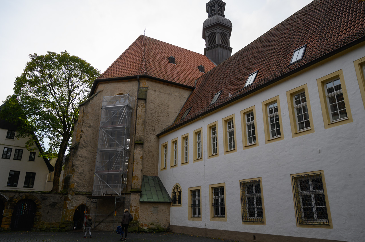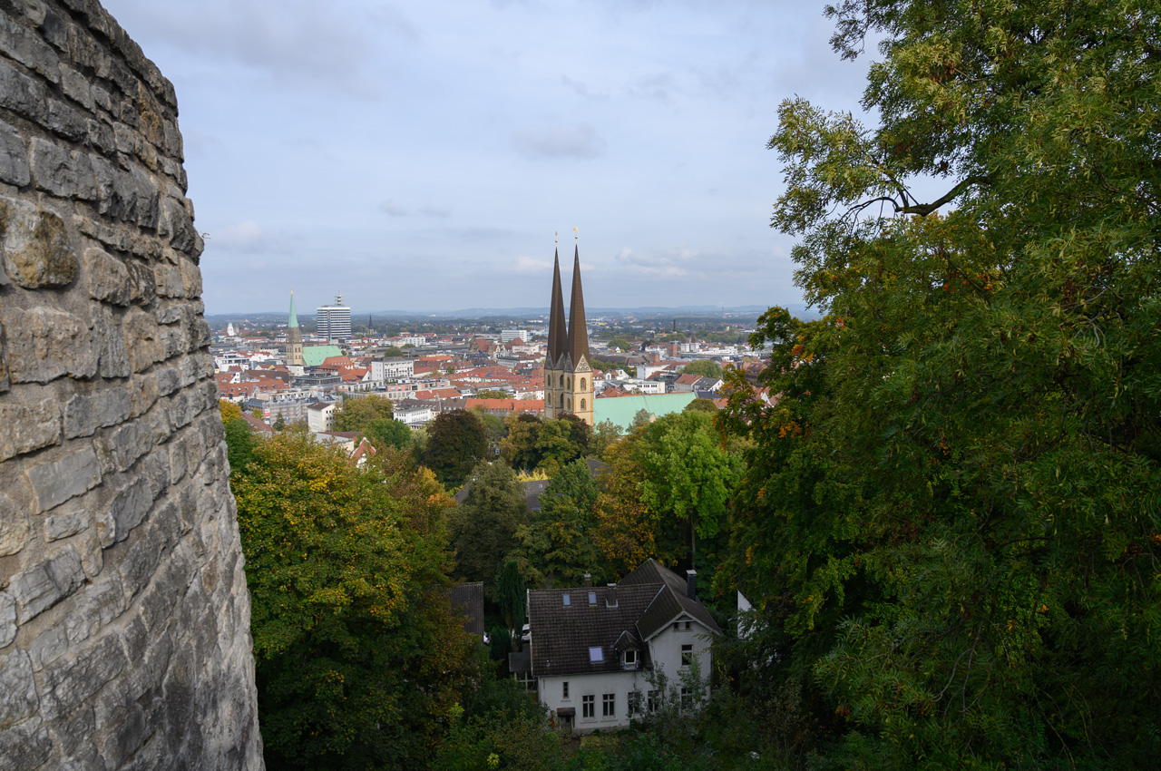 Die knackigen Brötchen haben es aber belohnt. Nach dem Frühstück löste sich der Nebel relativ schnell auf und es kam zeitweise sogar die Sonne durch. Gegen 12:00 Uhr sind wir auf den NIU gestiegen und in die Altstadt gefahren. Als Ziel hatte ich die Touristeninfo eingegeben. Sie ist im neuen Rathausgebäude, wobei das alte, historische Rathaus gleich nebenan ist. Von hier aus sind wir vorbei an der Altstädter Nicolaikirche auf den Alten Markt. Dort haben wir längere Zeit auf einer Bank mit Vivien-Sara telefoniert, aber auch den Anblick der schönen historischen Bürgerhäuser genossen. Wie wir später feststellen mussten, ist es auch der schönste Bereich von Bielefeld. In dem Rest der Innenstadt hat auch hier der zweite Weltkrieg furchtbare Spuren hinterlassen. Die meisten Gebäude sind Nachkriegsbauten mit der für diese Zeit typischen, minimalistischen Architektur, praktisch, quadratisch, gut. Mit Hilfe unserer Handys haben wir einen Weg zu einem Deichmannladen gefunden. Susanne brauchte neue Schuhe, die ihren ramponierten Fuß besser stützen und ihr das Laufen etwas schmerzfreier machen. Sie hat was passendes gefunden und das war auch im Rahmen ihrer Preisvorstellung. Die neuen Schuhe hat sie gleich anbehalten und die alten konnten wir in einem Müllkasten entsorgen. Sie meinte, es läuft sich damit gleich besser. Wir sind von dem Einkaufszentrum aus wieder zurück zur Altstadt und da haben wir uns noch die Jodokuskirche vom ehemaligen Kloster angesehen. Leider ist dort der Chor gesperrt und mit Folien zugehangen, weil dort Restaurierungsarbeiten durchgeführt werden. Die Kirche war baulich sehr interessant, weil sie noch den kompletten Kreuzgang hat und eine sehr sehenswerte Orgel. Von hier aus sind wir wieder vorbei an der Altstädter Nicolaikirche zurück zum Rathauskomplex gelaufen, wo unser NIU schon auf uns wartete. Er hat uns dann auf den Sparrenberg hoch gebracht, wobei ihm auf den letzten Metern fast die Puste ausging. Das sind verrückte Straßen, mit Steigungen von bis zu 20%. Dafür ist der zarte Stadtroller nicht gebaut. Auf dem Sparrenberg steht das Wahrzeichen von Bielefeld, die Sparrenburg oder besser gesagt, dass was noch von ihr übrig ist. Man hat von da oben eine tolle Aussicht auf die Stadt Bielefeld. Runter hat uns der Roller schneller gebracht, wobei er ja auf der Zufahrt zum Womo nochmal bergsteigen musste. Aber er hat es erfolgreich bis zum Womo geschafft. Susanne hatte jetzt auf ihrer Fitnesuhr über 7.000 Schritte. Donnerwetter, es geht aufwärts mit meiner tapferen Frau.