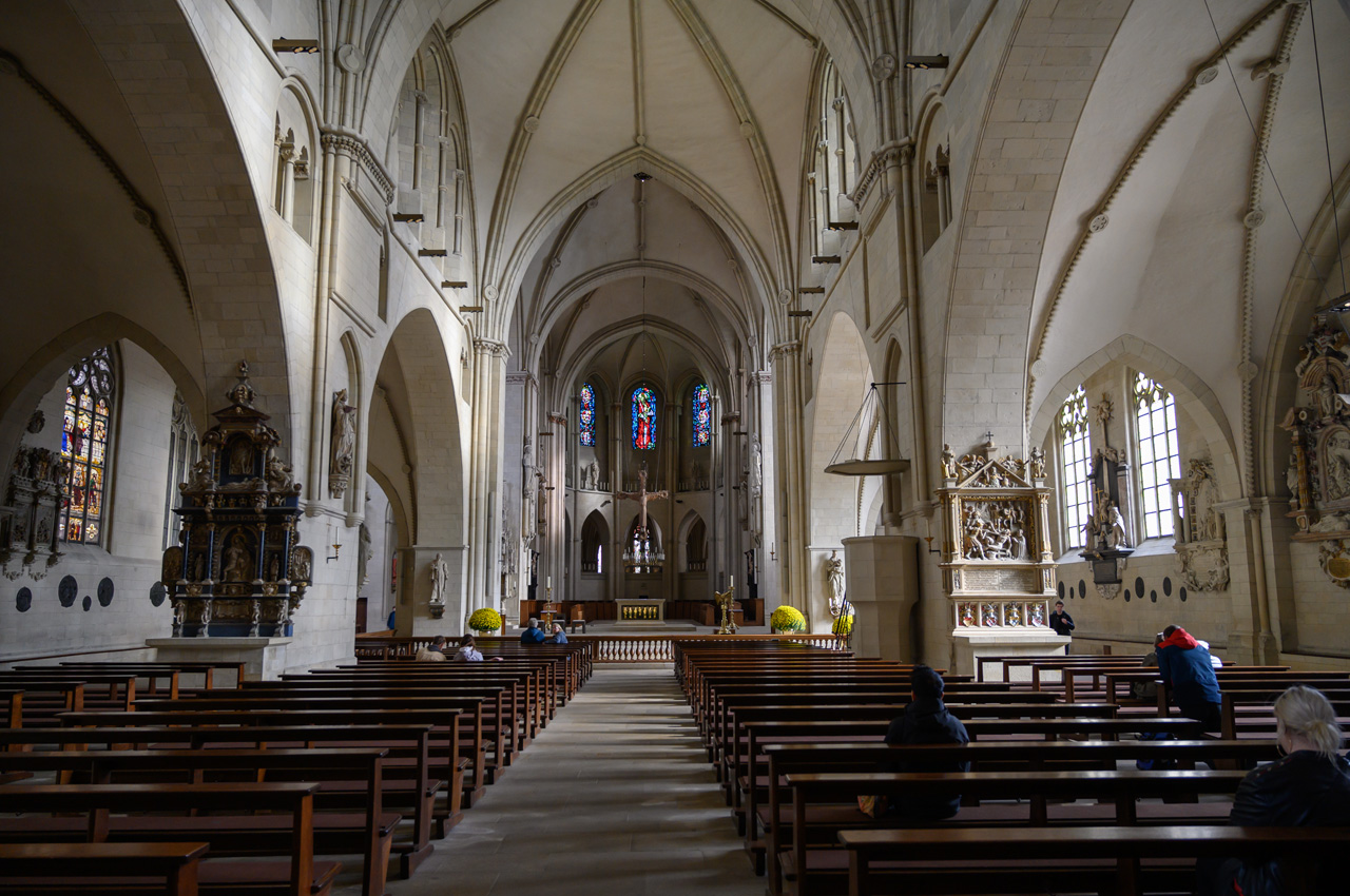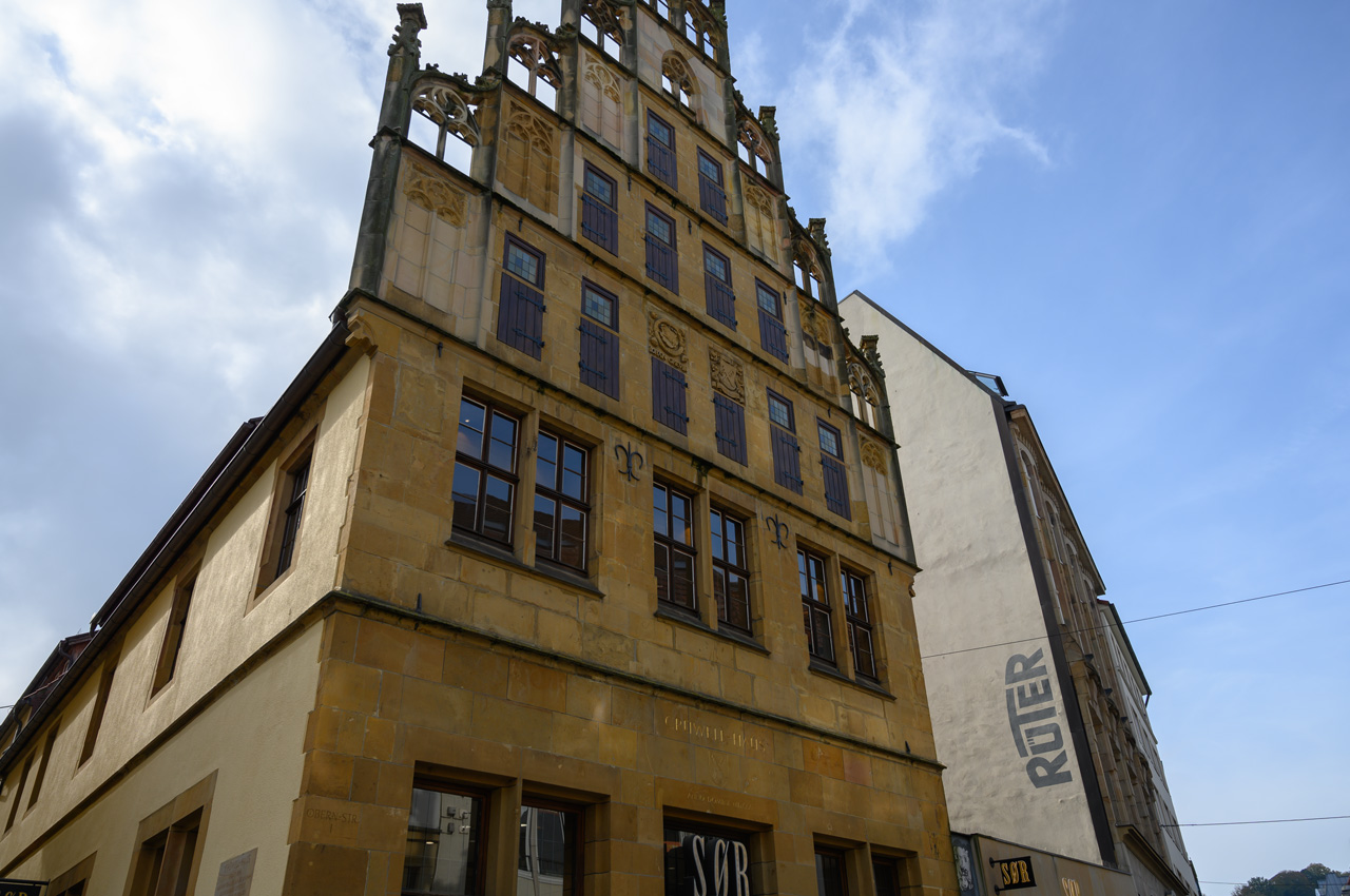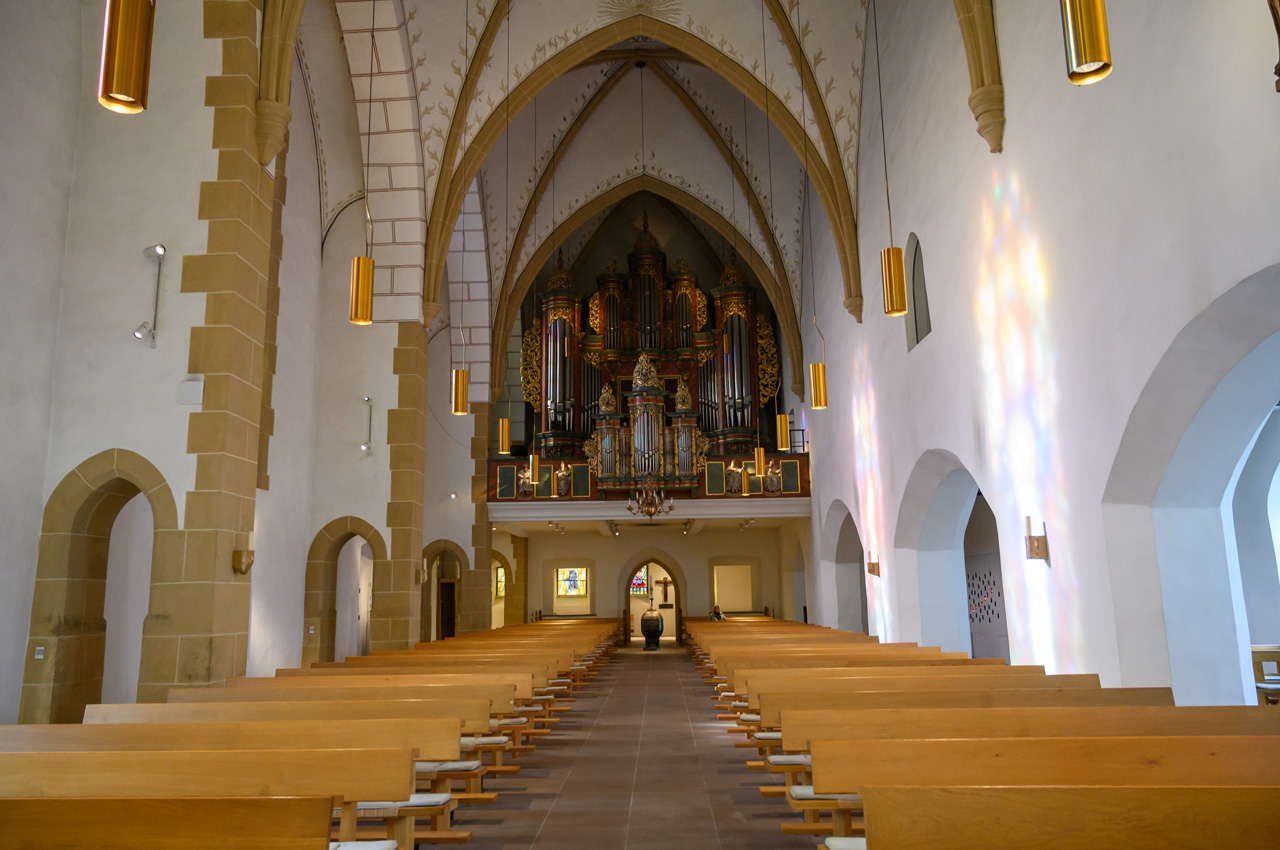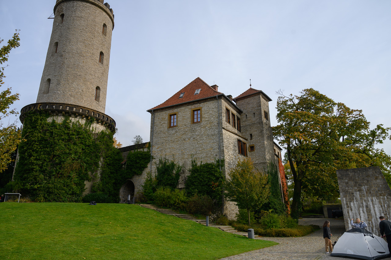 Die knackigen Brötchen haben es aber belohnt. Nach dem Frühstück löste sich der Nebel relativ schnell auf und es kam zeitweise sogar die Sonne durch. Gegen 12:00 Uhr sind wir auf den NIU gestiegen und in die Altstadt gefahren. Als Ziel hatte ich die Touristeninfo eingegeben. Sie ist im neuen Rathausgebäude, wobei das alte, historische Rathaus gleich nebenan ist. Von hier aus sind wir vorbei an der Altstädter Nicolaikirche auf den Alten Markt. Dort haben wir längere Zeit auf einer Bank mit Vivien-Sara telefoniert, aber auch den Anblick der schönen historischen Bürgerhäuser genossen. Wie wir später feststellen mussten, ist es auch der schönste Bereich von Bielefeld. In dem Rest der Innenstadt hat auch hier der zweite Weltkrieg furchtbare Spuren hinterlassen. Die meisten Gebäude sind Nachkriegsbauten mit der für diese Zeit typischen, minimalistischen Architektur, praktisch, quadratisch, gut. Mit Hilfe unserer Handys haben wir einen Weg zu einem Deichmannladen gefunden. Susanne brauchte neue Schuhe, die ihren ramponierten Fuß besser stützen und ihr das Laufen etwas schmerzfreier machen. Sie hat was passendes gefunden und das war auch im Rahmen ihrer Preisvorstellung. Die neuen Schuhe hat sie gleich anbehalten und die alten konnten wir in einem Müllkasten entsorgen. Sie meinte, es läuft sich damit gleich besser. Wir sind von dem Einkaufszentrum aus wieder zurück zur Altstadt und da haben wir uns noch die Jodokuskirche vom ehemaligen Kloster angesehen. Leider ist dort der Chor gesperrt und mit Folien zugehangen, weil dort Restaurierungsarbeiten durchgeführt werden. Die Kirche war baulich sehr interessant, weil sie noch den kompletten Kreuzgang hat und eine sehr sehenswerte Orgel. Von hier aus sind wir wieder vorbei an der Altstädter Nicolaikirche zurück zum Rathauskomplex gelaufen, wo unser NIU schon auf uns wartete. Er hat uns dann auf den Sparrenberg hoch gebracht, wobei ihm auf den letzten Metern fast die Puste ausging. Das sind verrückte Straßen, mit Steigungen von bis zu 20%. Dafür ist der zarte Stadtroller nicht gebaut. Auf dem Sparrenberg steht das Wahrzeichen von Bielefeld, die Sparrenburg oder besser gesagt, dass was noch von ihr übrig ist. Man hat von da oben eine tolle Aussicht auf die Stadt Bielefeld. Runter hat uns der Roller schneller gebracht, wobei er ja auf der Zufahrt zum Womo nochmal bergsteigen musste. Aber er hat es erfolgreich bis zum Womo geschafft. Susanne hatte jetzt auf ihrer Fitnesuhr über 7.000 Schritte. Donnerwetter, es geht aufwärts mit meiner tapferen Frau.