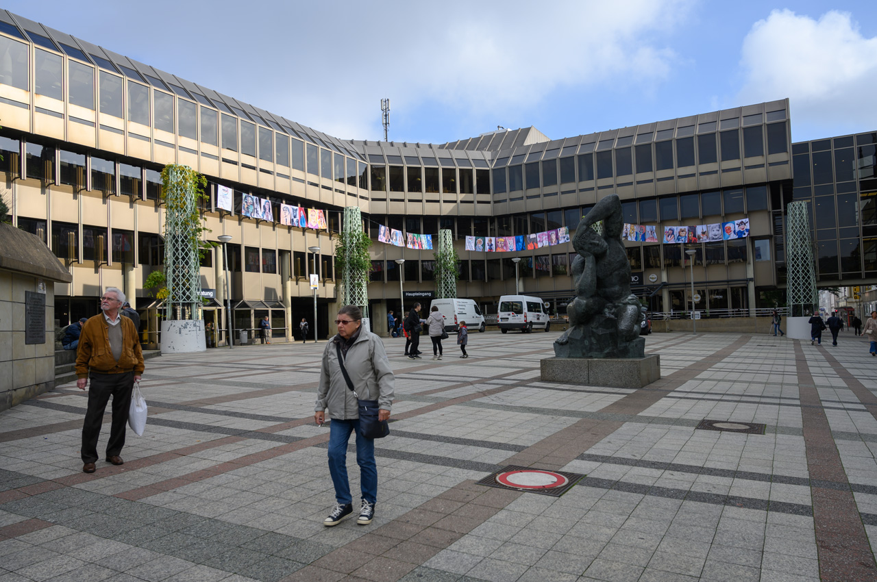 Wir sind mit dem NIU zum Bahnhof Oberbarmen gefahren. Dort hat Susanne für uns eine Tageskarte für ganze 11,40€ besorgt. Die Züge verkehren auf der Schwebebahnstrecke alle 4 Minuten. Also wir mussten nicht lange warten und schon konnten wir einsteigen. Weil es ja der Endbahnhof war, haben wir auch einen guten Sitzplatz erhalten. Es ist ein gemütliches Fahren mit der Schwebebahn in luftiger Höhe. Da kann man in die Wohnung der vorbeiziehenden Häuser schauen. Zu meinem großen Erstaunen, stehen sehr viele Wohnungen leer, teilweise ganze Häuserzeilen. Zugegeben, es sind sicher nicht die attraktivsten Wohnungen, aber dafür, dass wir so einen angeblichen Wohnungsnotstand haben, schon verwunderlich. Wir sind bis zur Endstation gefahren. Da dort nichts sehenswertes für uns war, sind wir auf der anderen Seite gleich wieder zurück gefahren. Dieses mal sind wir aber am Hauptbahnhof ausgestiegen, der liegt etwa auf der Hälfte der Gesamtstrecke. Am Hauptbahnhof tobt das Leben von Wuppertal. Es gibt hier mehrere Fußgängerzonen, von denen allerdings keine uns so richtig begeistern konnte. Sie haben alle samt keinen Charme. Zweckmäßig, aber ohne Flair. Nachdem Susanne ihren Bargeldvorrat aufgetankt hatte sind wir wieder in die Bahn gestiegen in Richtung Endhaltestelle, wo unser NIU brav auf uns wartete. Bis zum Stellplatz waren es nur drei Kilometer. Am Womo angekommen, gab es erst mal Kaffee und Kuchen.