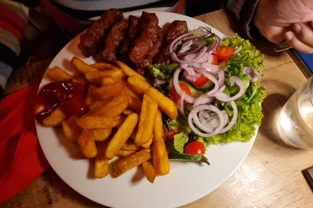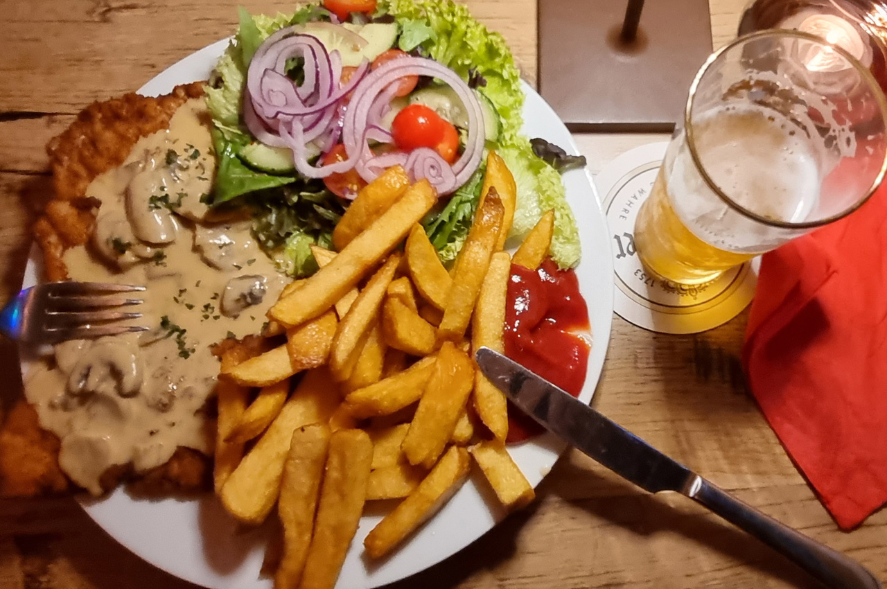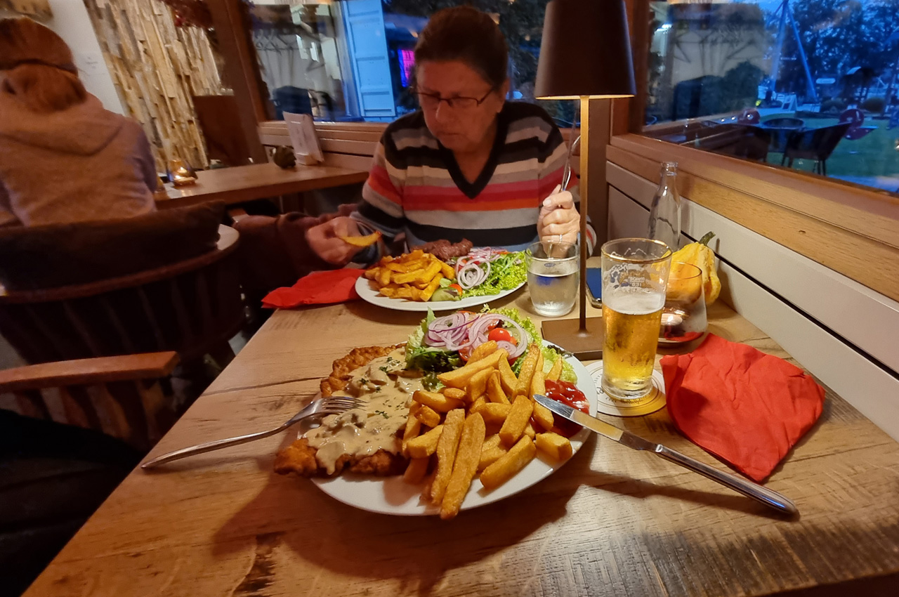Die frischen Brötchen waren gut und haben in der Rezeption schon auf mich gewartet. Es war offensichtlich gut, dass wir uns schon gestern Abend damit abgefunden haben heute nicht in die Altstadt von Münster zu fahren. Bis ca. 15:00 Uhr hat es in einem kontinuierlichem Landregen gewässert. Danach wechselte es immer mal in kleinen Pausen. Um 18:00 Uhr sind wir in die Hafengaststätte gelaufen, da hat es gerade mal nicht geregnet. Das Essen war üppig und geschmacklich gut. Das war das erste mal auf dieser Tour, dass wir auswärts gegessen haben. Als wir wieder im Womo waren, fing es dann aber auch schon wieder an zu regnen.