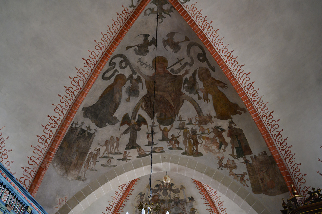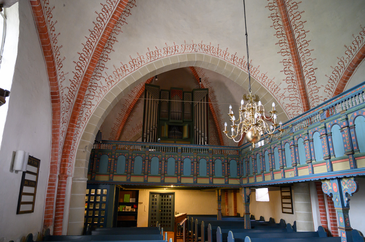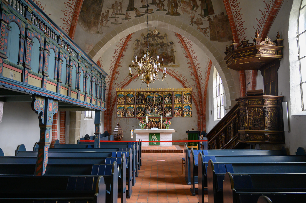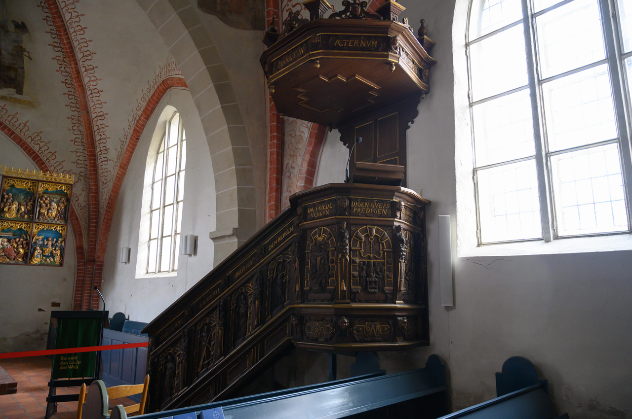 Nach dem Kaffeetrinken sind wir nochmmals zusammen aufgebrochen. Das sehr moderne Rathaus grenzt auch direkt an den Stellplatz und dort soll es auch eine Touristeninfo geben. Die war gar nicht so einfach zu finden. Sie befindet sich in der oberen Etage in einem Büroraum und wird von einer Sachbearbeiterin nebenbei mitgemacht. Die ist allerdings z. Zt. in Urlaub. Eine nette Kollegin hat nach längerem Suchen in einem Schrank wenigsten einen Stadtplan gefunden und zwei Wanderkartenflyer. Die Stadt ist sehr neuzeitlich und hat fast ausnahmslos Nachkriegsgebäude, quadratisch, praktisch und gut. Sie ist aber auch auffällig sauber und gediegen. Die kleine Kirche St. Nikolai haben wir uns ansehen können, sie war überraschenderweise sogar geöffnet. Eine sehr sehenswerte kleine Kirche mit wertvollen Decken- und Wandmalereien. Auch der Altar ist ein historisches Kunstwerk. Wir sind noch ein Stück die Hauptstraße entlang gelaufen und dann zurück zu dem Einkaufscenter. Dort waren wir in Zimmermanns Laden für Restposten und haben so einiges aus dem Krahm der dort angeboten wird mitgenommen. Jetzt ging es aber zurück zum Womo und nun war nur noch faulenzen angesagt. Heute war auch wieder mal ein Tag ohne Regen.