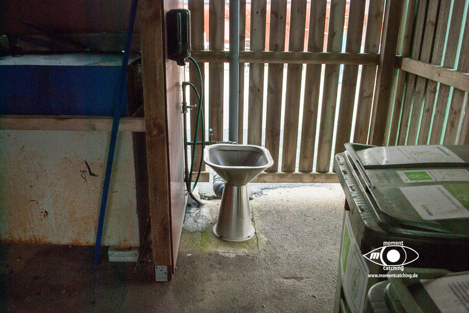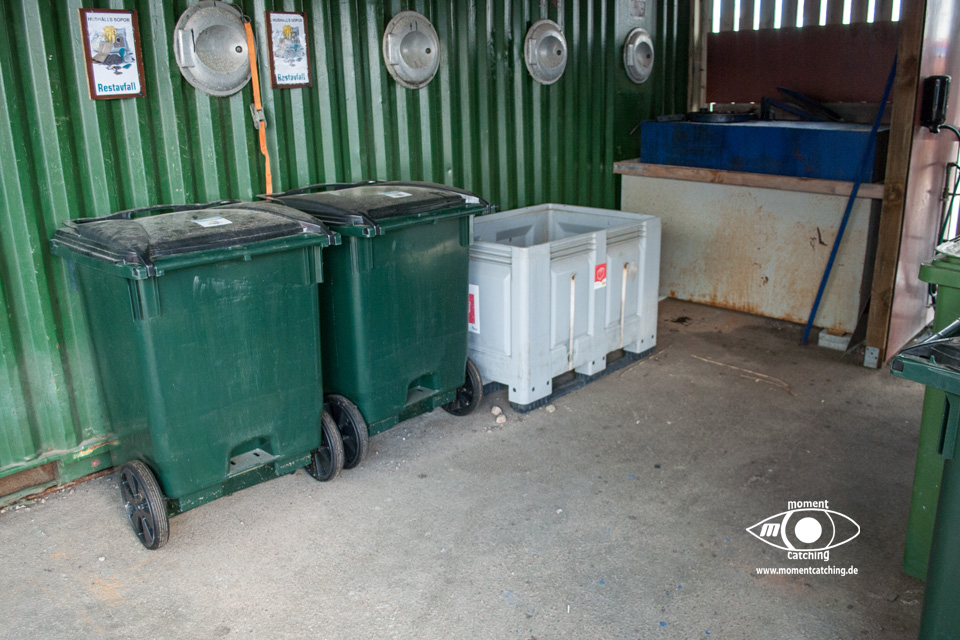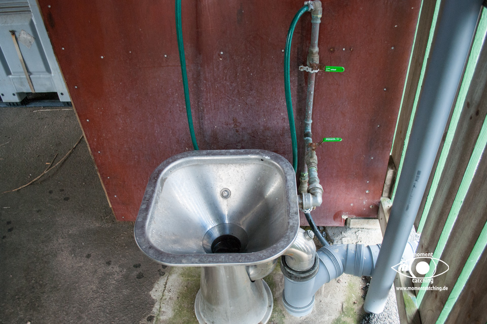 - Die V+E-Möglichkeiten befinden sich am anderen Ende des Hafengeländes. Zum Entsorgen des Grauwassers gibt es einen ausreichend großen Bodeneinlass. Die Fäkalienentsorgung befindet sich im Müllhaus.