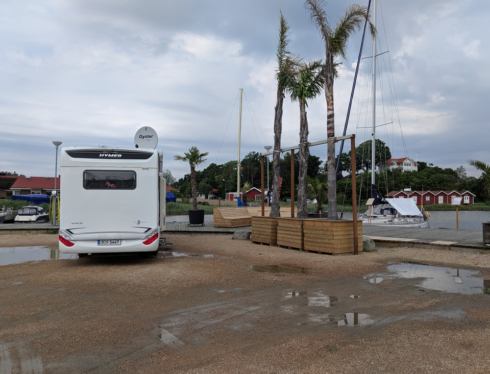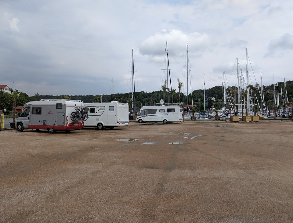 - Die Stellflächen befinden sich mitten in einem großen Yachthafen und sind markiert durch blaue Steine. Bei Regen bilden sich im Bereich am Hafen größere Fützen auf dem Kiesboden.