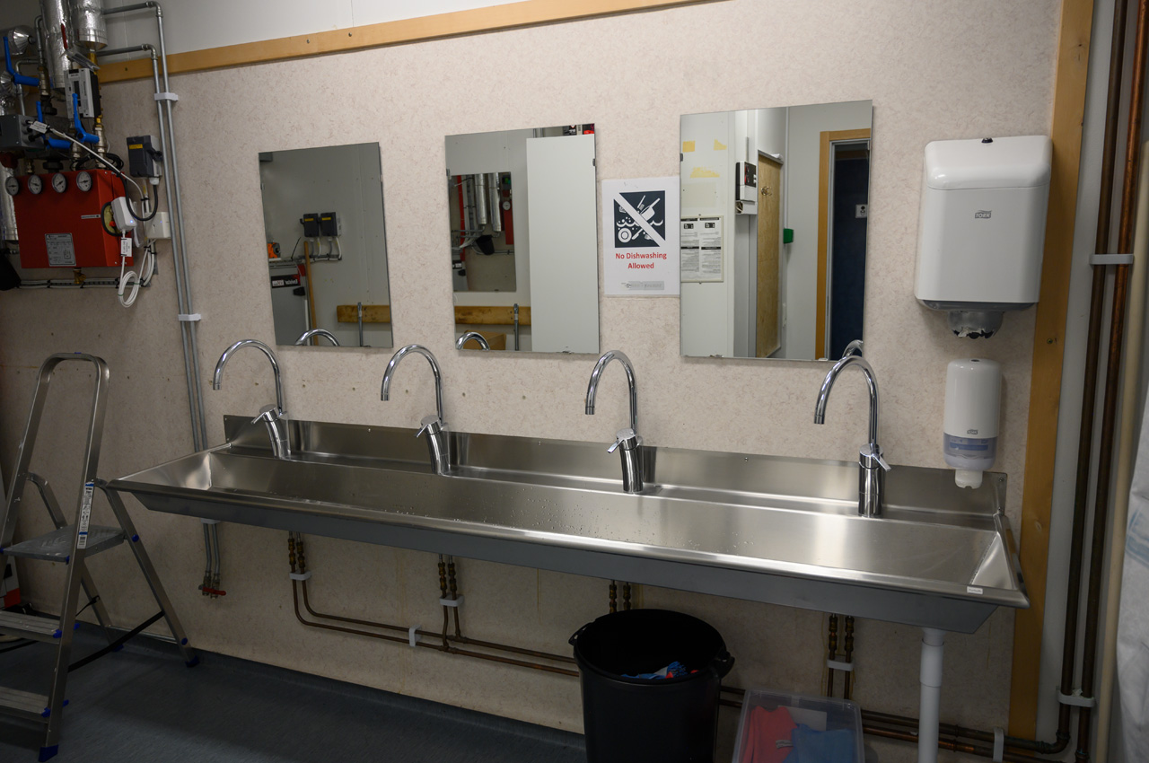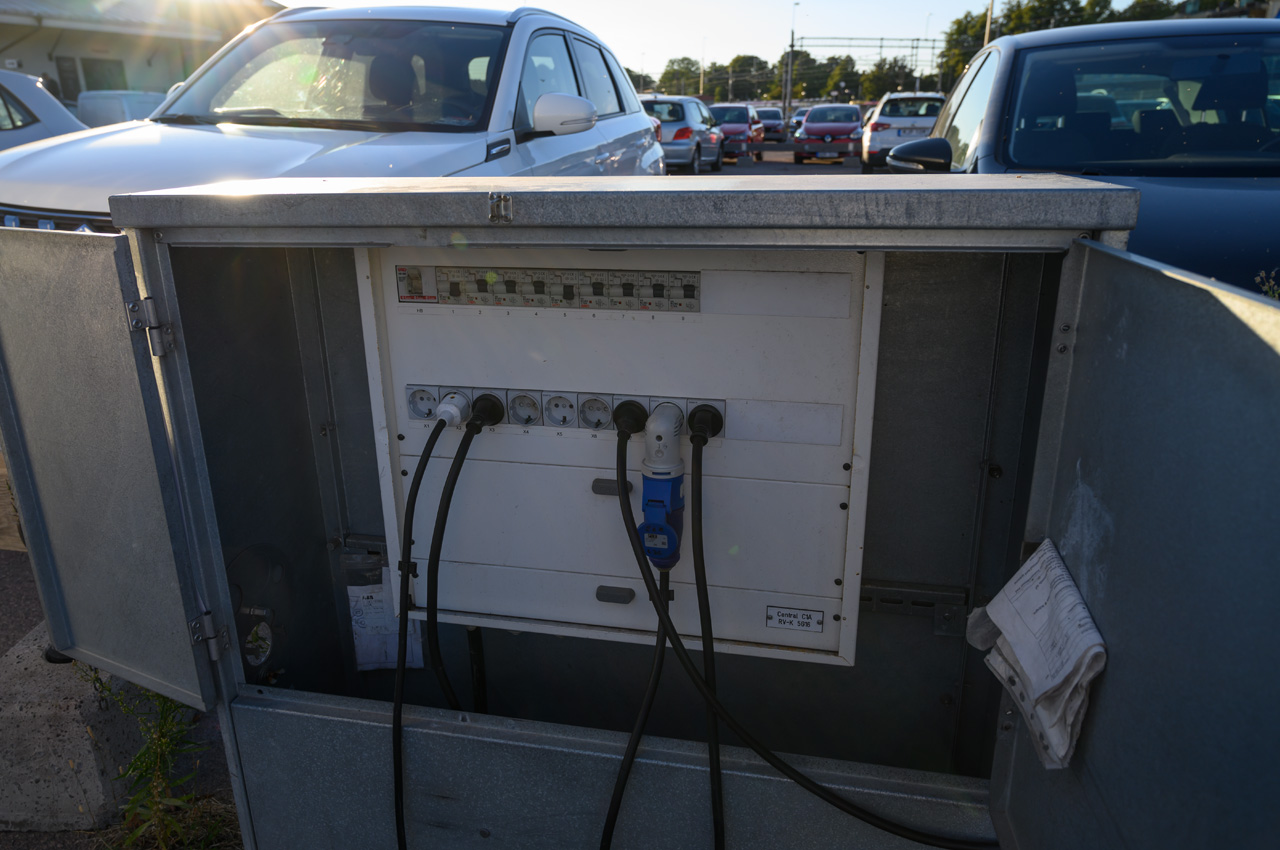 - Die Stromanschlüsse befinden sich in einem Schaltschrank jeweils in der Mitte der beiden Reihen. Die Anschlüsse sind in Schuko-Ausführung und sind jeweils mit 10A abgesichert.