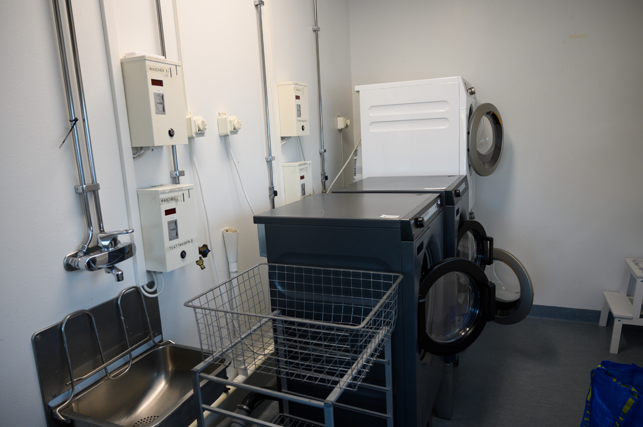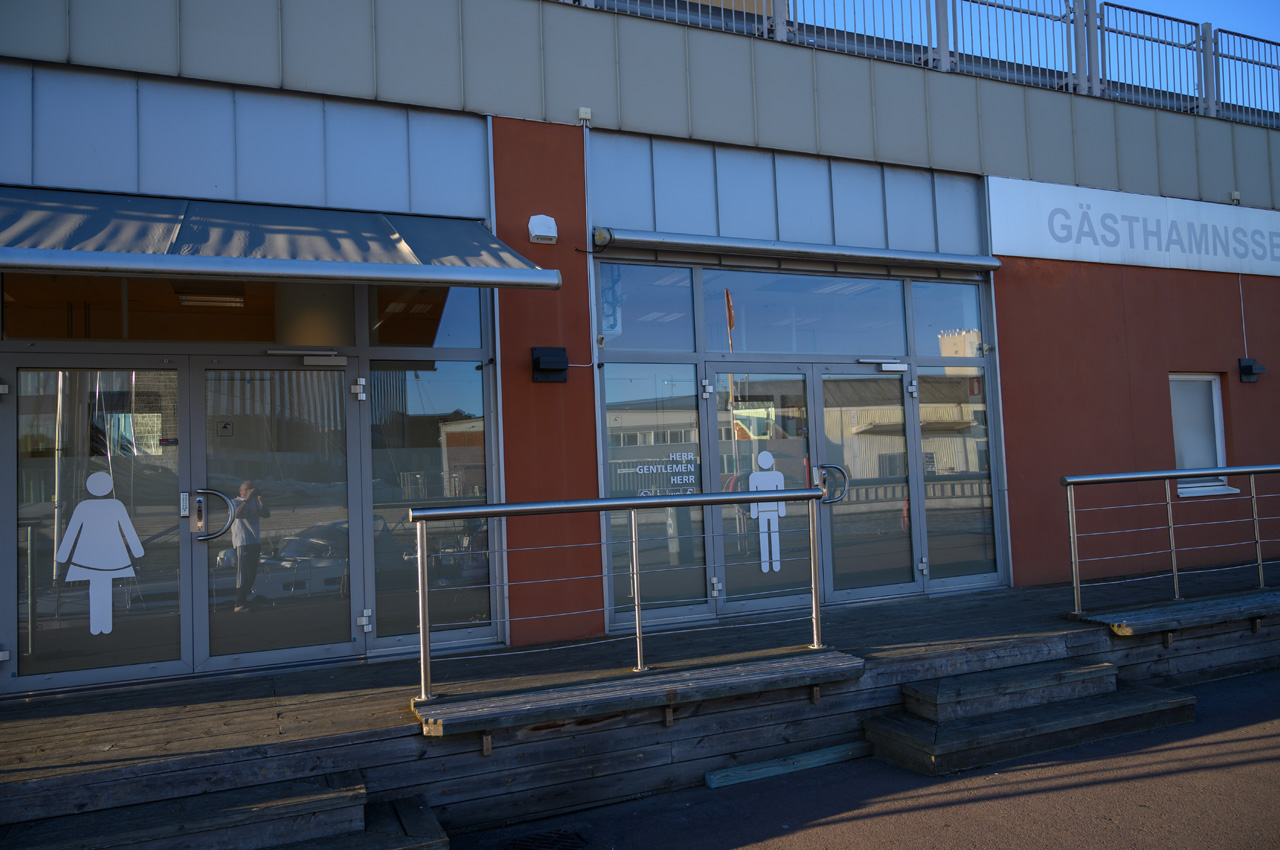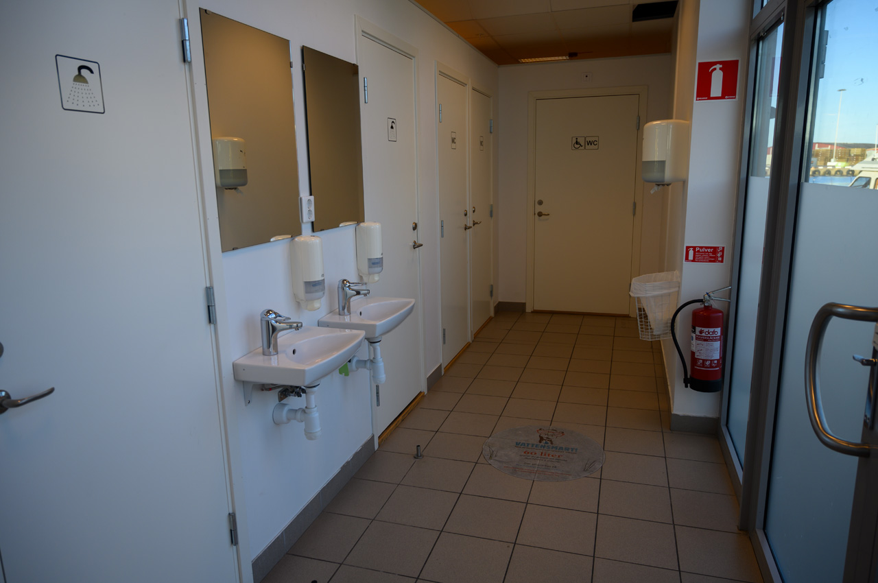 - Im gegenüberliegenden Yachthafen gibt es zwei Sanitäranlagen mit Duschen und Toiletten. Die Sanitäranlagen in dem Gebäude mit der Touristeninfo, gibt es Gemeinschaftsduschen zu je 5 Duschen. Hier gibt es auch eine Waschmaschine und einen Trockner. In den Sanitäranlagen in dem Einkaufsgebäude gibt es je zwei Einzelduschen, aber keine Waschmaschine.