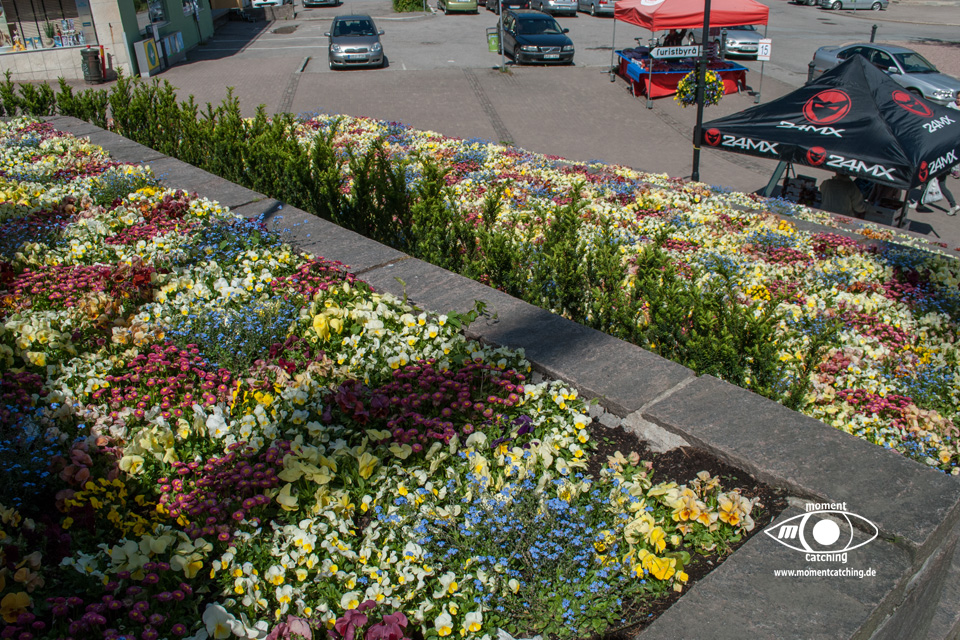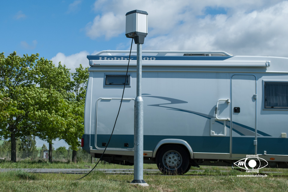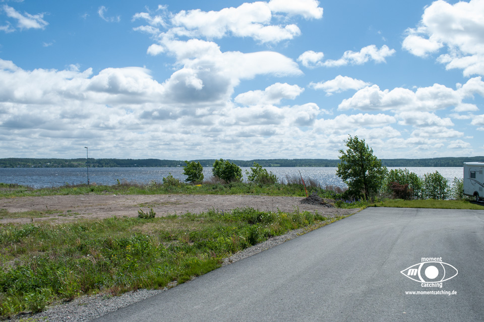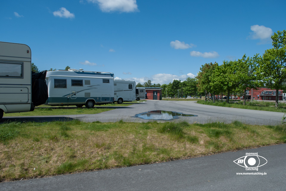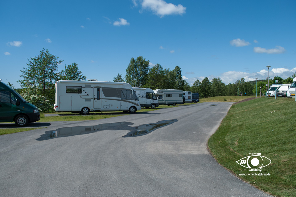 - Das offizielle Gelände ist in zwei Ebenen unterteilt. Die untere Ebene liegt direkt am Wasser, hier gibt es aber keine Elektroanschlüsse. Die obere Ebene liegt ca. 3 Meter höher. Die Stellflächen sind asphaltiert und dazwischen liegen jeweils Rasenflächen. Eine aus unserer Sicht sehr gute Lösung.