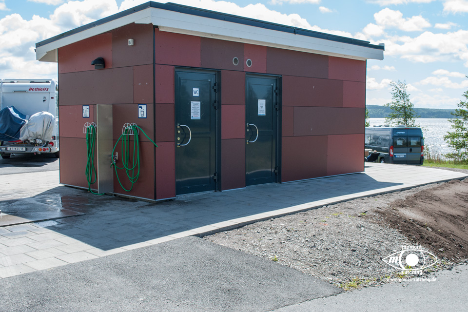 - An der Zufahrt gibt es ein Sanitärgebäude mit Toiletten und Duschen. Die Tür zu den Duschen war verschlossen. In der Behindertentoilette gibt es auch eine Dusche, die man aber nicht benutzen kann ohne die Toilette unter Wasser zu setzen.