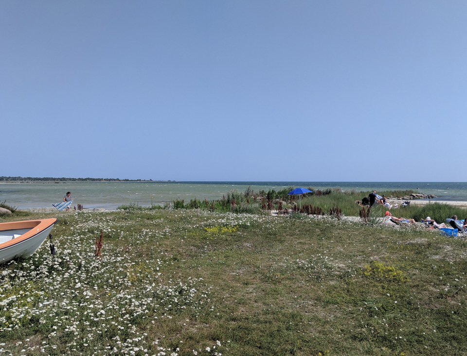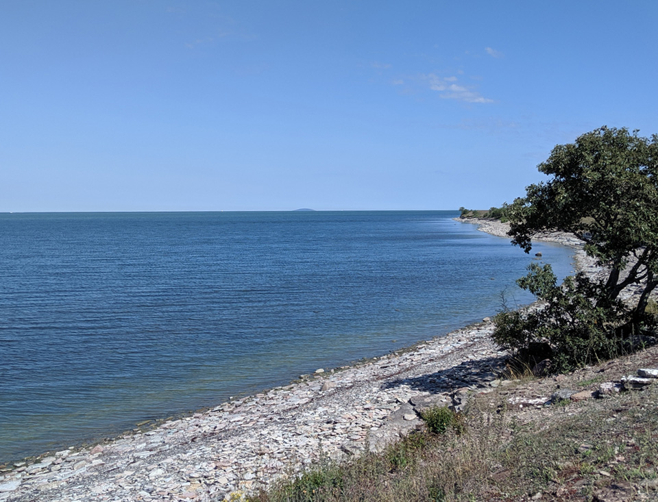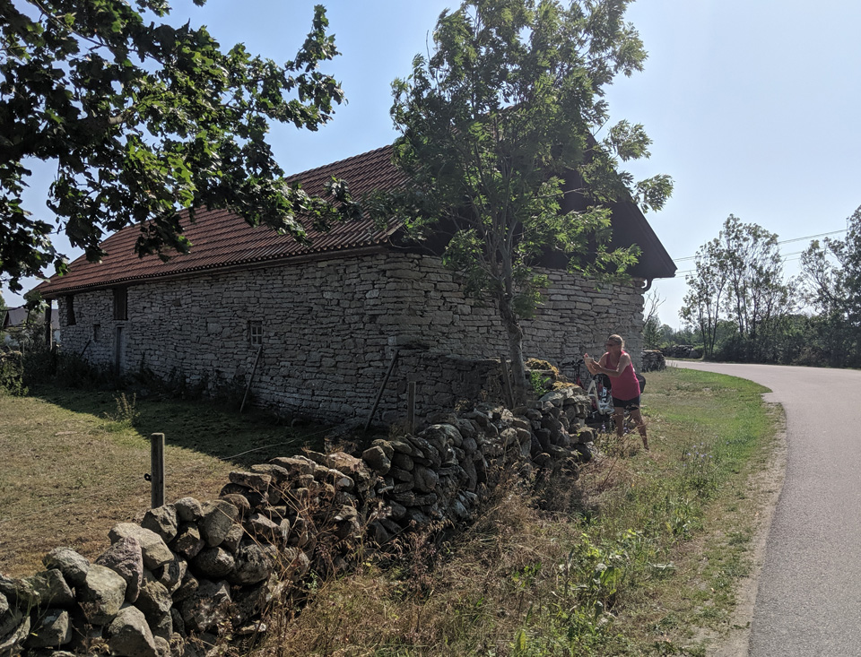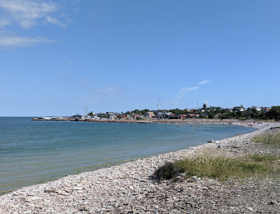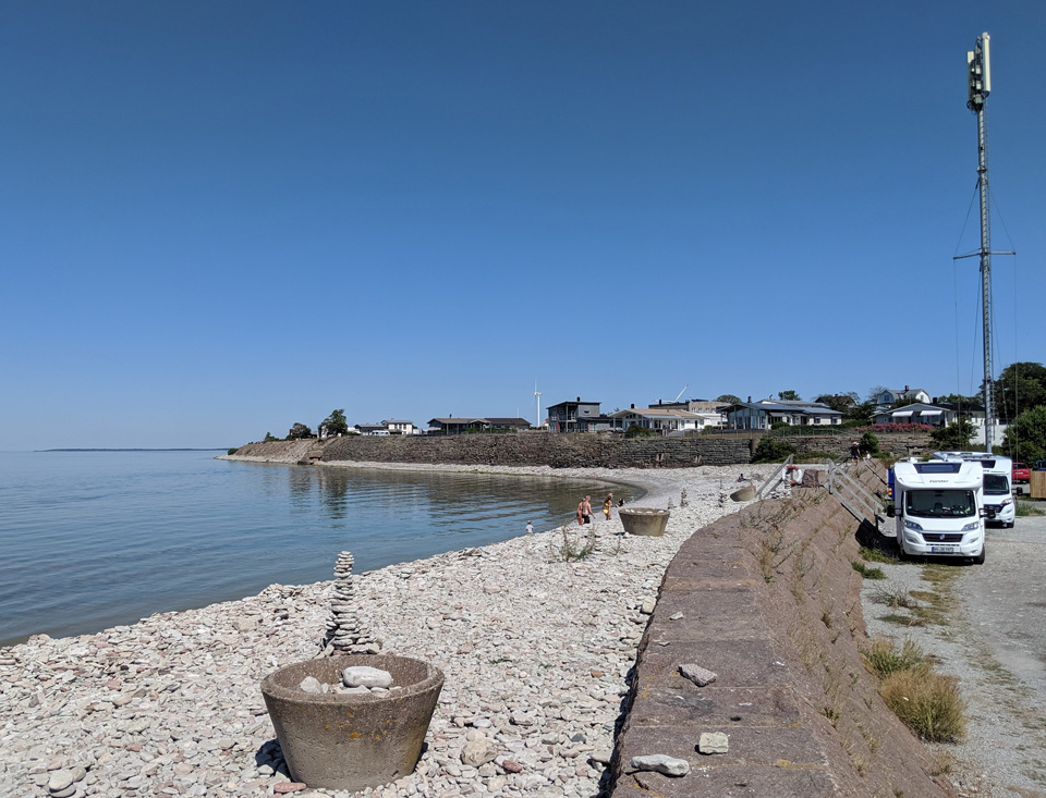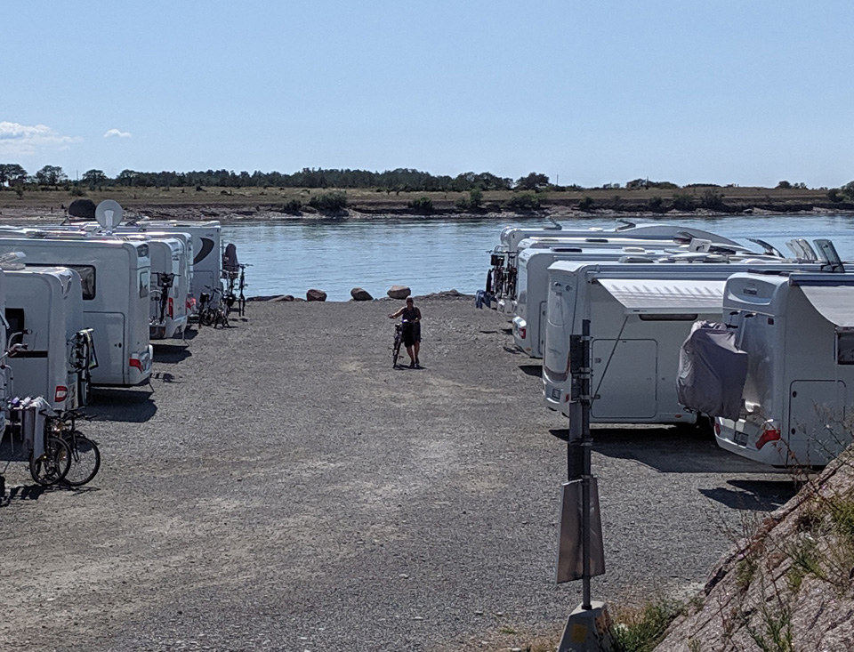 Auf Öland fahren wir besonders gerne mit dem Rad, es gibt kaum Höhenunterschiede, die Straßen sind nur gering befahren oder es gibt gut ausgebaute Radwege und wir lieben die Landschaft. Also war heute auch klar, wir machen wieder eine Radtour. Ich habe uns eine Rundtour zur Ostküste ausgesucht. In dem kleinen Ort Wikegards gibt es einen Campingplatz direkt an der Küste. Da wir nochmal auf Öland umsetzen wollen, lag es nahe, sich diesen Platz anzusehen. Dabei stand sowieso im Vordergrund, der Weg ist das Ziel. Wir haben unterwegs diese schöne Landschaft genossen. Der Campingplatz hat uns gar nicht gefallen. Nur einige wenige Plätze sind wirklich in Ufernähe und dort stand alles kunterbunt durcheinander. Die Stromanschlüsse waren sehr abenteuerlich und es gibt viel zu wenige.