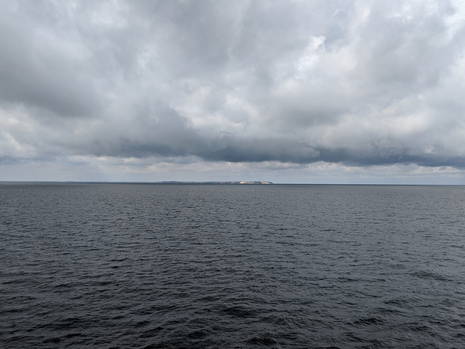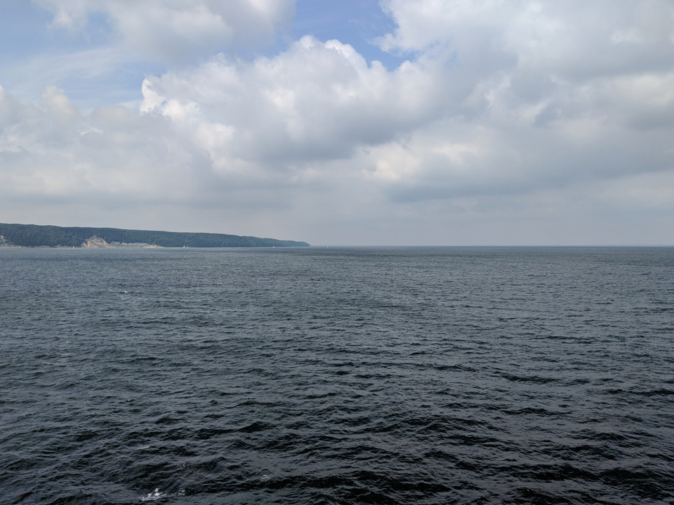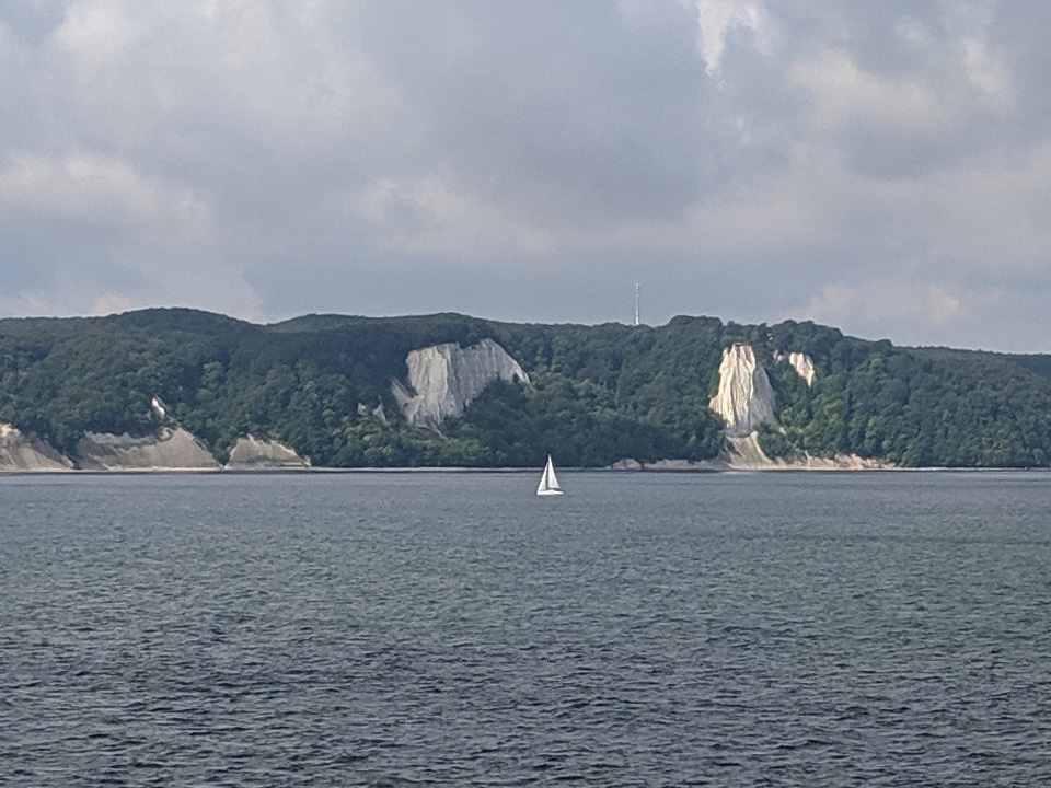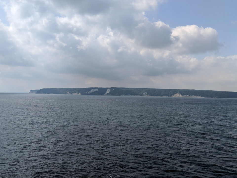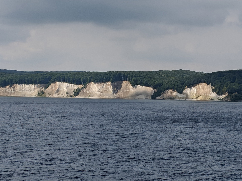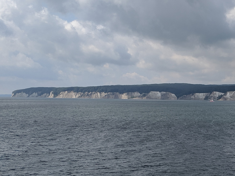 Für die Rückfahrt haben wir die Fähre 07:45 Uhr von Trelleborg gewählt und bei dieser Tour auch mit Frühstück. Das Wetter war deutlich besser als bei der Hinfahrt. Das Frühstück tat uns gut, wobei sich unsere Begeisterung über das Buffet in Grenzen hielt. Aber der Preis, wenn man das Frühstück vorbucht, war angemessen. Wir waren bei dieser Fahrt viel draußen. Am beeindruckensten war die Strecke entlang der Kreideküste von Rügen. Das Wetter spielte auch mit und für kurze Zeit strahlte auch die Sonne die Felsen an, was bei dem Weiß besonders schön aussieht.