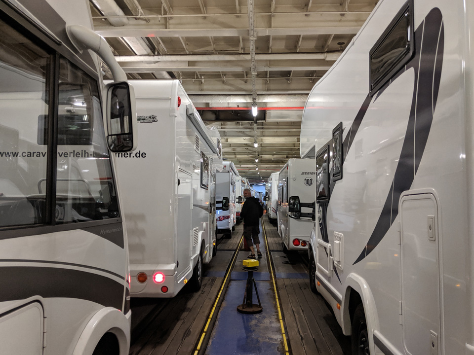 Es ist gut, wenn wir die letzte Nacht vor der Fährfahrt am Stromnetz sind. Während der Fährfahrt ist der Kühlschrank an 12 Volt und da ist es gut, wenn die Batterien voll sind. Da war Höllviken für uns ein geeigneter Stellplatz, zumal er nur 18km vom Fährhafen entfernt lag. Trotzdem hieß es früh aufstehen, denn die Fähre sollte 07:45 Uhr ablegen. Eine Stunde vorher einchecken usw. Wir waren sehr früh da und nach kurzer Wartezeit am Eincheckcounter, ging es ohne weitere Wartezeit direkt auf die Fähre. Das hatten wir bisher so noch nie gehabt. Die armen Einweiser taten uns leid, sie mussten in strömenden Regen draußen ihren Job machen. Um 07:15 Uhr saßen wir schon am Frühstückstisch im Bordrestaurant. Wir hatten einen Fensterplatz reservieren lassen. So saßen wir mit direktem Blick zum Bug. Das Frühstückbuffet ist nicht unbedingt wie in einem Viersternehotel, aber trotzdem mit viel Auswahl. Für die weitere Fahrt hatten wir Liegesitze gebucht, ebenfalls am Fenster. Gut, dass wir immer so weit vorausplanen. Die Überfahrt von etwa 4 Stunden verlief ruhig und als Rügen am Horizont erschien, riss der Himmel auf und es kam sogar die Sonne heraus. Für Liebhaber von Fotos war das besonders gut, weil die Kreidefelsen vor Saßnitz vom Sonnenlicht angestrahlt wurden. Das Verlassen der Fähre und unsere Heimfahrt verliefen problemlos.