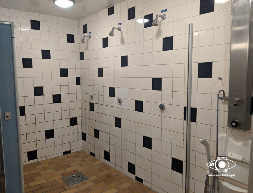 - Die sanitären Einrichtungen sind nicht besonders gut. Die Duschen sind frei in einem Raum. Sie machen einen ungepflegten Eindruck genauso wie die Fäkalienentsorgung. Grauwasser kann nur über Wanne entsorgt werden.