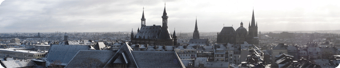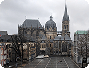 Der ursprünglich als Pfalzkapelle Karls des Großen errichtete Aachener Dom ist das Wahrzeichen der Stadt Aachen. Der Kuppelbau wurde etwa im Jahr 800 vollendet und war rund 400 Jahre der größte freischwebende Kuppelbau nördlich der Alpen. Architektonisches Vorbild war die Basilika San Vitale in Ravenna, die 526 unter Erzbischof Ecclesius noch unter gotischer Herrschaft begonnen und 547 unter Bischof Maximian unter byzantinischer Herrschaft vollendet wurde. Der Marmorthron Karls des Großen steht noch heute im Obergeschoss des Aachener Oktogons, 30 deutsche Könige wurden in der Zeit zwischen 936 und 1531 auf ihm gekrönt. Als ein Meisterwerk gotischer Baukunst gilt der Anbau der monumentalen Chorhalle aus dem Jahr 1414, deren Fenster mit einer Höhe von 27 Metern die höchsten dieser Bauepoche darstellen und mit ihren über 1000 Quadratmetern Glasfläche dem Bau den Spitznamen Glashaus von Aachen einbrachten. Im Zentrum des Chorpolygons steht der goldene Karlsschrein aus dem Jahr 1215 mit den Gebeinen Karls des Großen, hinter dem Altar der berühmte Marienschrein. Er wurde 1239 vollendet und beinhaltet die vier Aachener Heiligtümer, die seit 1349 alle sieben Jahre zur Aachener Heiligtumsfahrt den Pilgern aus aller Welt gezeigt werden. Hauptsächlich aus der Zeit der Hochgotik stammen die zahlreichen Kapellen, die im Laufe der Jahrhunderte angefügt wurden. Die Schatzkammer des Aachener Doms birgt den bedeutendsten Kirchenschatz nördlich der Alpen. Neben dem Lotharkreuz (um 1000) und der silbernen, teils vergoldeten Karlsbüste (etwa 1349) wird hier der Marmorsarkophag ausgestellt, in dem Karl der Große 814 vermutlich bestattet wurde. Das Ensemble aus Dom und Domschatz wurde 1978 als erstes deutsches Kulturdenkmal und zweites Kulturdenkmal weltweit in die Welterbeliste der UNESCO aufgenommen.