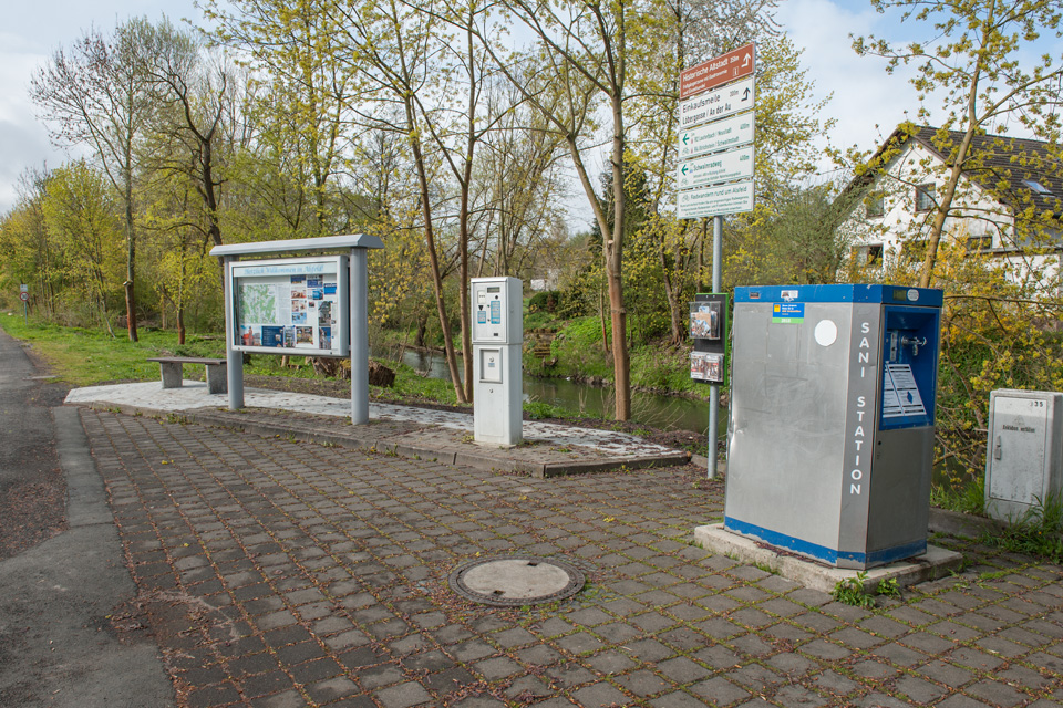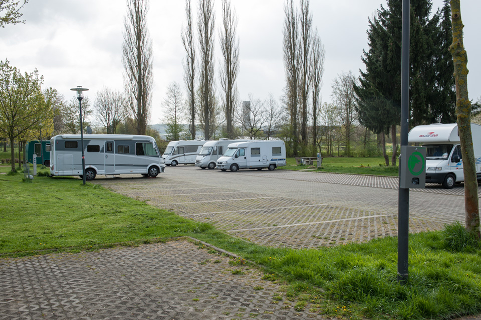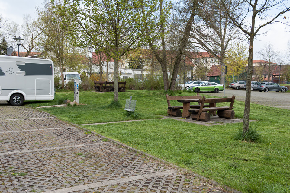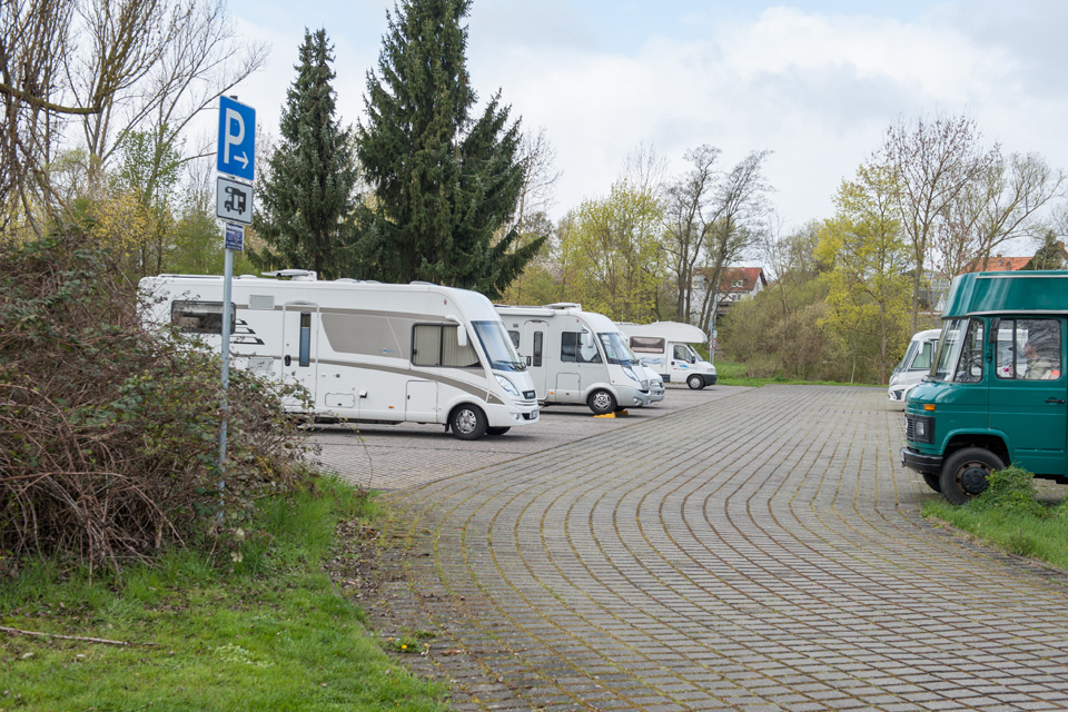- Der Stellplatz bietet großzügige Flächen am Rande eines Pkw-Parkplatzes am Stadtrand mit grüner Umgebung.