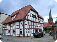 Benedix-Haus am Markt, zählt zu den ältesten Fachwerkhäusern der Insel Rügen, beherbergt seit der Restaurierung im Jahr 2000 das Standesamt und die Touristeninformation.