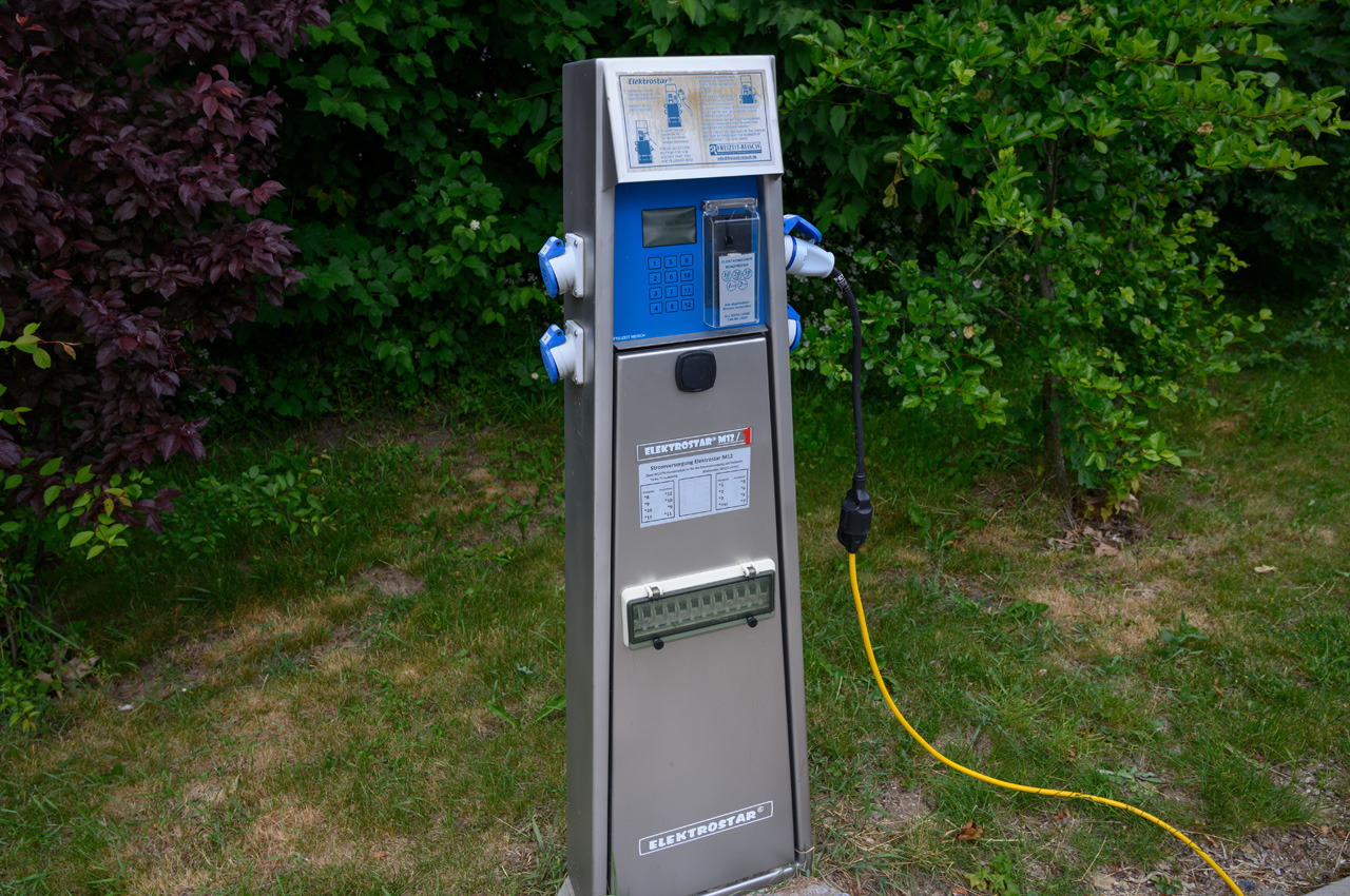 - Die Stromsäulen sind entsprechend verteilt, jede zweite Säule bietet Bezahlmöglichkeit. Bezahlt werden kann mit Münzen ab 0,20€
