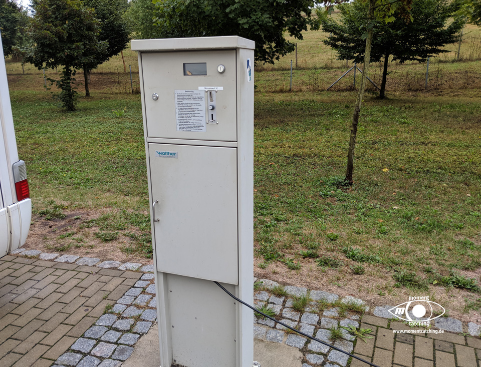 - Die Säulen für die Stromanschlüsse sind für jeweils vier Stellflächen mittig angeordnet. Die Angabe 1,50€/kWh stimmt nicht. Bei Einwurf einer Euromünze wird schon 1kWh angezeigt.