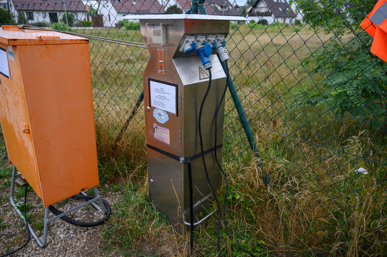 - Strom bezieht man aus der mittig aufgestellten Stromsäule mit CEE-Anschluss und mit 16A Absicherung.