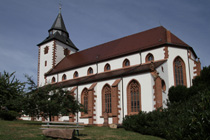 Links im Chorraum ist das Sakramentshäuschen angebracht, das vom Bildersturm der Reformation verschont blieb. Es zeigt auf der Turmspitze einen Pelikan, der seine Jungen mit seinem Blut nährt. Dieses Symbol verweist auf die Selbstaufopferung Christi, an dem die Gläubigen durch das Abendmahl teilhaben können. An der linken Wand ist die Grabplatte von Wilhelm IV. von Eberstein und der Gräfin Johanna von Hanau angebracht. Der achtseitige Taufstein stammt aus dem Jahr 1716 und hat 1960 einen Kupferdeckel erhalten.