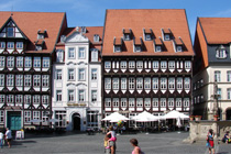 Der Marktplatz wurde nach dem Alten Markt und dem Andreasplatz erst relativ spät zum Handels- und Lebenszentrum der Stadt. Dort stellten sich in der Frühen Neuzeit Bürgerschaft und Gilden in repräsentativen Bauten dar. Als einzige von diesen Gebäuden überstanden das Rathaus und das Tempelhaus den verheerenden Bombenhagel im März 1945, wenn auch erheblich beschädigt. Weitgehend unbeschädigt blieb nur der als Rolandbrunnen bekannte Marktbrunnen.