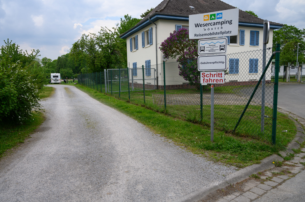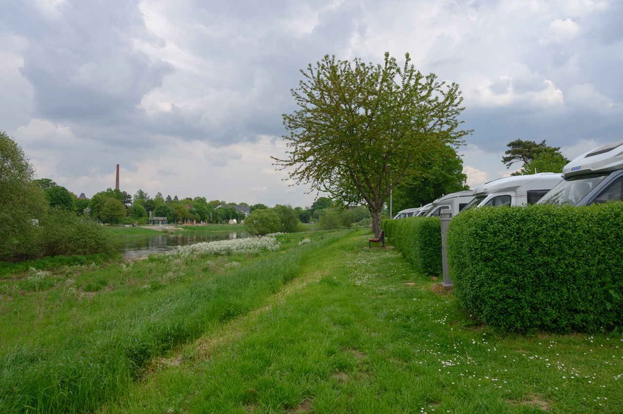 - Der Stellplatz liegt auf der Ostseite der Weser, also auf der anderen Seite als die Innenstadt von Höxter. Die Stellflächen sind abgegrenzt und großzügig bemessen. Teilweise sind sie durch Hecken angetrennt.