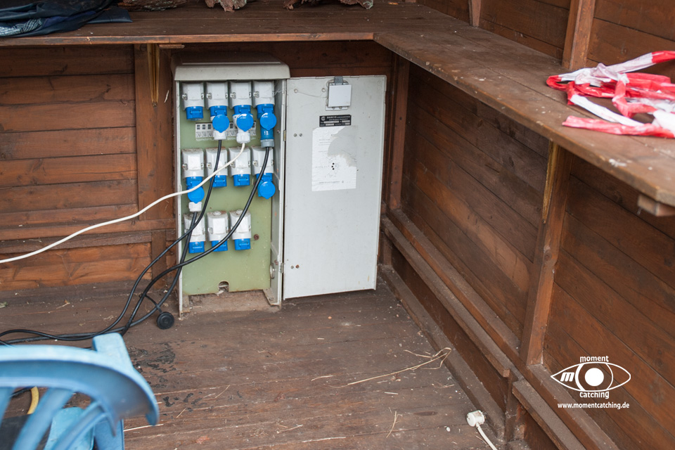 - Die Steckdosen (Cee) befinden sich in einer kleinen Holzhütte.