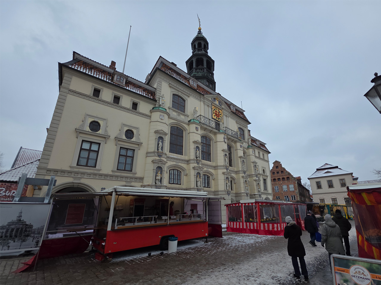 Wir sind gegen 16_15 Uhr aufgebrochen. Susanne wollte eine Fielmannfiliale aufsuchen, um sich die Bügel an ihrer Brille wieder lockern zu lassen. In der großen Bäckerstraße haben wir dann kurz vor dem Marktplatz auch die Fielmannfiliale gefunden. Jetzt hat Susanne wieder eine fast neue Brille. In der großen Bäckerstraße befindet sich auch die historische Raths Apotheke. Ein sehr sehenswertes Gebäude. Wir sind erst über den Weihnachtsmarkt am Stint Markt gelaufen. Dort haben wir an einer Wurtsbraterei eine leckere Bratwurst verspeist. Die waren geschmacklich sehr gut und auch sehr gut gegrillt. Vom Stint Markt ging es wieder zurück zu dem Weihnachtsmarkt auf dem Marktplatz vor dem Rathaus. Auf dem Balkon des Rathauses blies jemand auf der Trompete Weihnachtslieder. Das war recht schön mal wieder auf dem Weihnachtsmarkt auch Weihnachtsmusik zu hören. Durch das Gerangel mit der Gema ist es sehr still geworden. Die Gema hat die Gebühren so drastisch erhöht, dass die Schausteller das nicht mehr bezahlen wollen. Riecht auch ein bisschen nach Boykott. An der Getränkebude direkt vor dem Rathaus habe ich noch einen Eierpunsch getrunken. Der ist hier besonders lecker. Susanne hat ein wenig an der Sahne mitgenuckelt. Danach sind wir zurückgeschlendert mit einem Umweg übers EDEKA. Die Stadt fasziniert uns immer wieder und wir waren sicher nicht das letzte Mal hier.